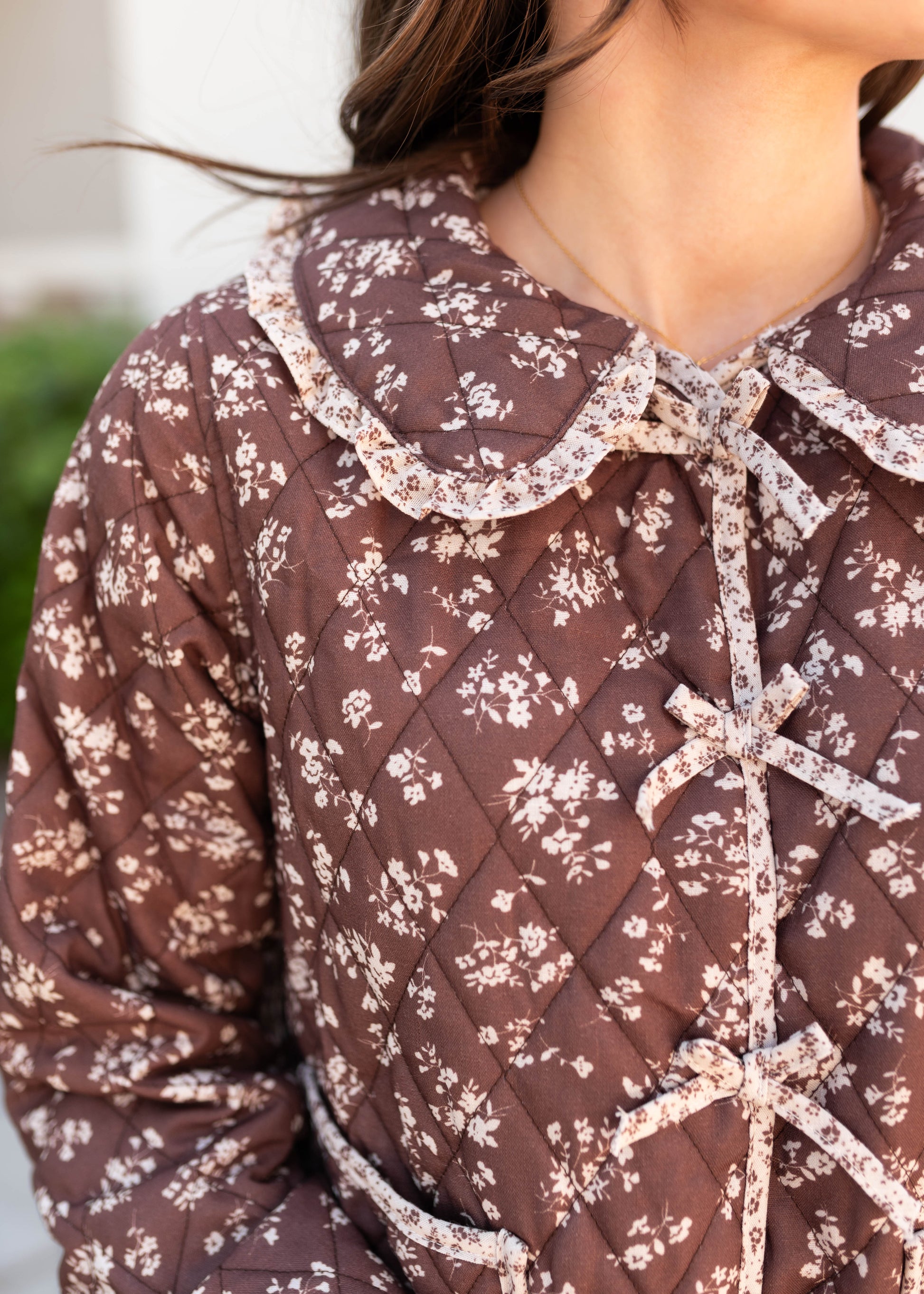 The Aida Brown Floral Jacket is sweet, lightweight, and full of charming details! With its ruffle collar, faux bows, and functional snap buttons, it¡¯s the perfect layer for adding a little extra flair. Front pockets and soft quilted fabric make it as practical as it is pretty.