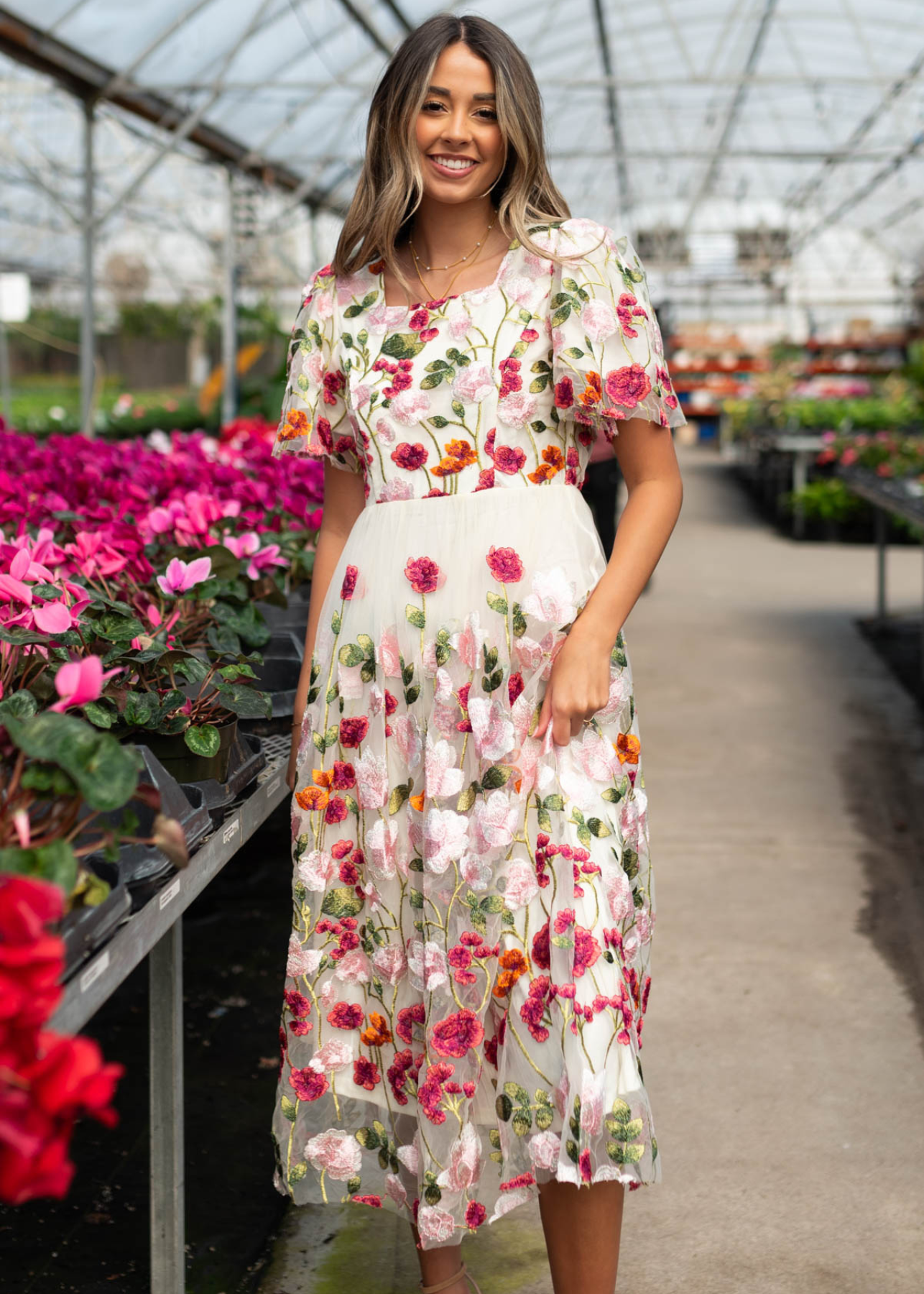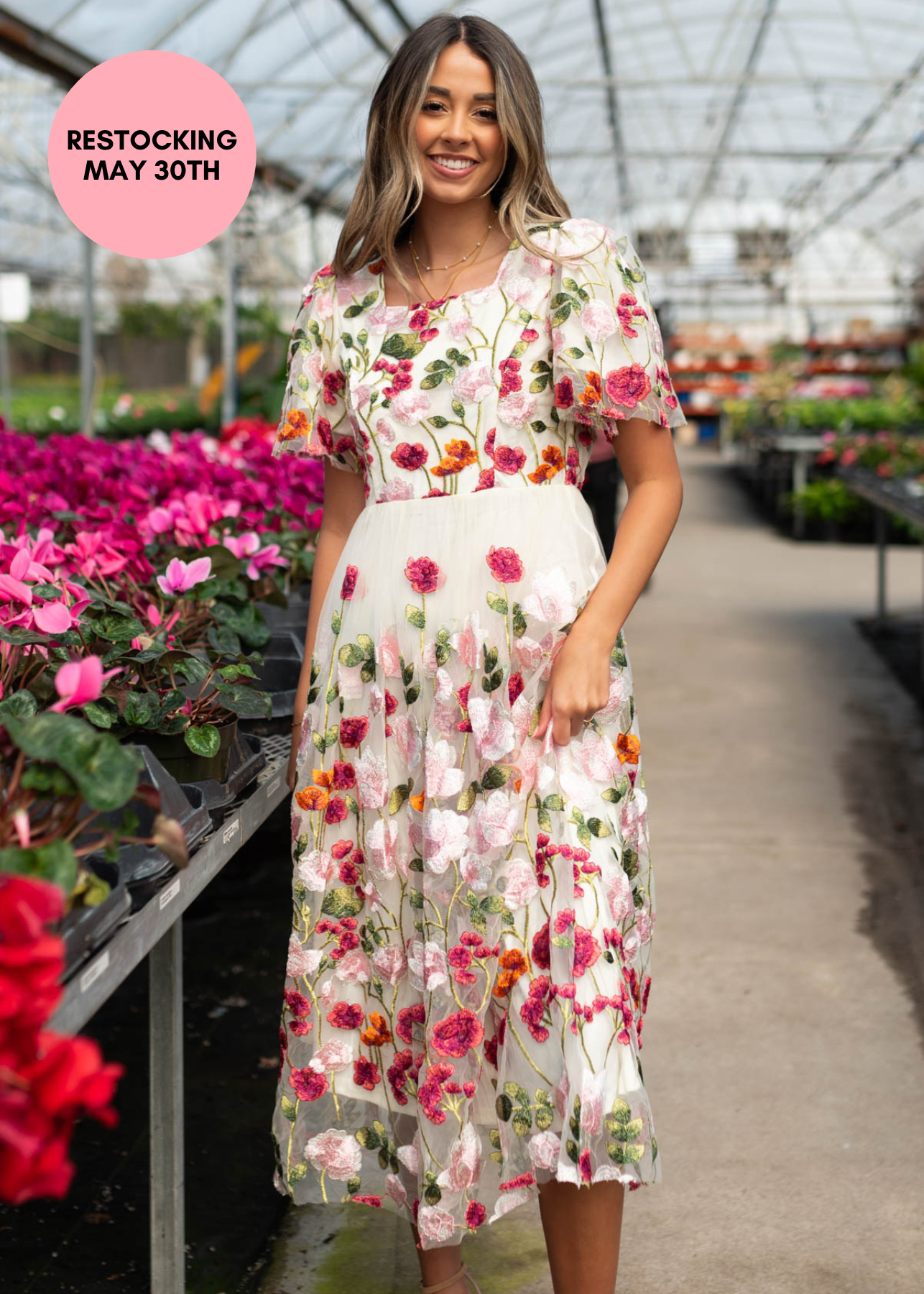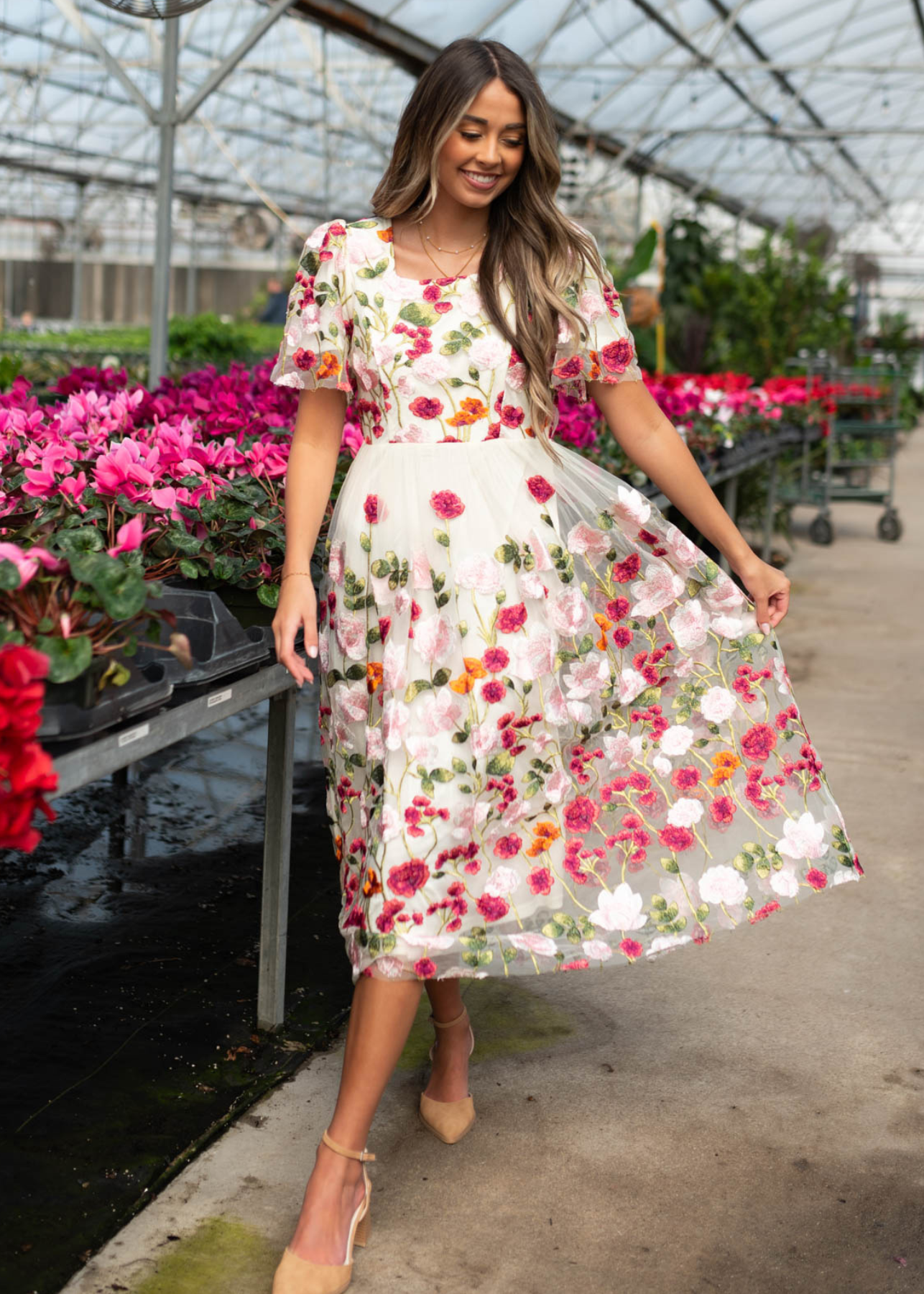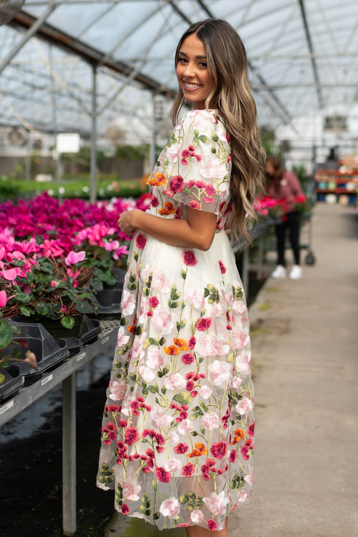 - INCREDIBLE vibrant floral embroidered mesh overlay across the whole dress. Super high quality