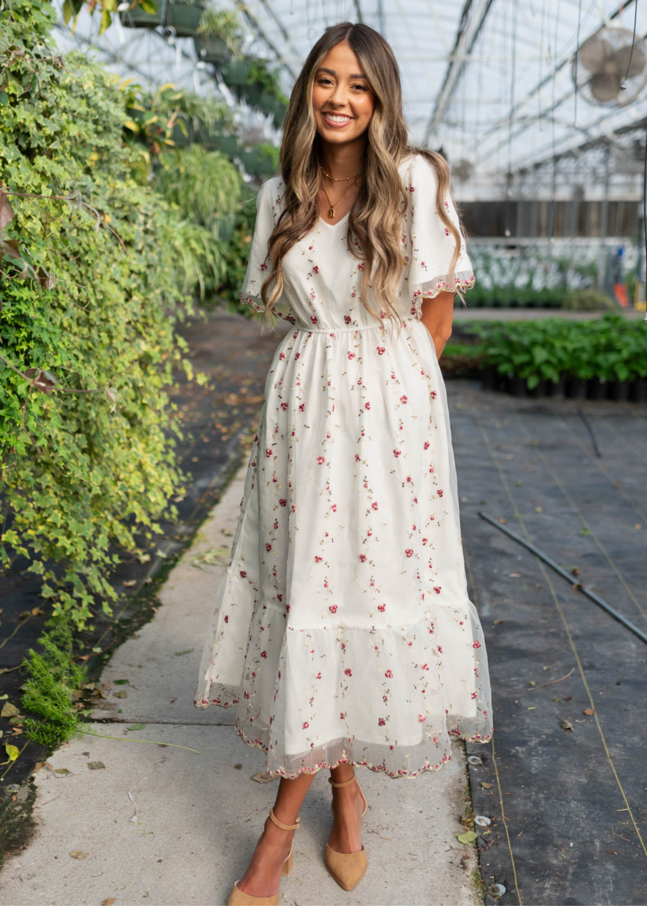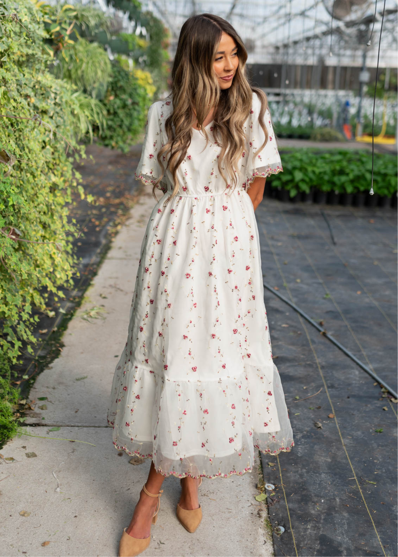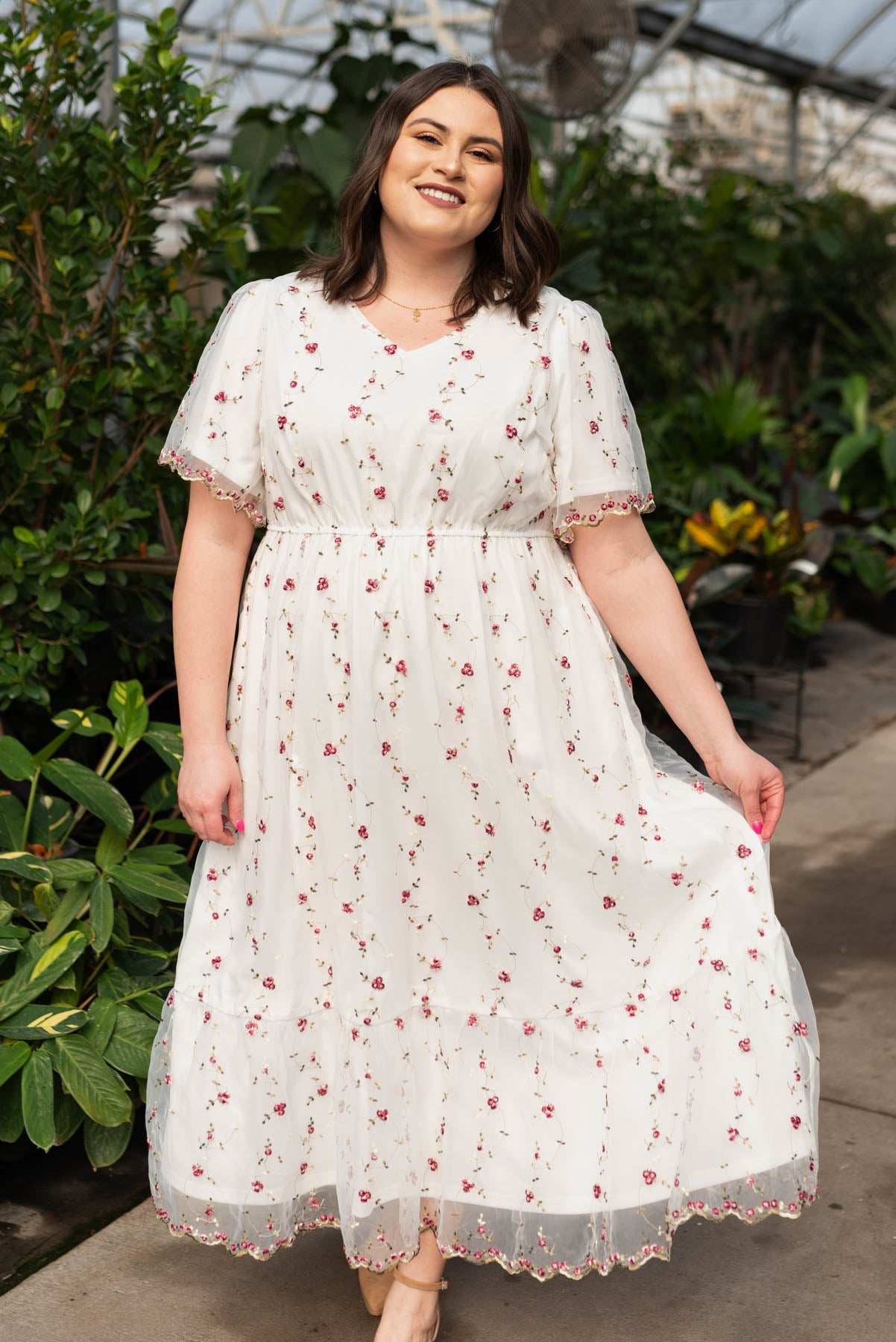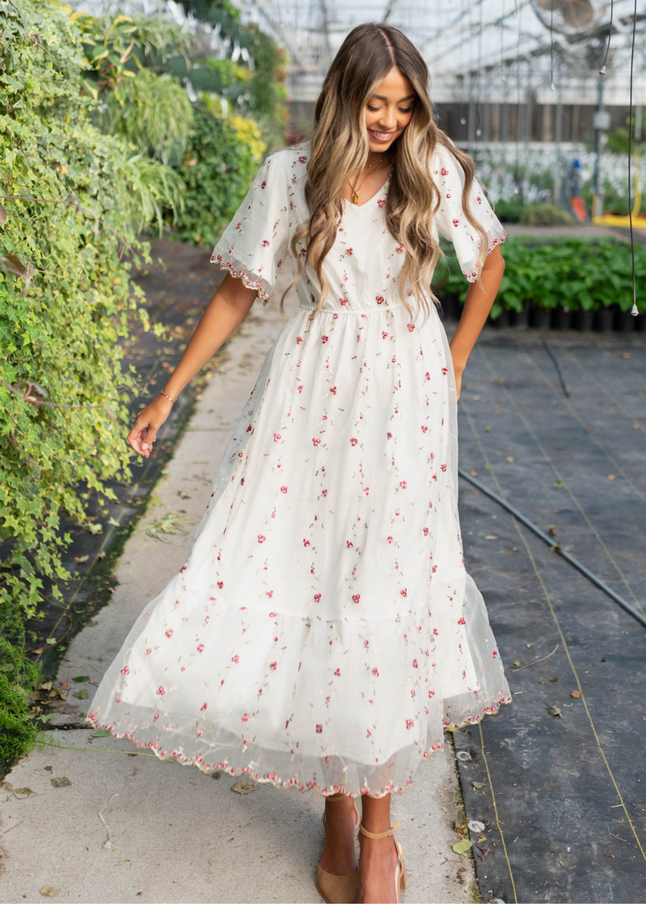 - Amazing embroidered floral mesh overlay that covers the whole dress