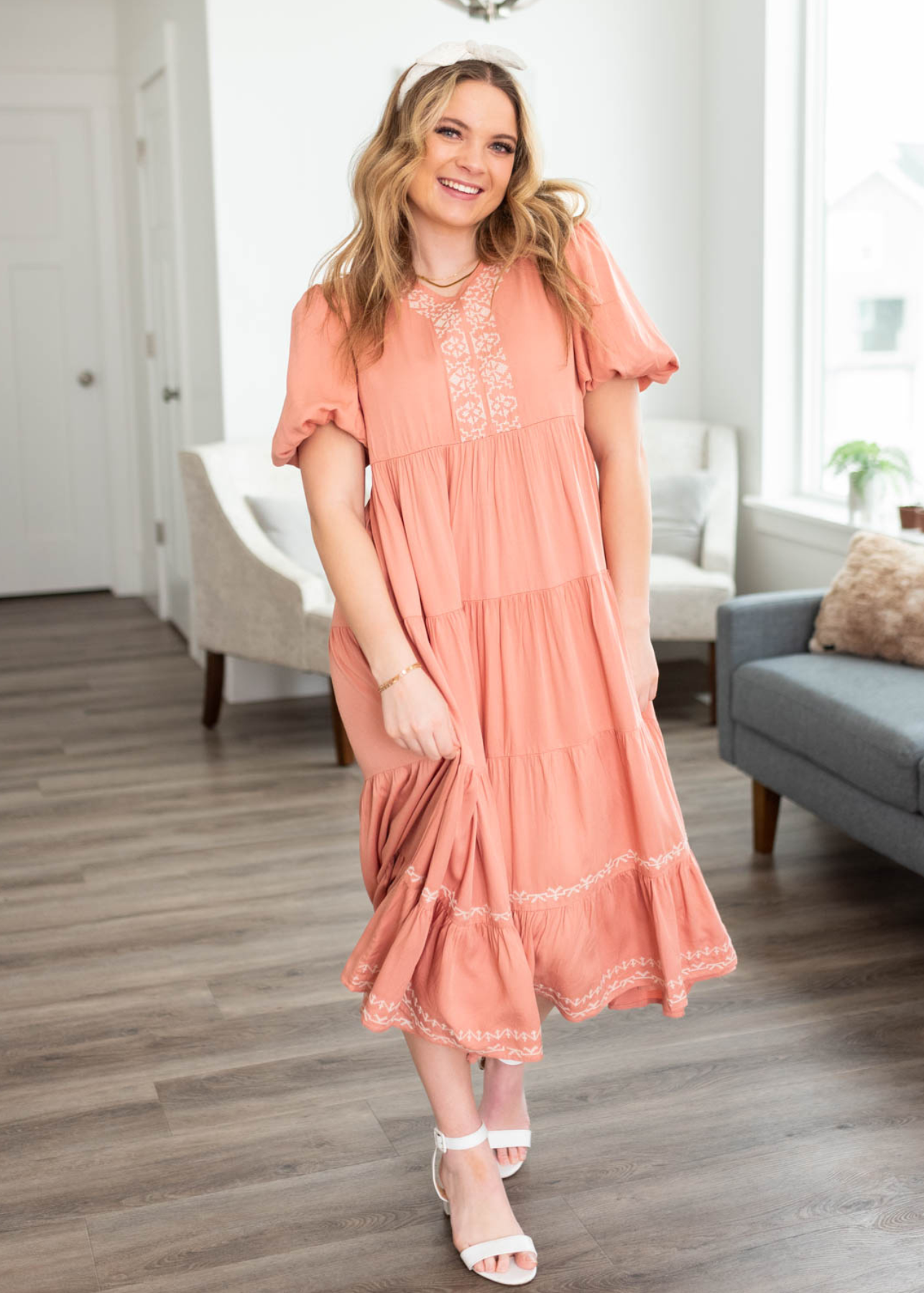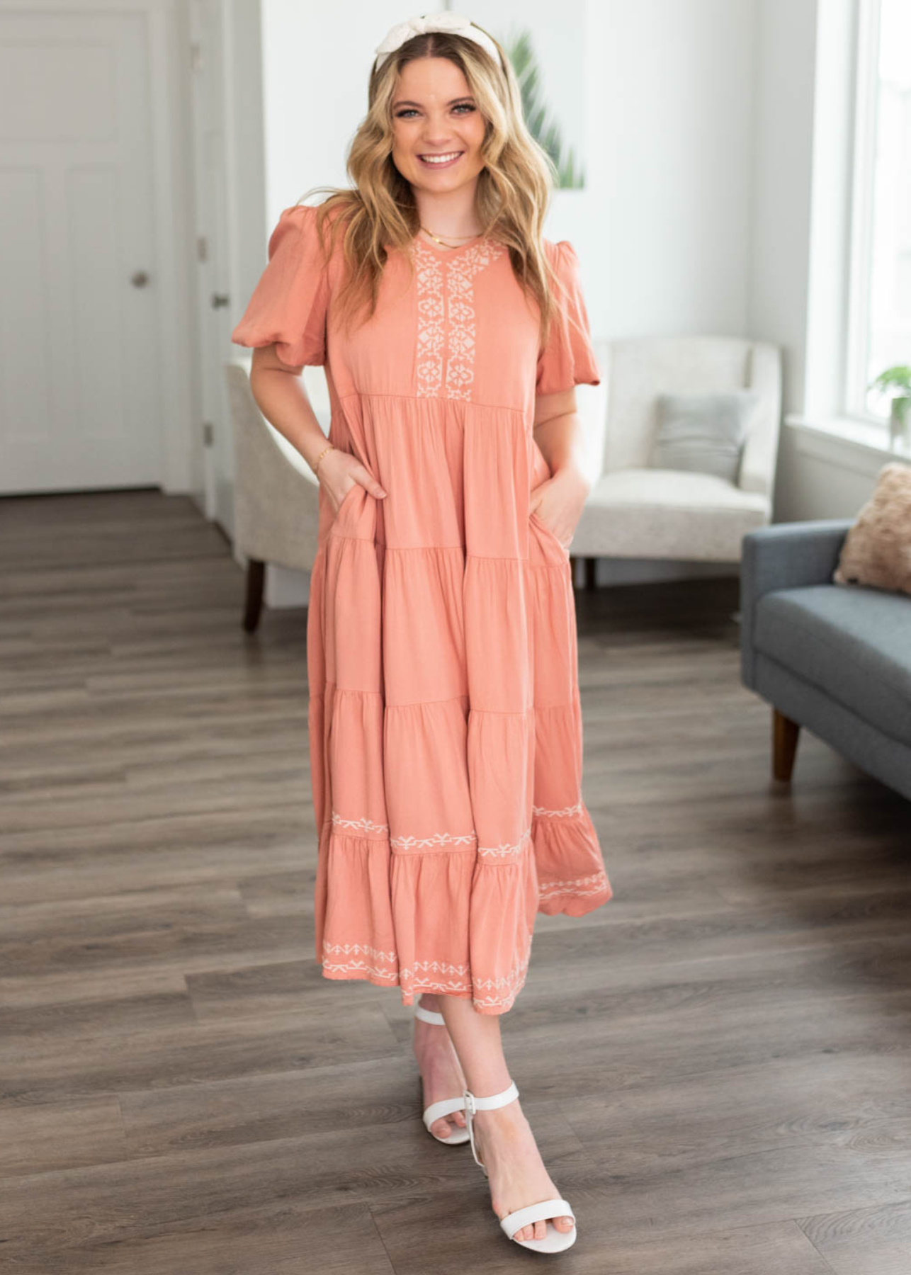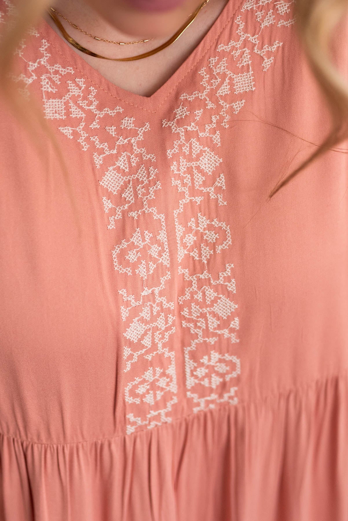 - Geometric embroidery along the neckline and bottom tiers of the skirt