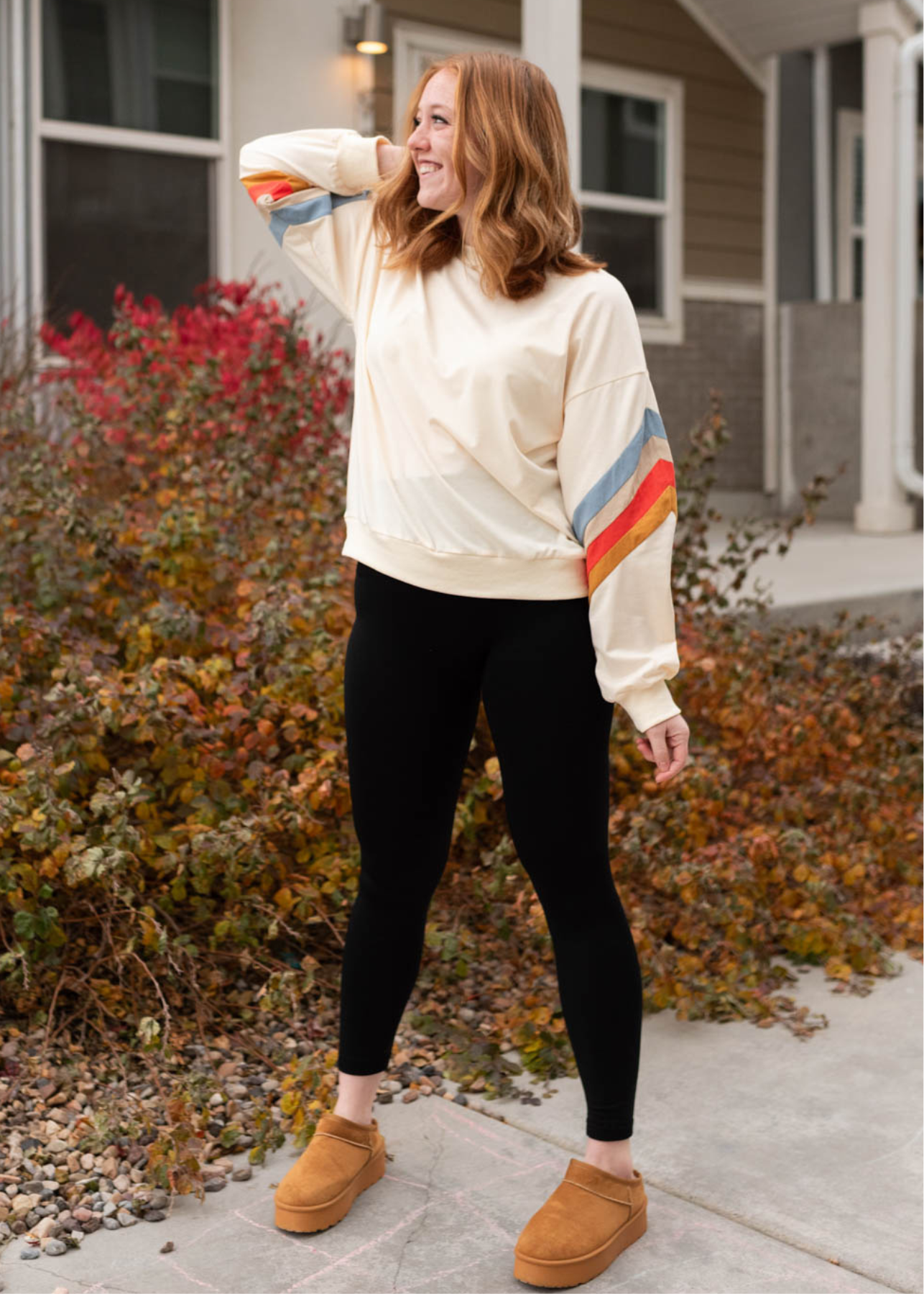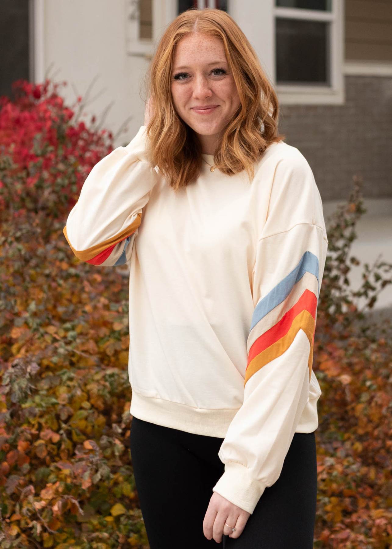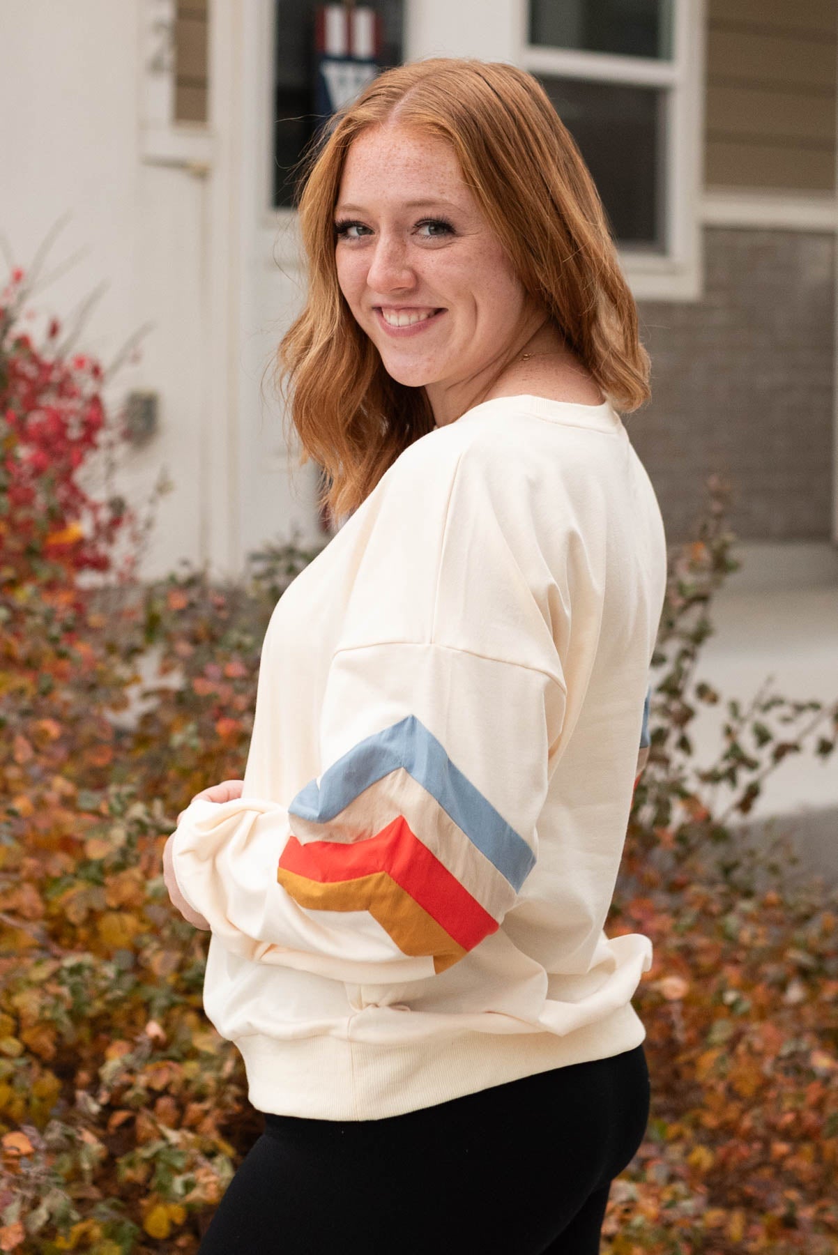 - Cream base + multi color retro stripes on sleeves