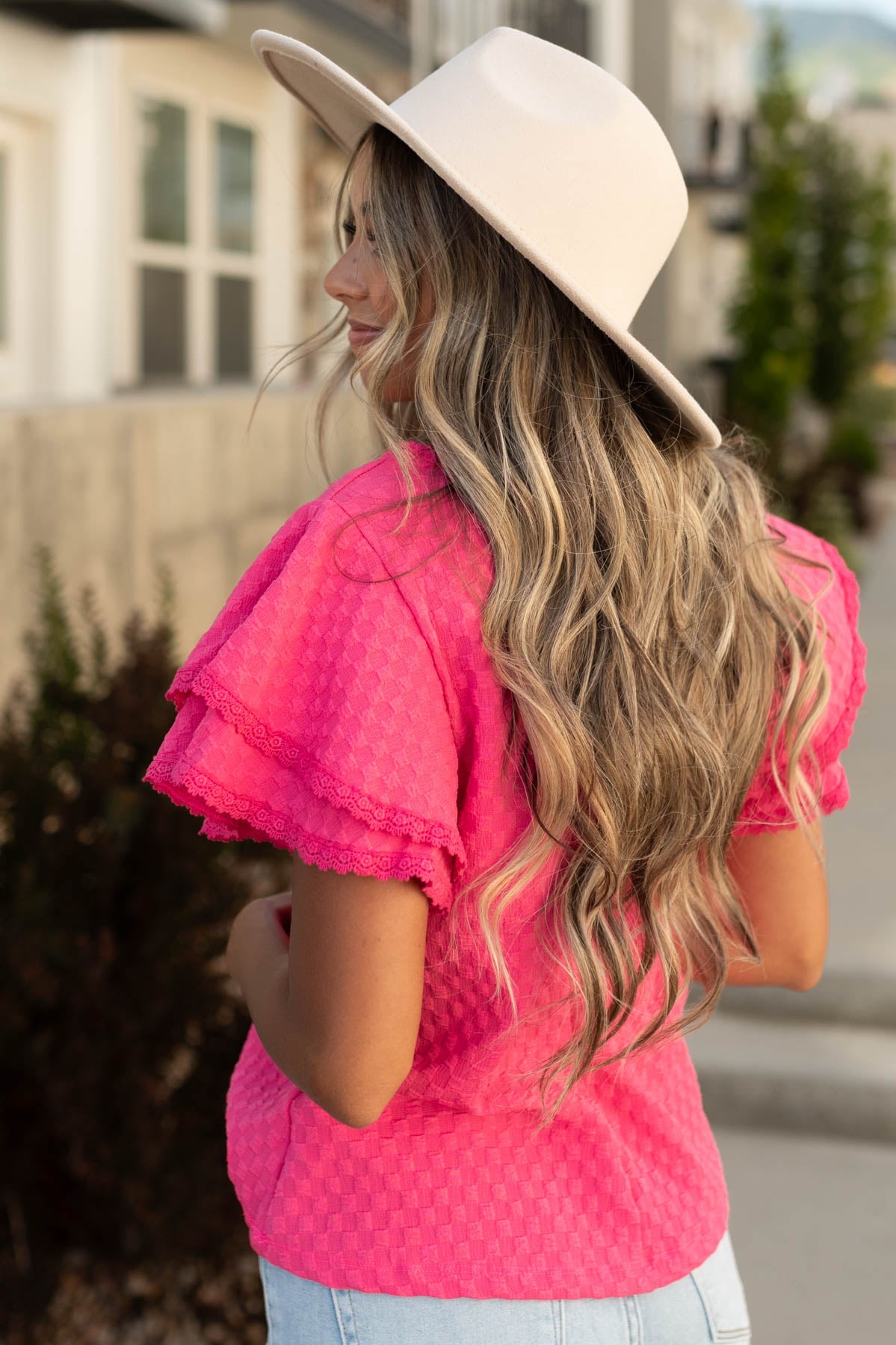 - Double ruffle sleeves with lace trim