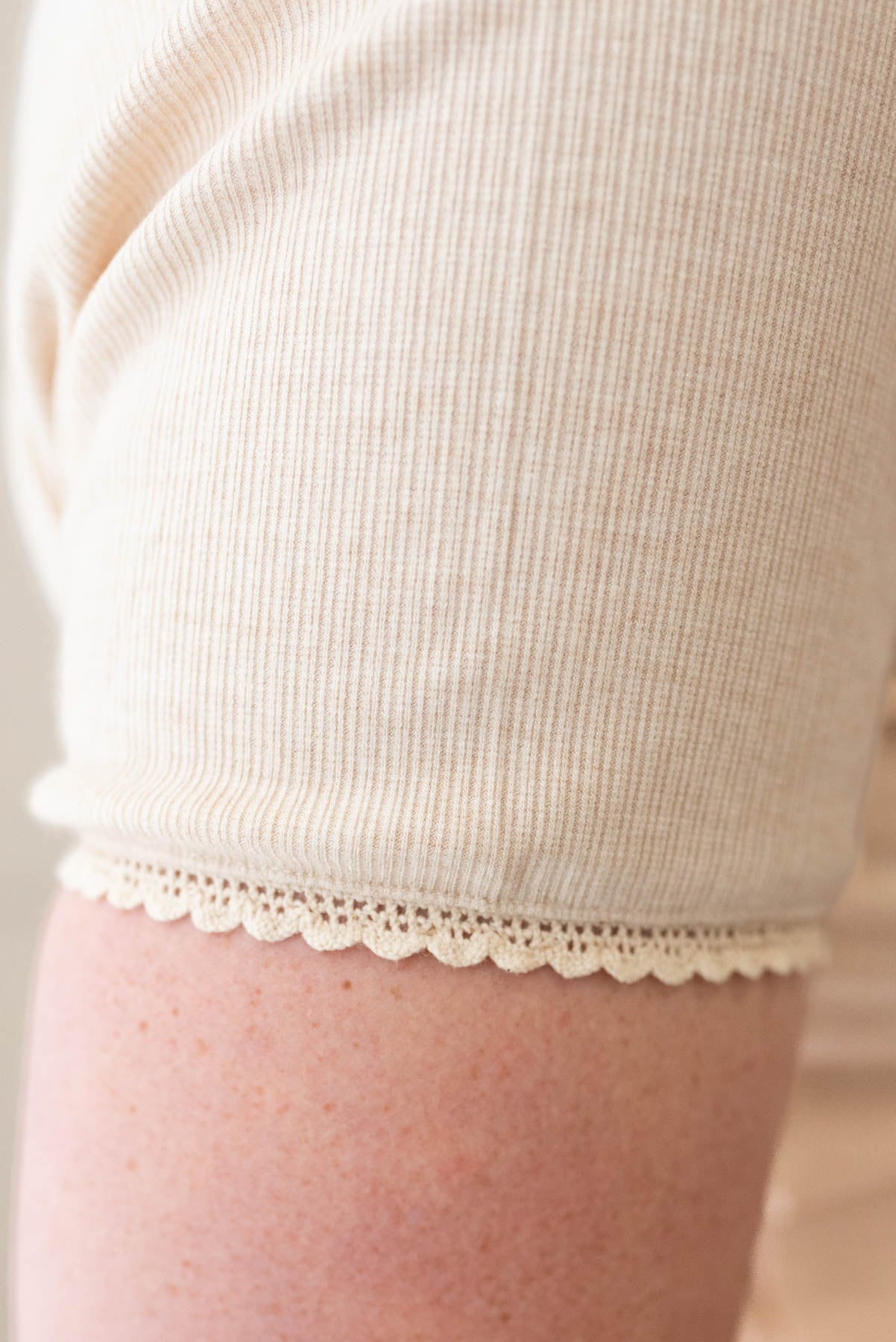 - Delicate lace trim on the sleeves adds a feminine, refined touch to the design