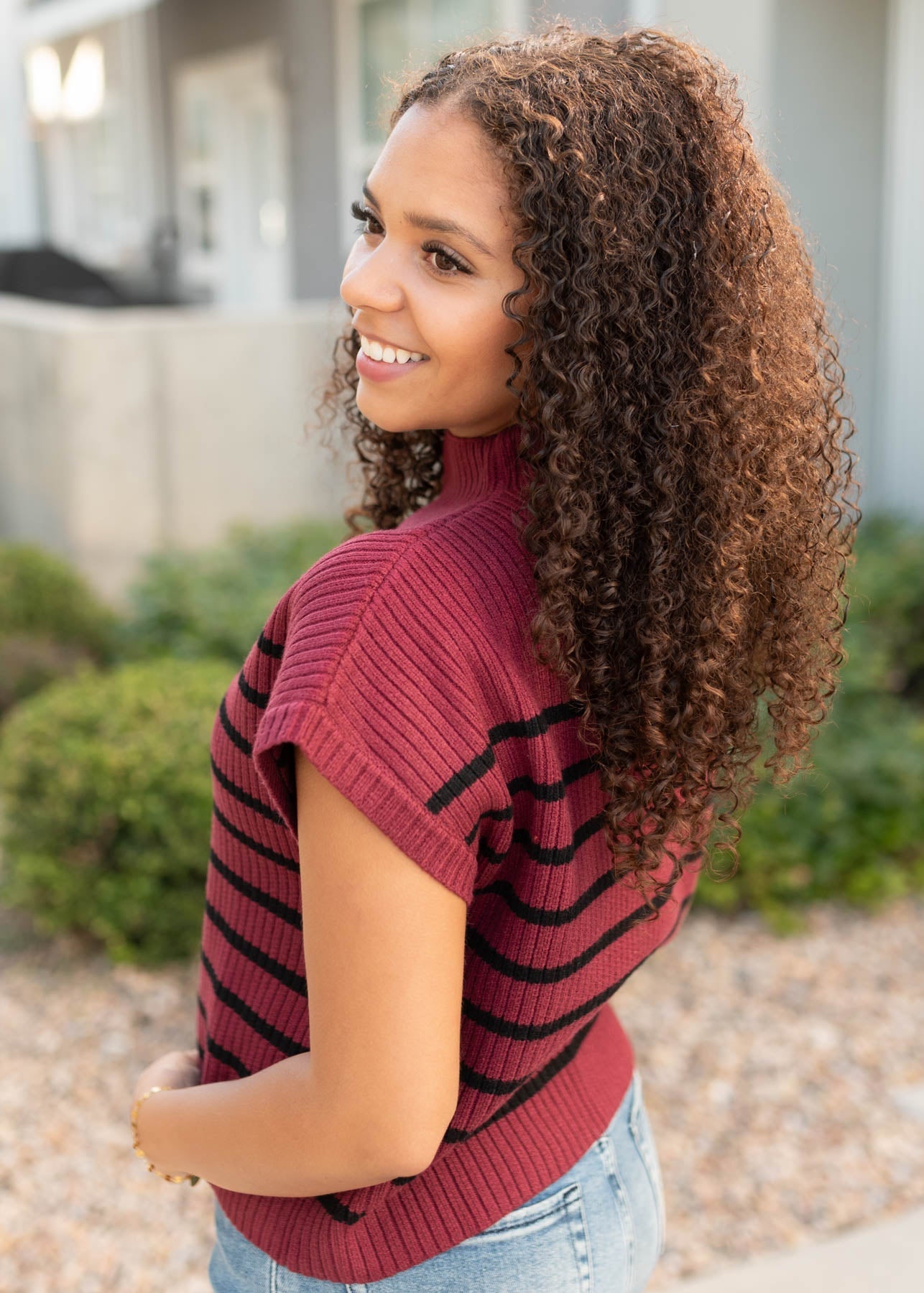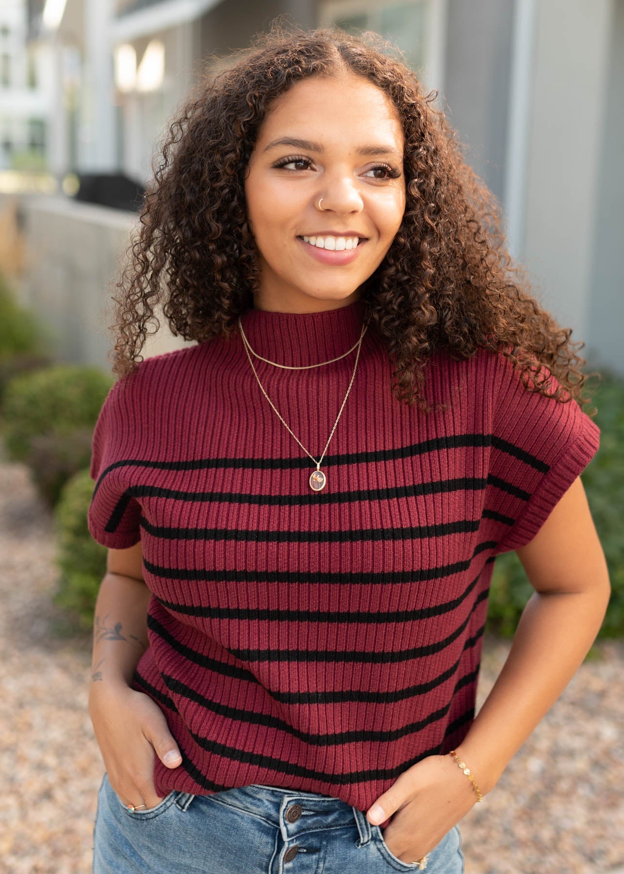 The Claire Burgundy Sweater is the kind of piece that makes getting dressed a breeze¡ªstretchy, comfy, and effortlessly cute. With its rich burgundy hue, cozy ribbed texture, and timeless stripes, it¡¯s a sweater you¡¯ll reach for on repeat.