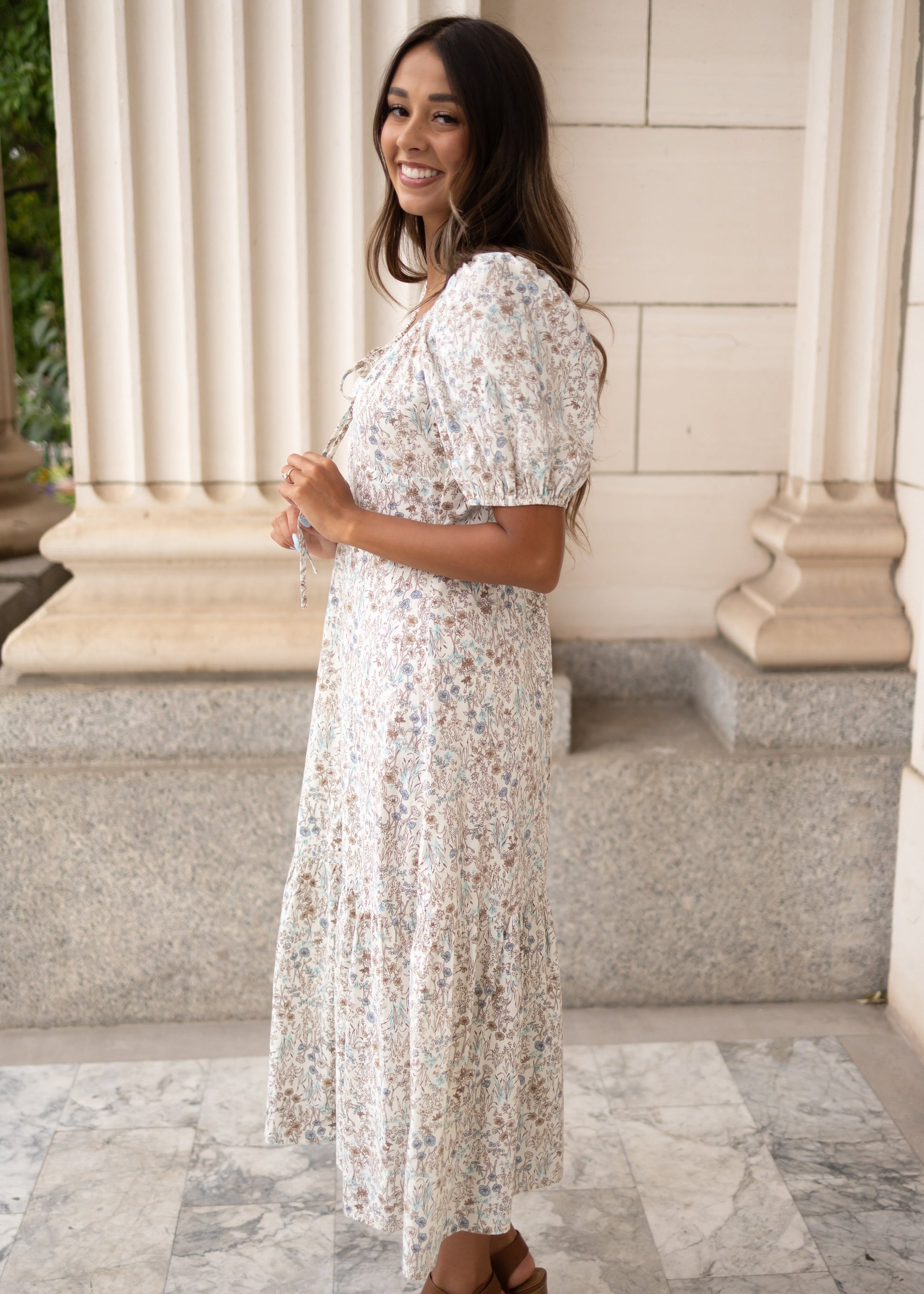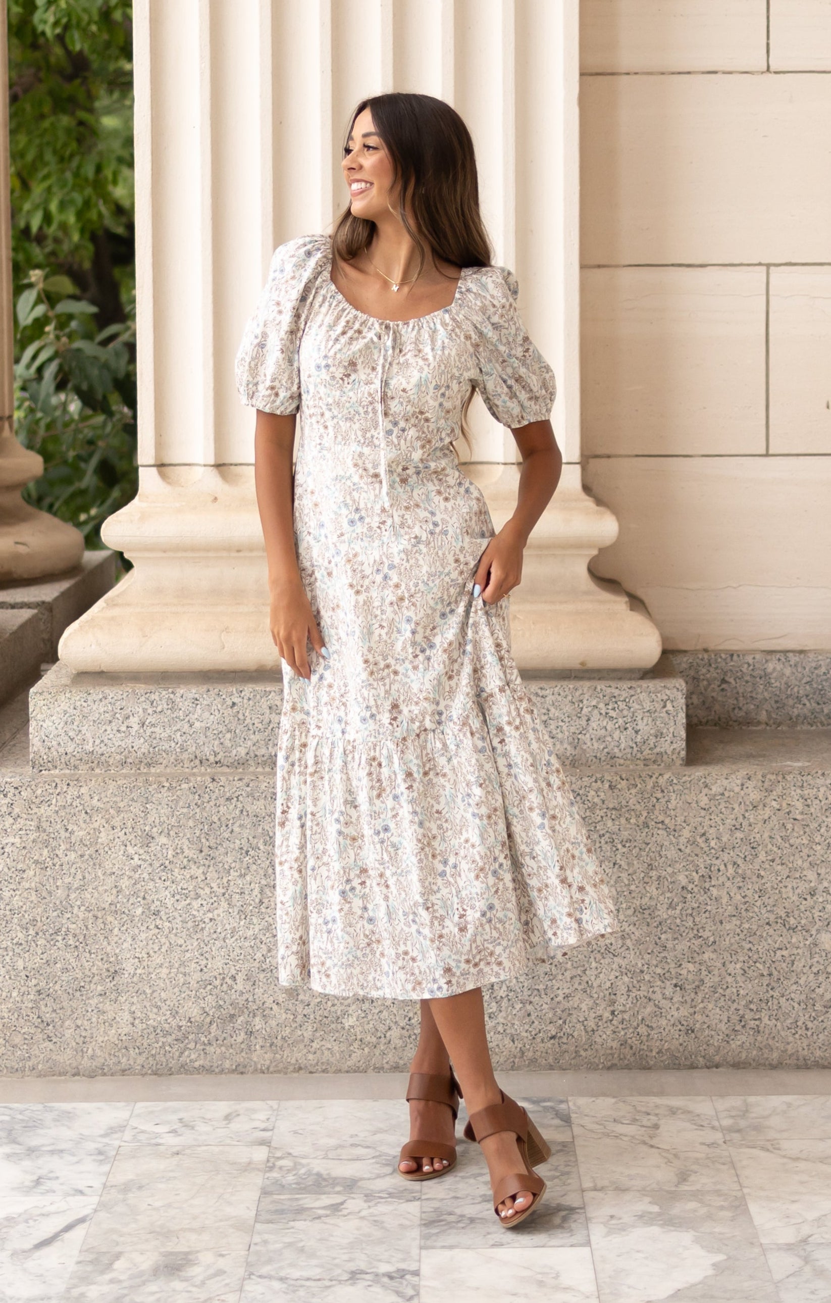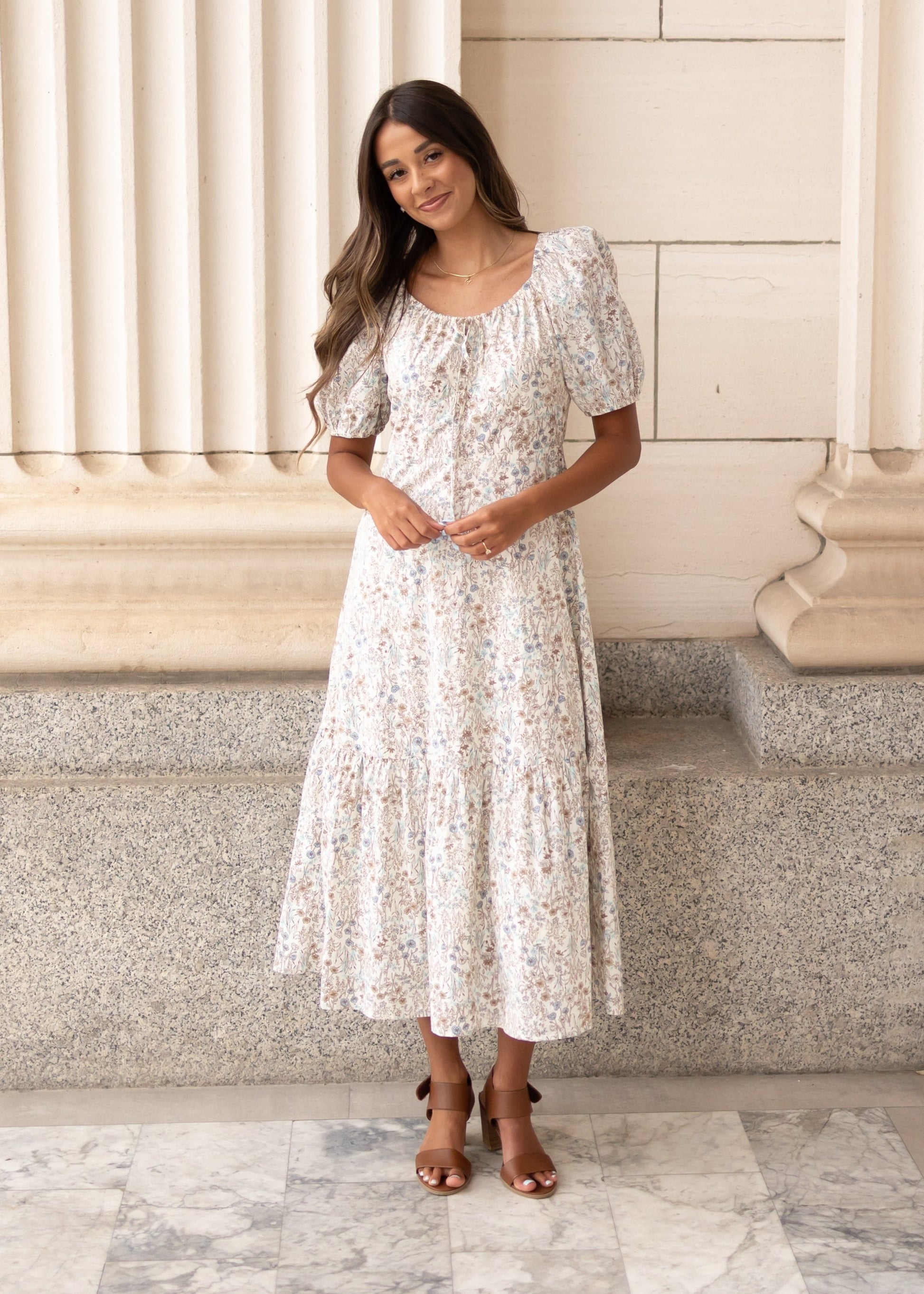 Soft, feminine, and full of charm¡ªthe Cleo Cream Floral Dress is all about pretty details and easy comfort. With a tie neckline you can adjust to your liking, puff sleeves, and a lovely brown and light blue floral print, Cleo is one of those dresses that just feels special. A Lena Layne exclusive you won¡¯t find anywhere else!