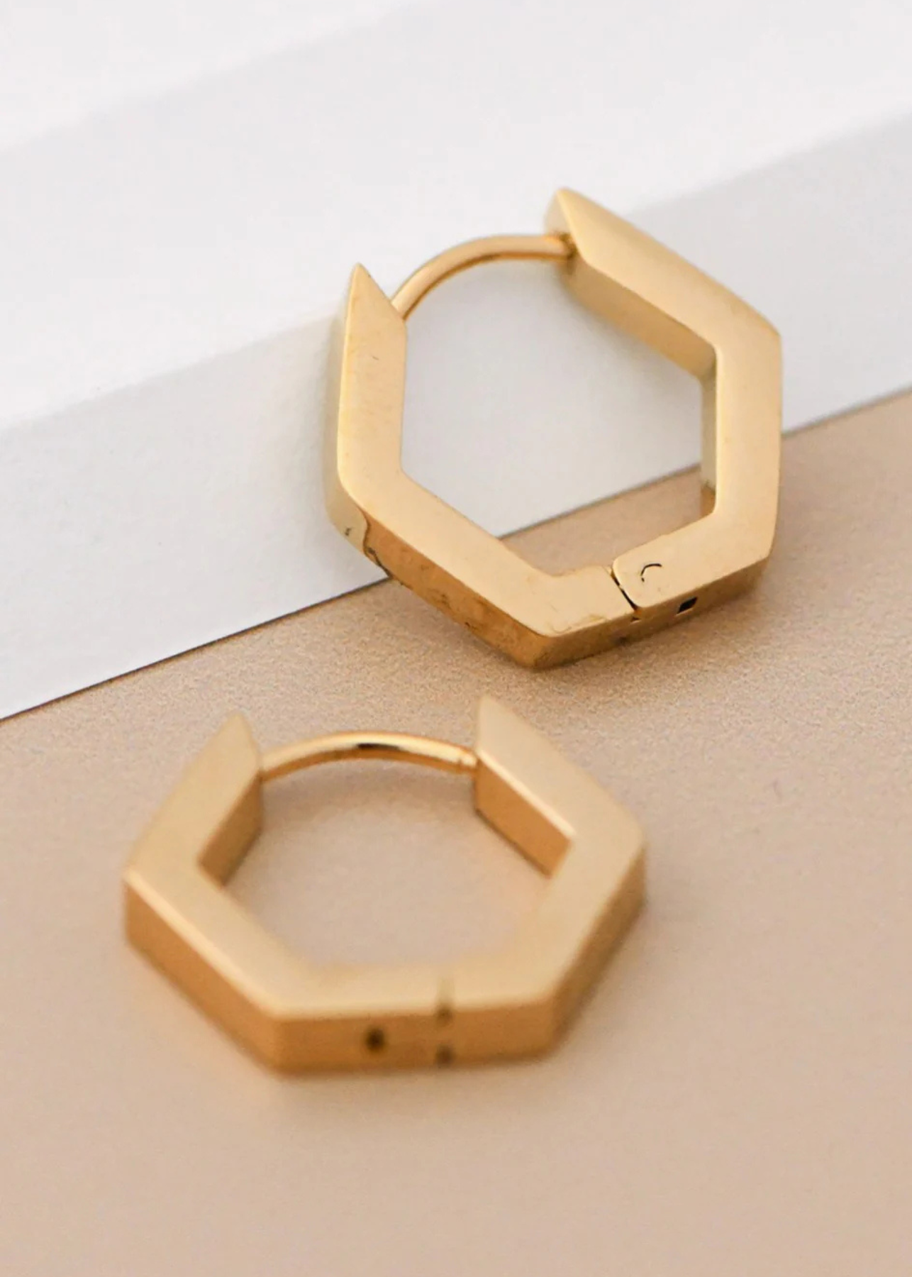- Gold Plated Non-Tarnish Stainless Steel Small Polygon Carabiner Hoop Earrings.
