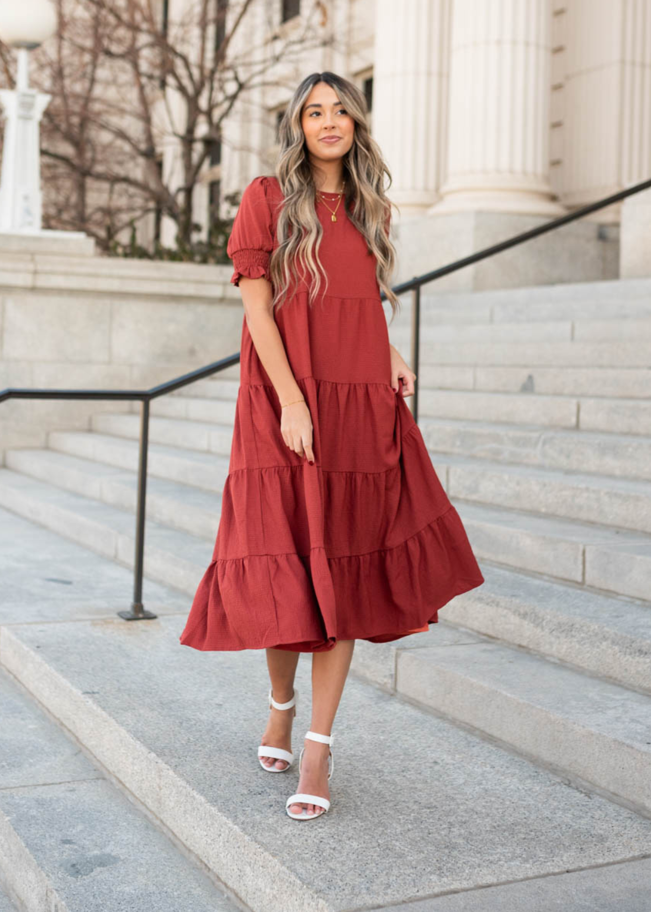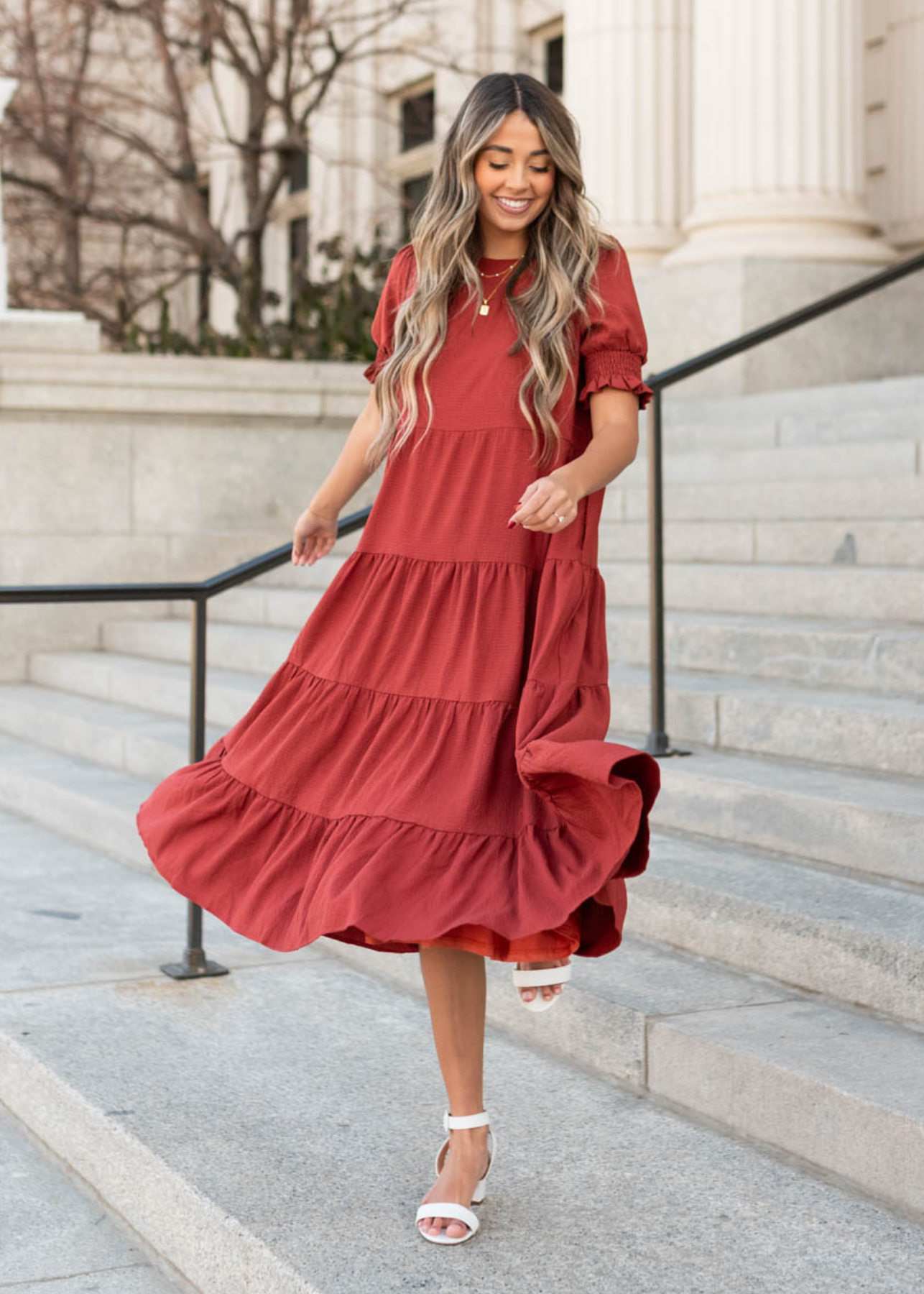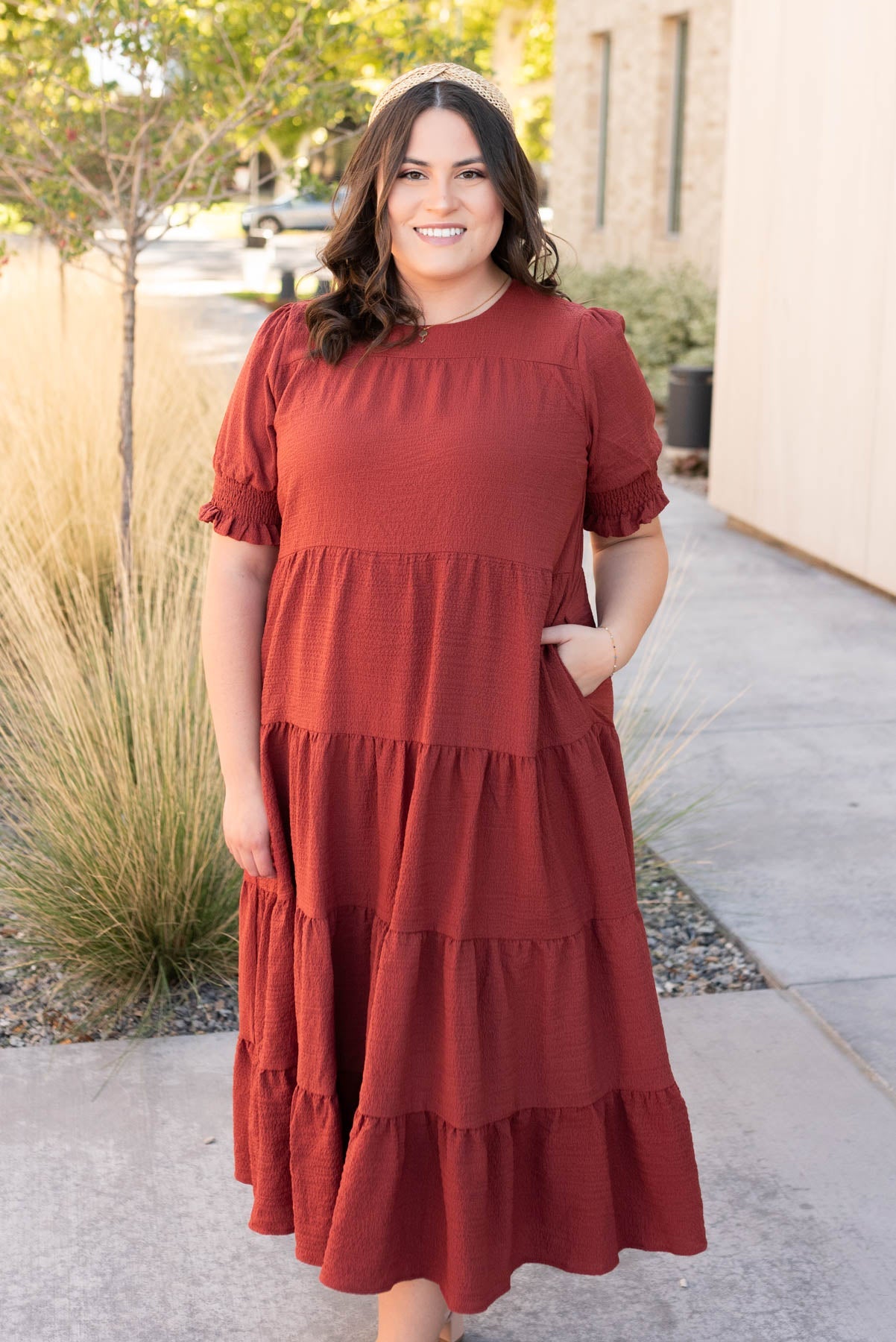 The Janessa Tiered Rust Dress is the definition of effortless beauty! With its flowy, tiered silhouette and soft textured fabric, this dress drapes beautifully while keeping you comfortable. The ruffle sleeve detail and functional pockets add just the right touch of playful charm. Finished with our Lena Layne exclusive built-in slipette, she¡¯s as easy to wear as she is stunning.