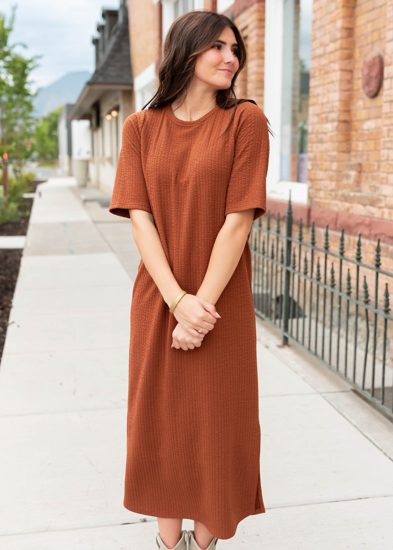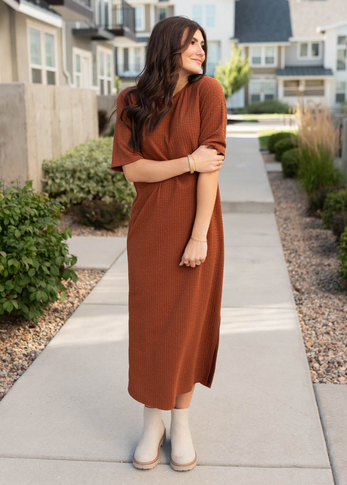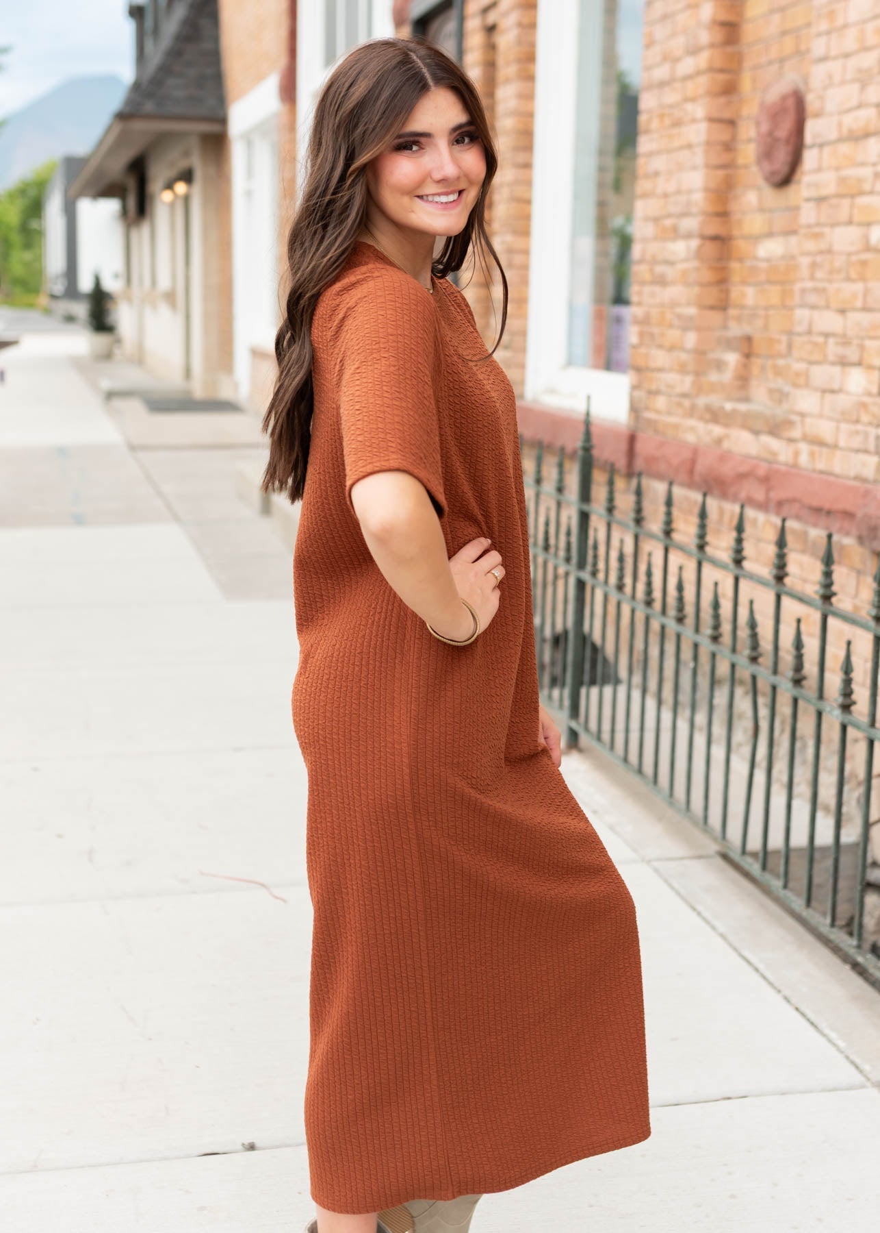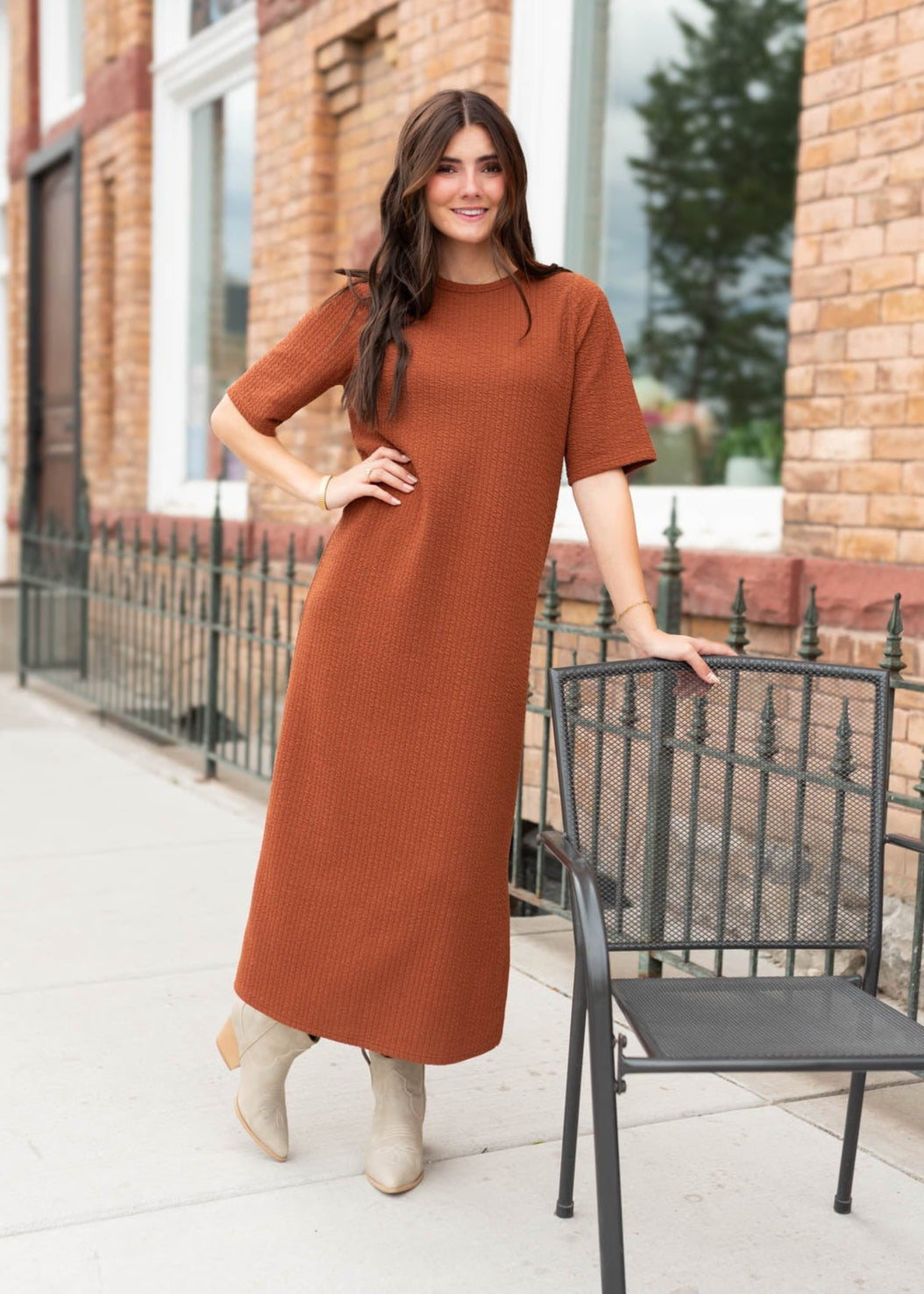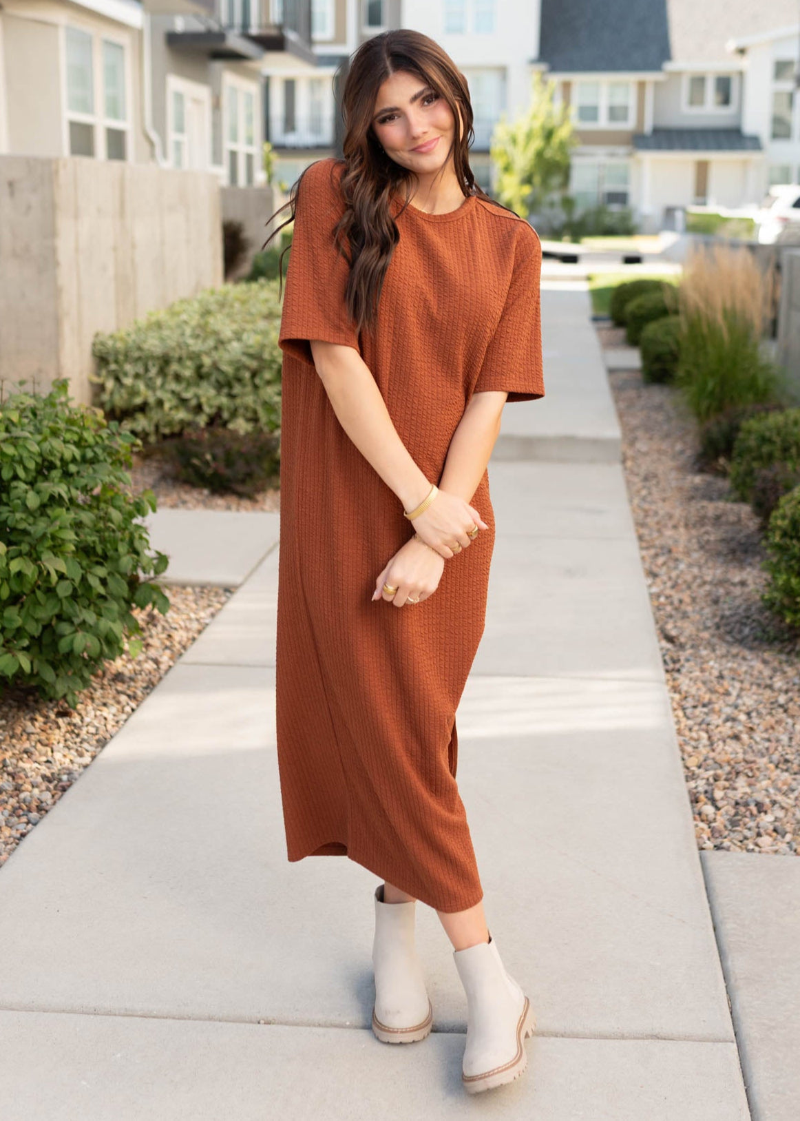 Say hello to your new go-to maxi T-shirt dress! The Jennifer Rust Dress is soft, stretchy, and effortlessly flattering with a relaxed boxy fit. Side slit on the left side adds movement without showing too much, and the dreamy ribbed fabric makes it feel as cozy as it looks. A Lena Layne exclusive, this maxi is truly one-of-a-kind¡ªyou won¡¯t find it anywhere else!