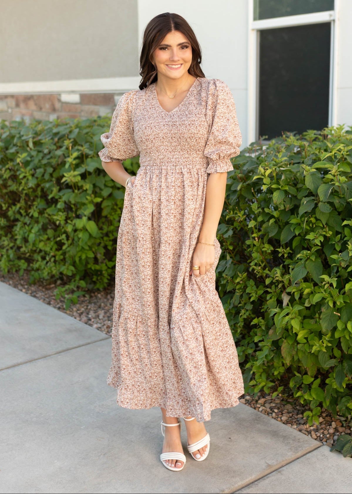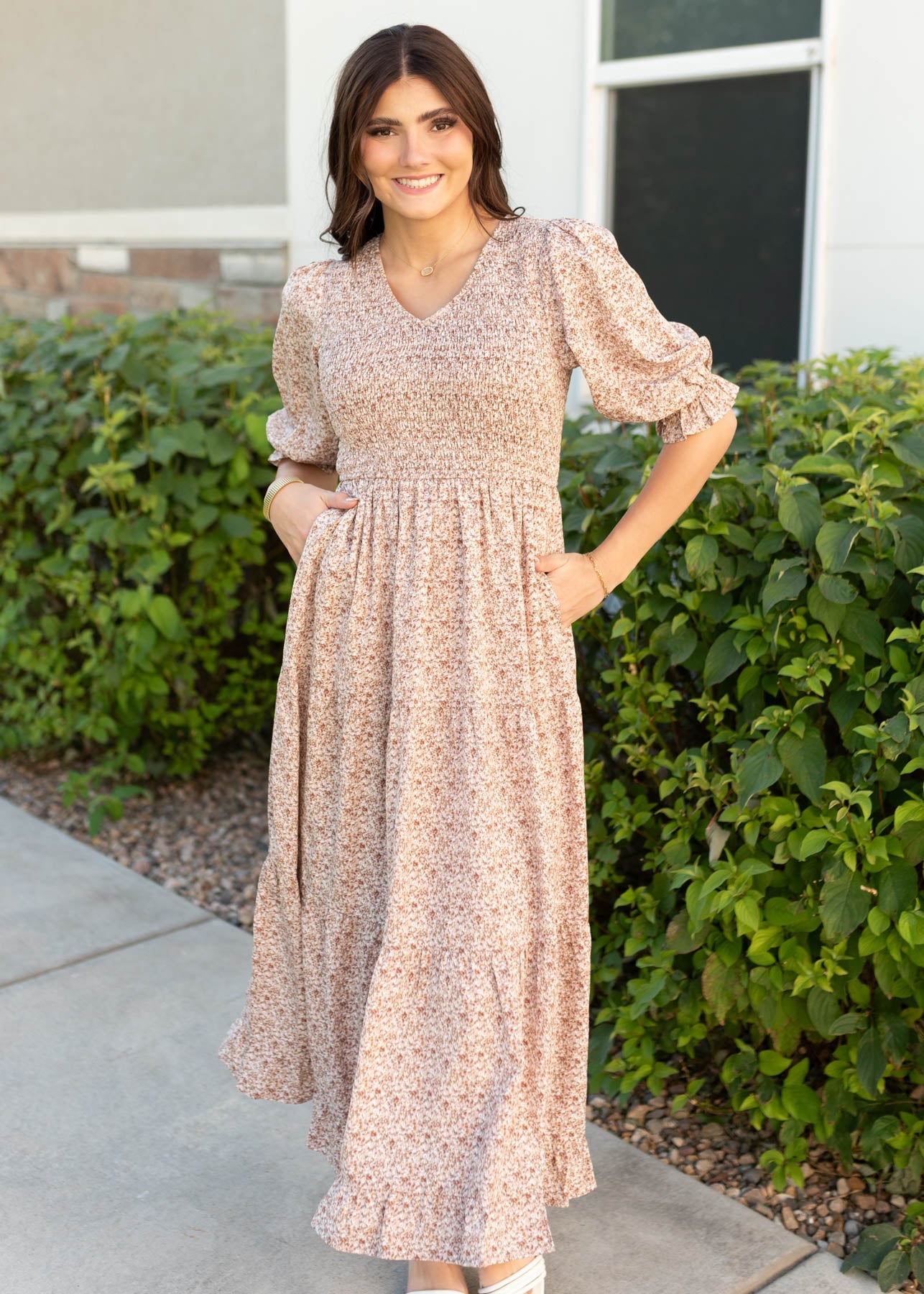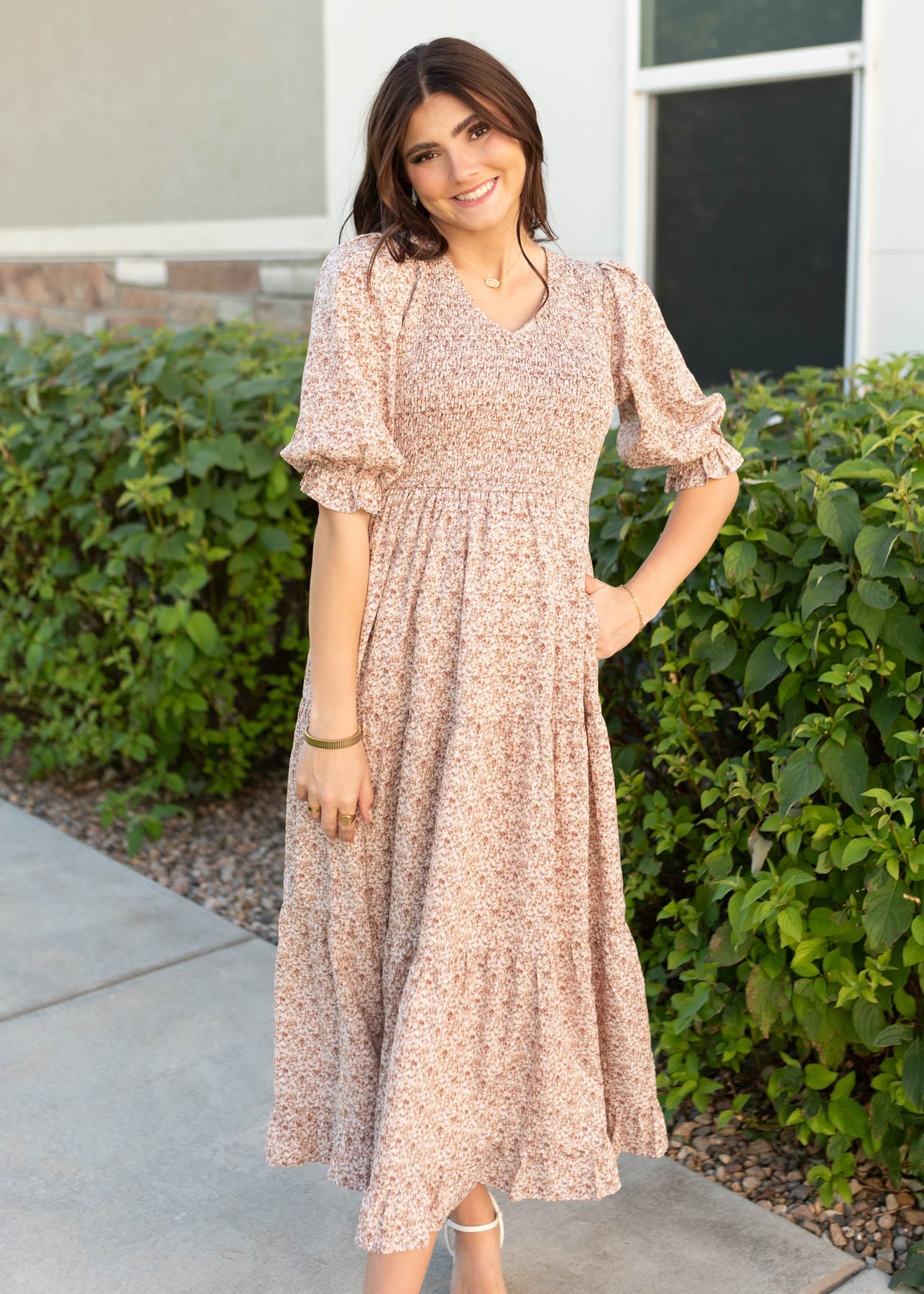 The Julia Dusty Mauve Floral Dress is all about effortless style and comfort! With a stretchy smocked bodice, elastic sleeves, and a lined, flowy tiered skirt, it¡¯s designed for ease and coverage. The gentle V-neckline and stunning mauve floral print make it a pretty, feminine favorite you¡¯ll reach for again and again.
