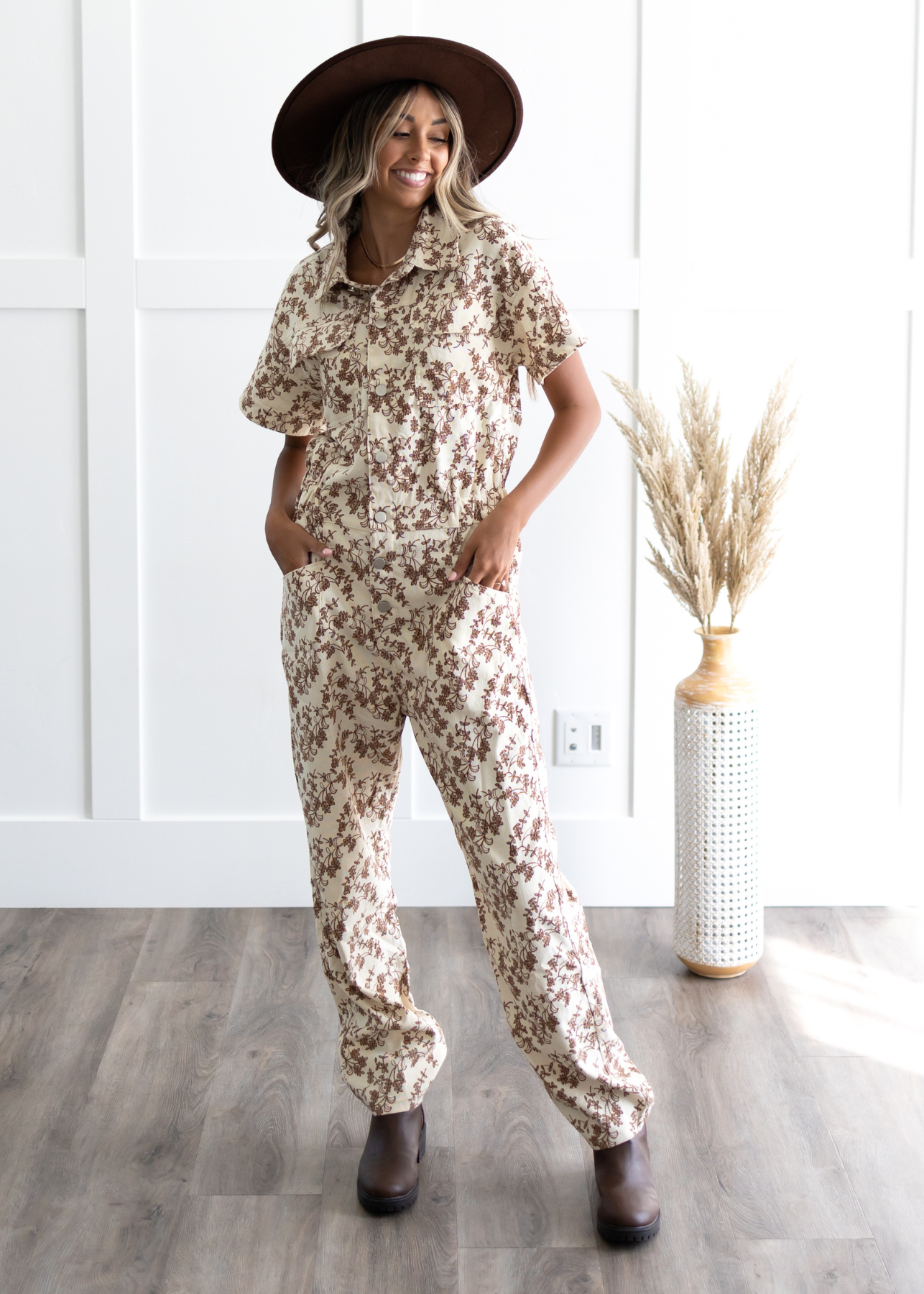 -?Honestly, the cutest jumpsuit we've ever seen! Can't get enough of the cream & rust floral print