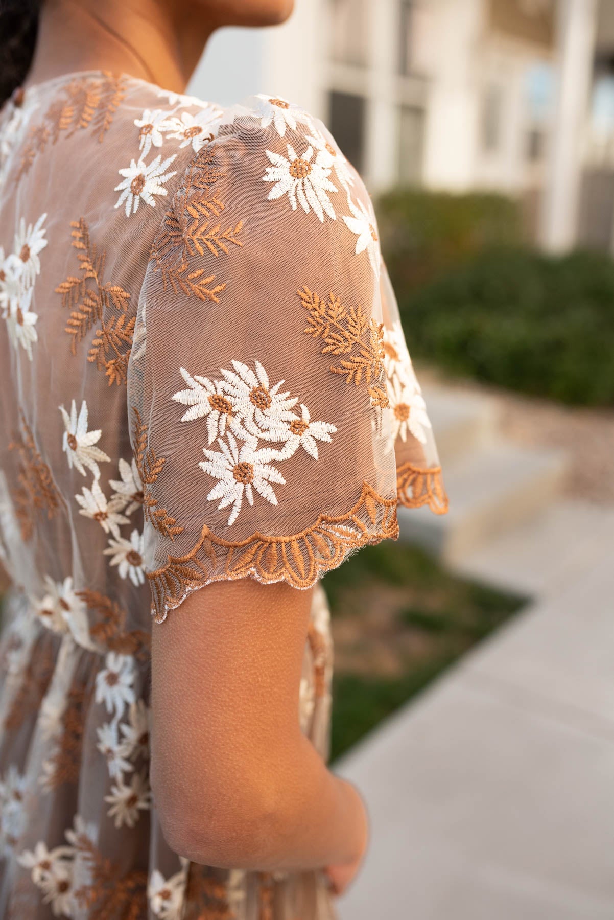 - Incredible white and golden-brown embroidered floral overlay