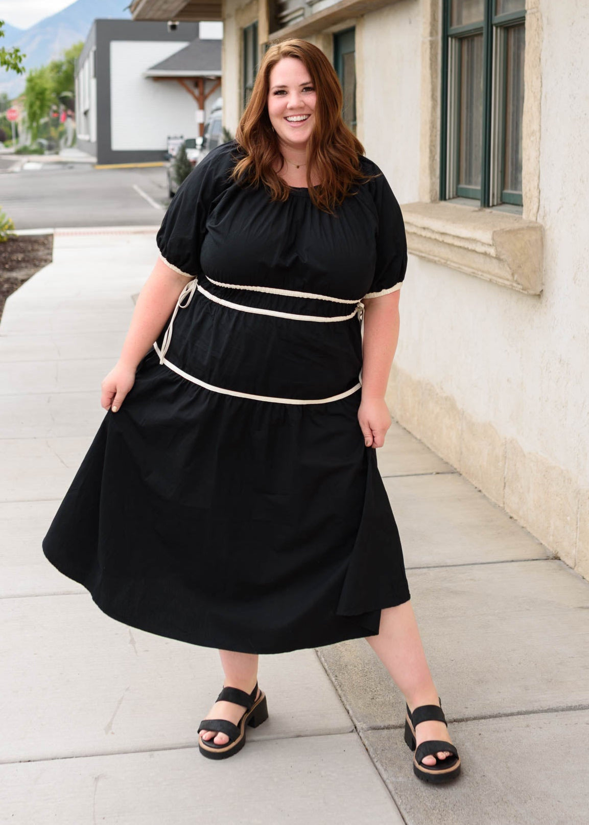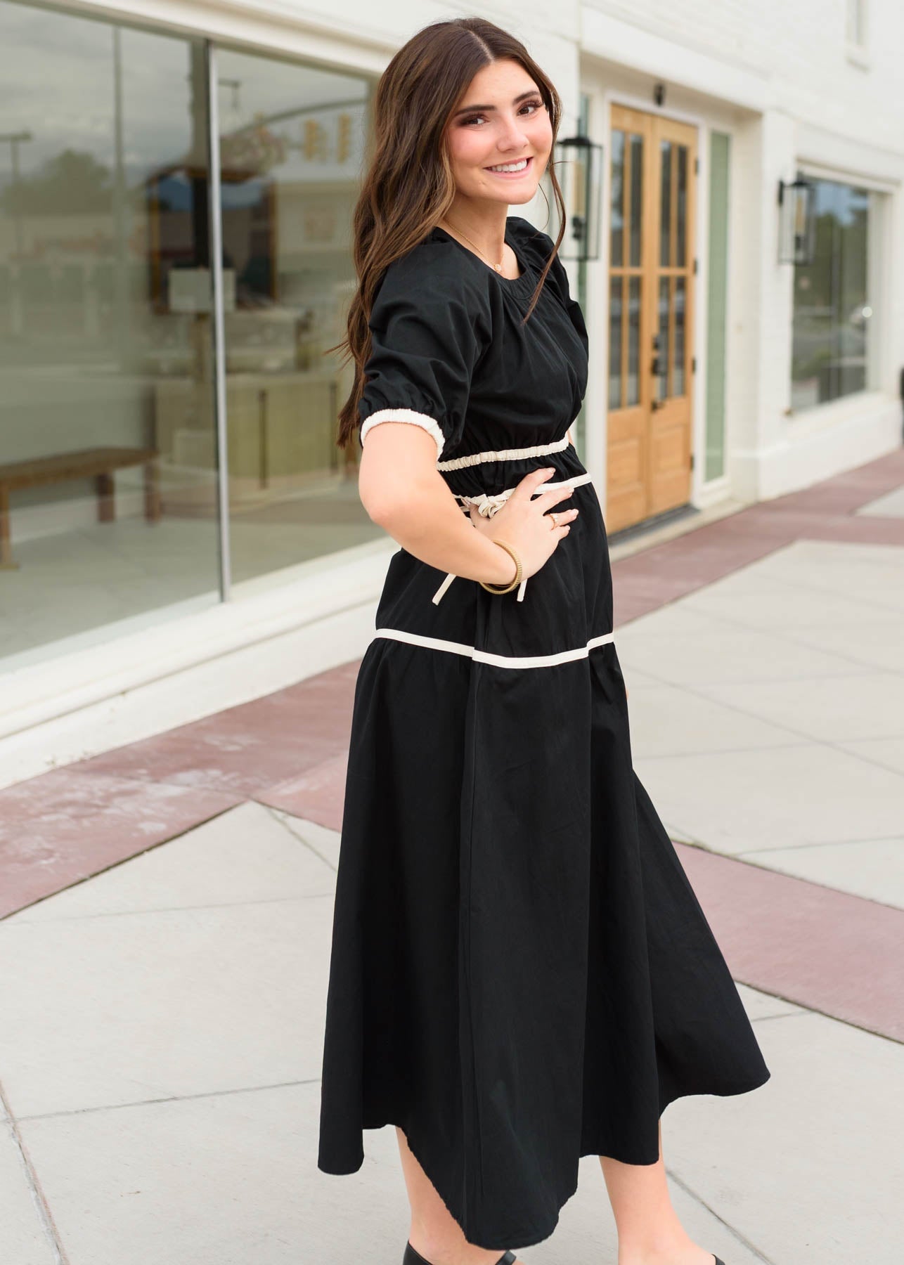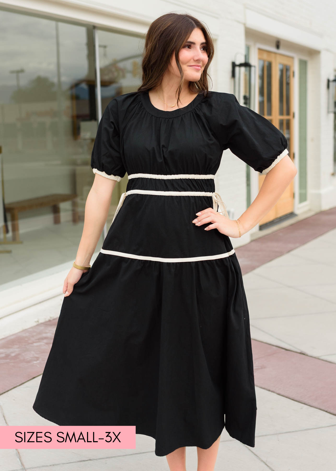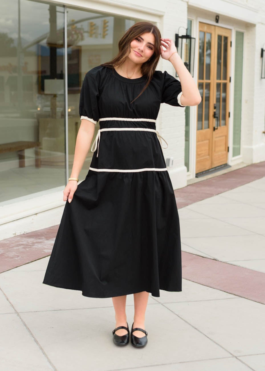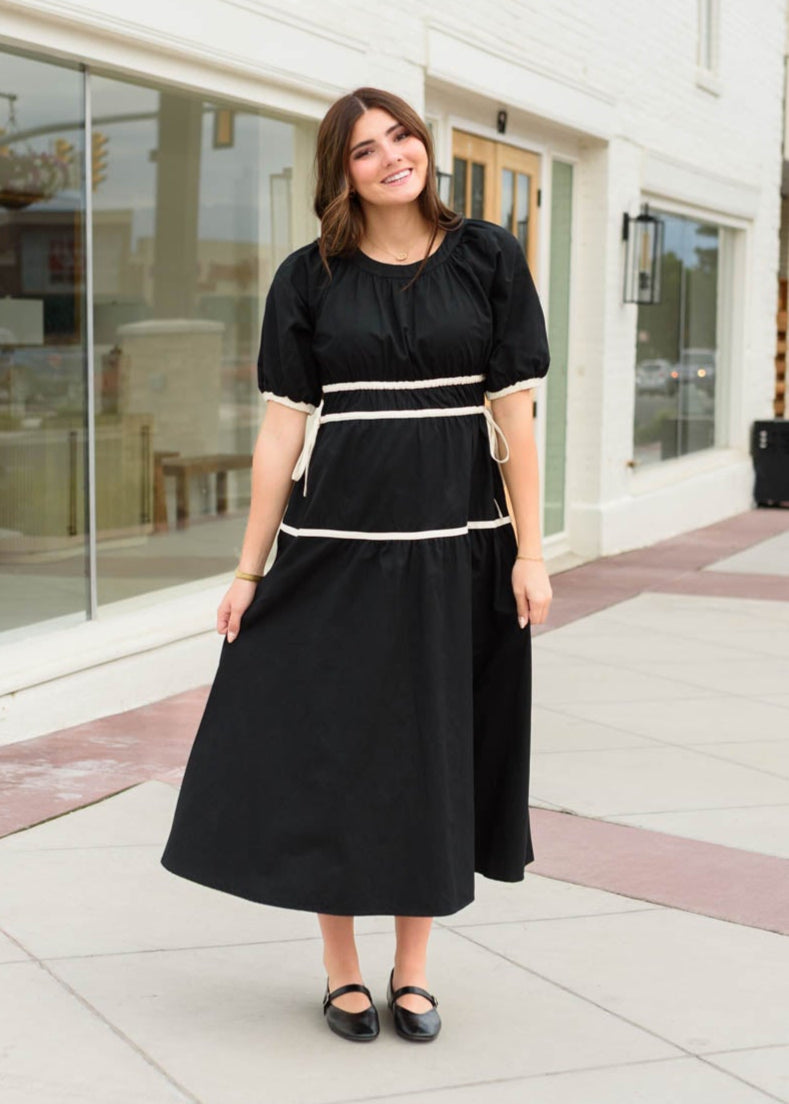 Meet your new go-to for effortless style¡ªthe Maddie Black Tie Dress is full of charming details that make it so easy to love. The scoop neckline and cream accents give it a fresh, playful feel, while the tiered skirt, elastic waist and sleeves, and adjustable waist bows make it comfy, flattering, and fun to wear.