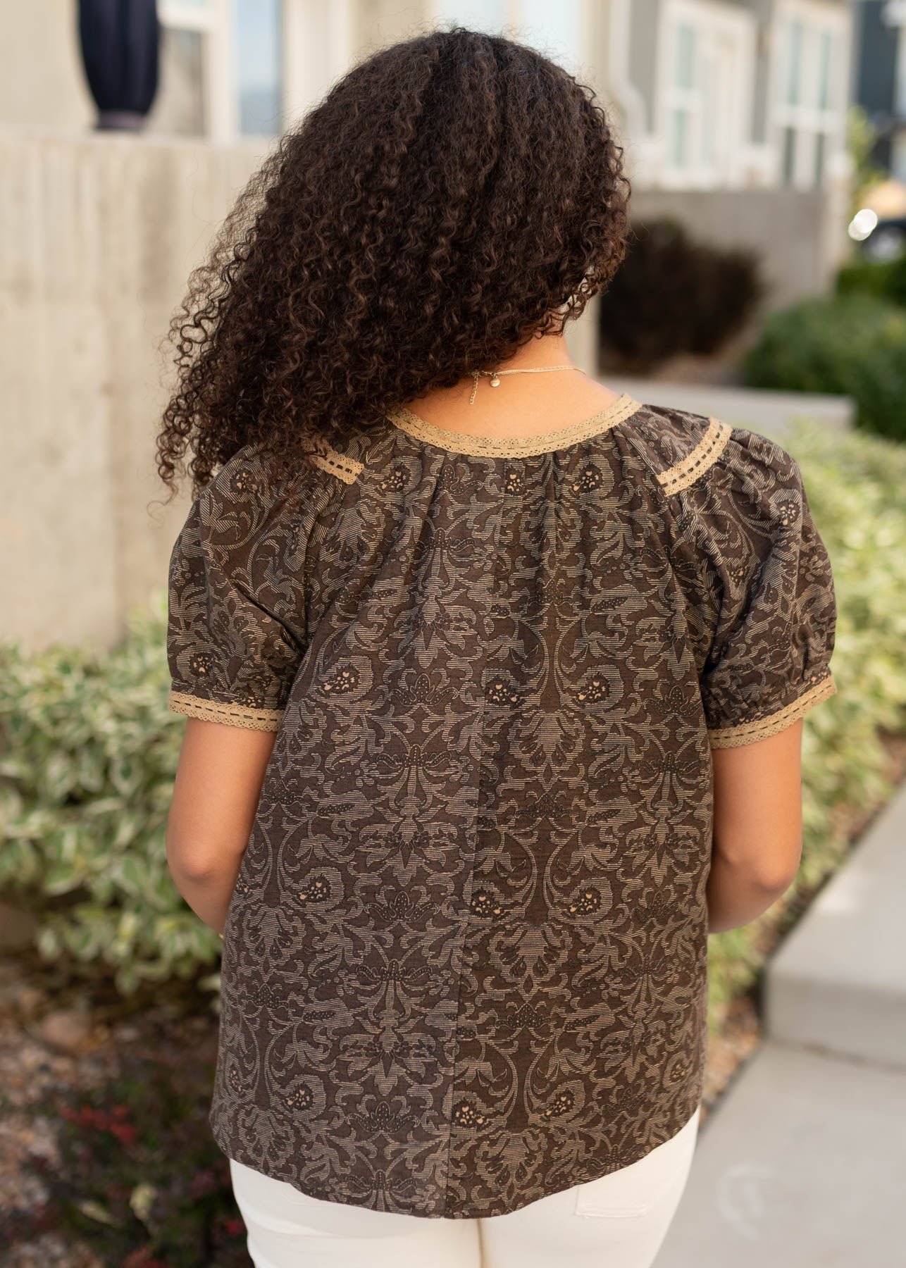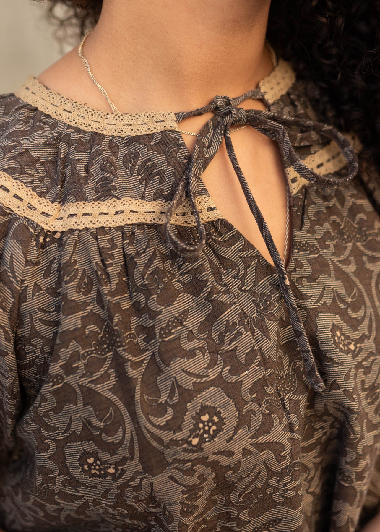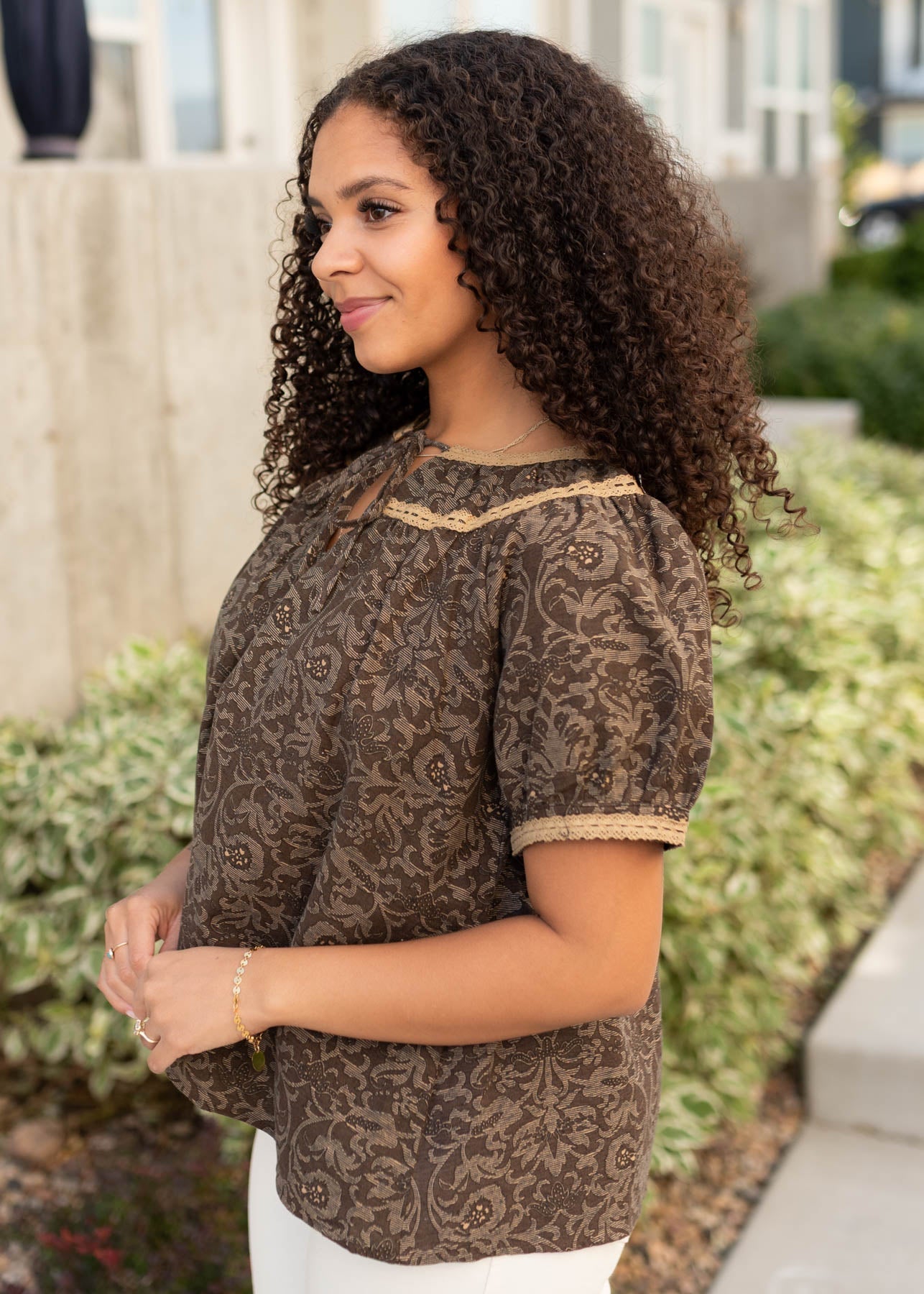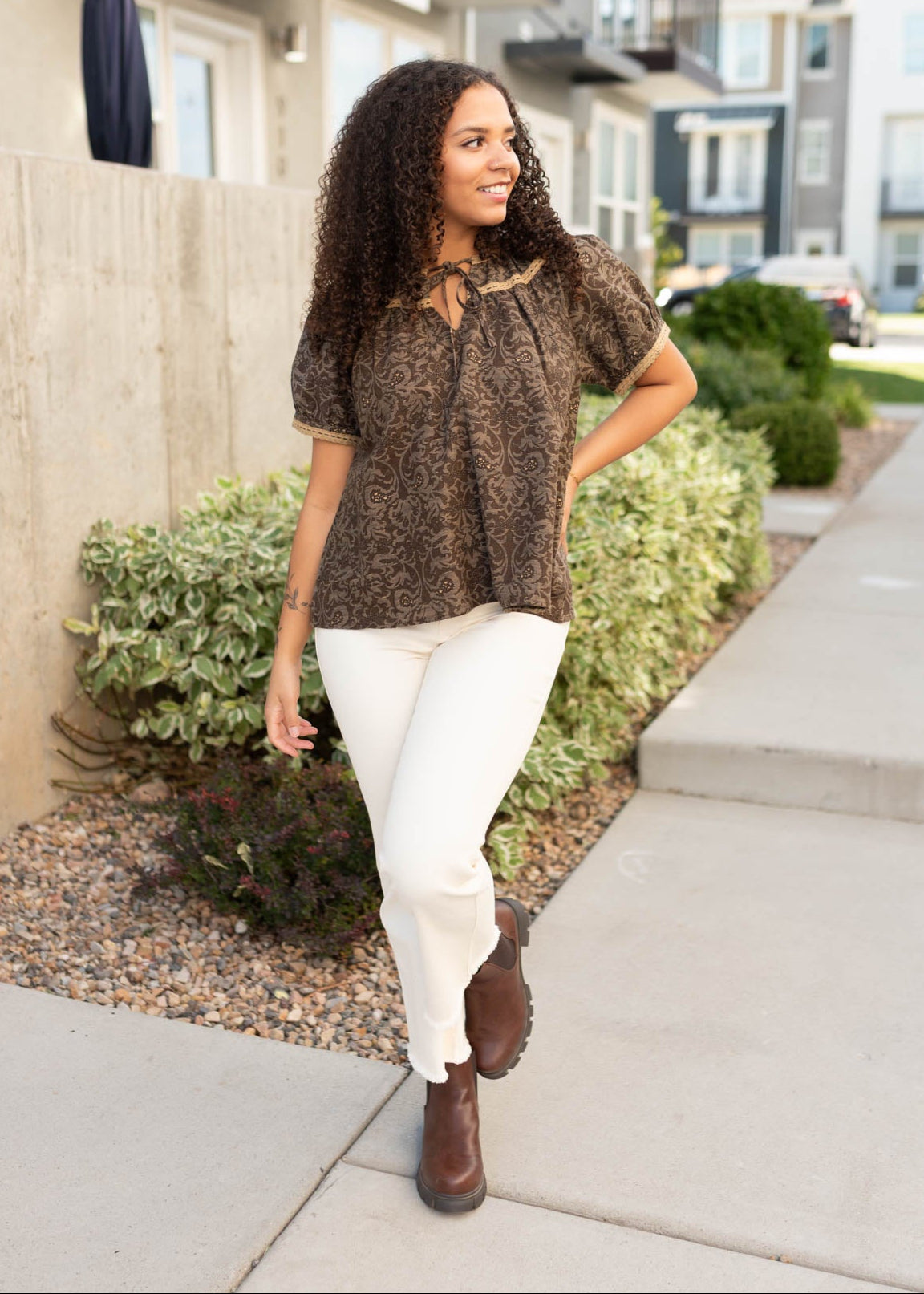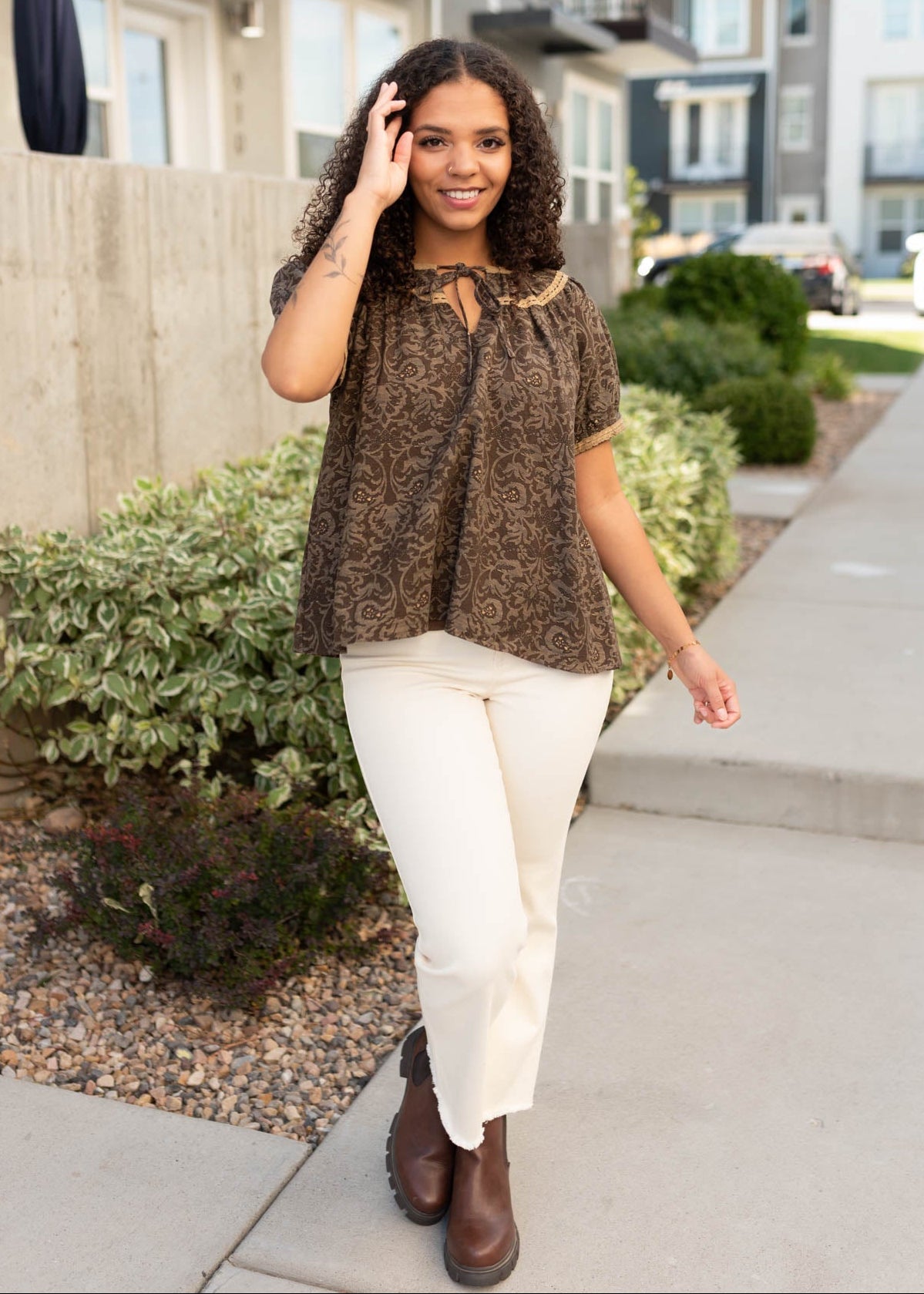 The Madison Brown Pattern Top is a sweet blend of comfort and charming details. With its delicate lace trim, functional neck tie, and flowy fit, it¡¯s an easy way to add a touch of elegance to everyday outfits while staying totally wearable.