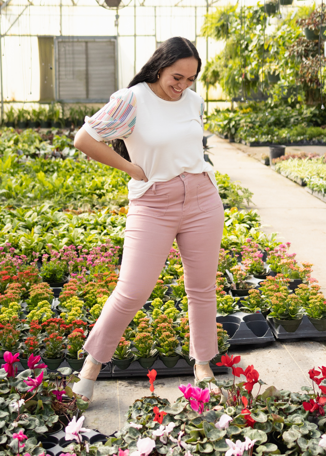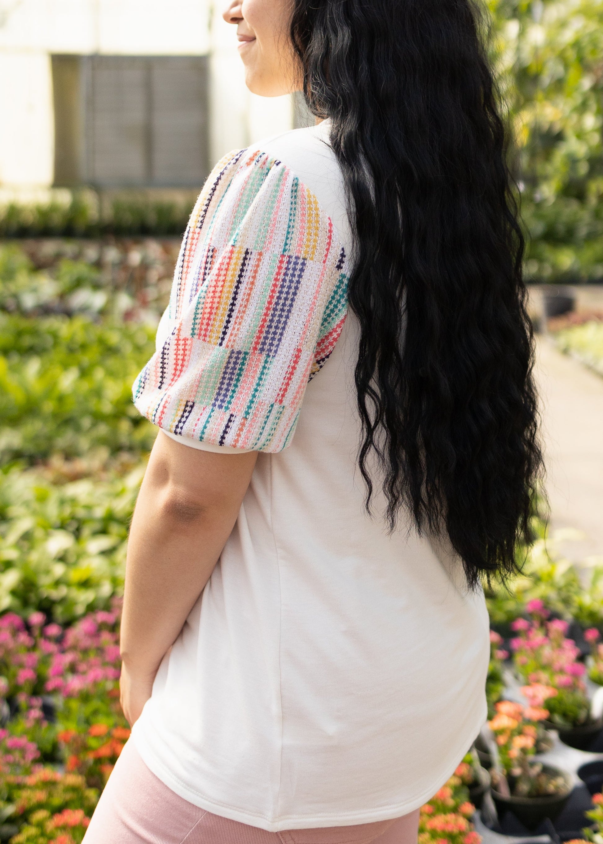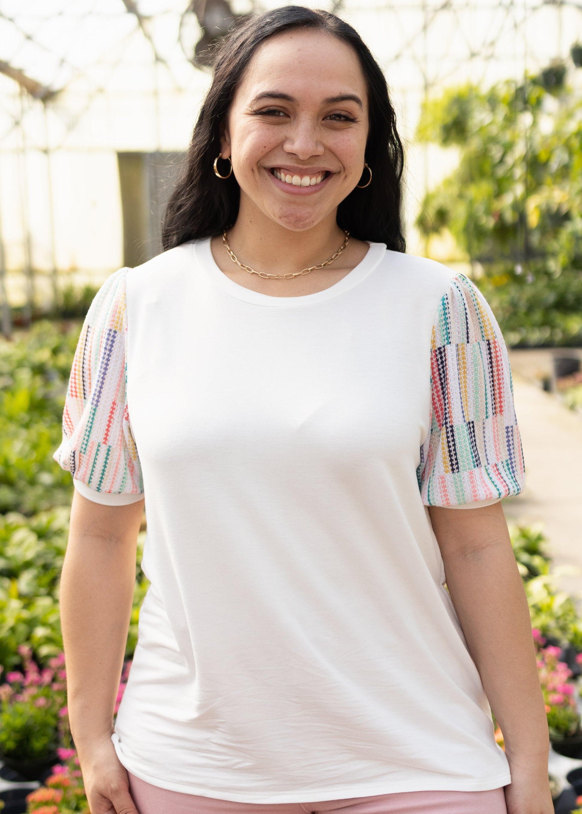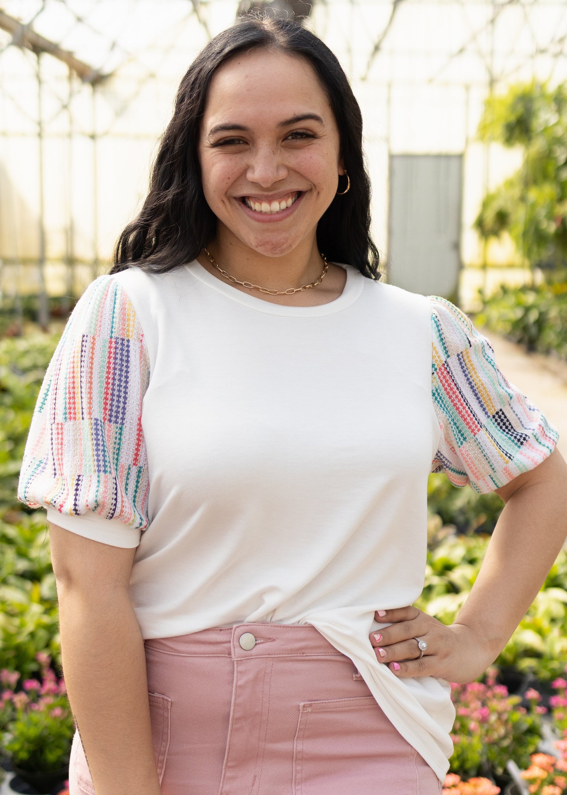 - Stunning multi-color knit puff sleeves. We're OBSESSED
