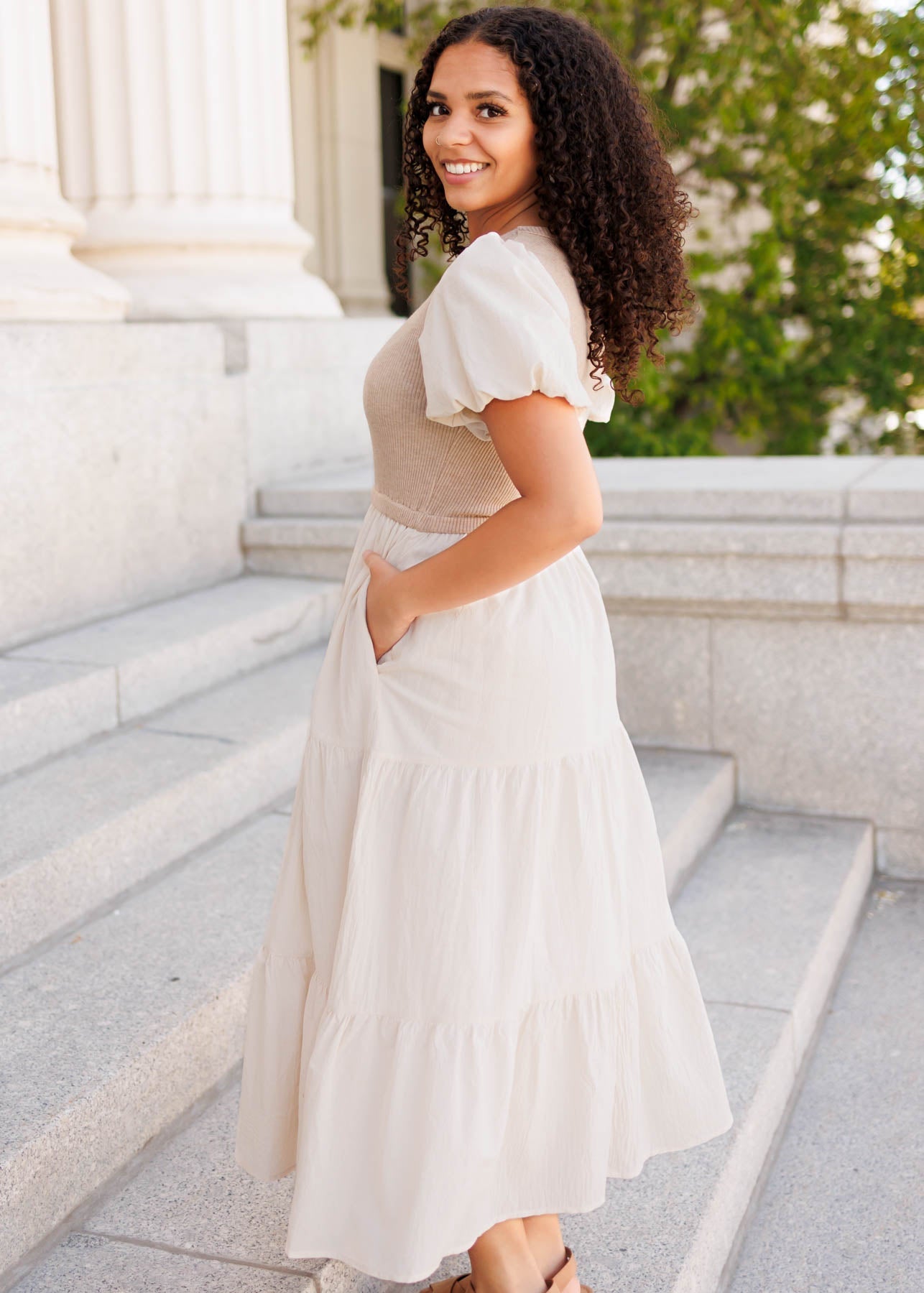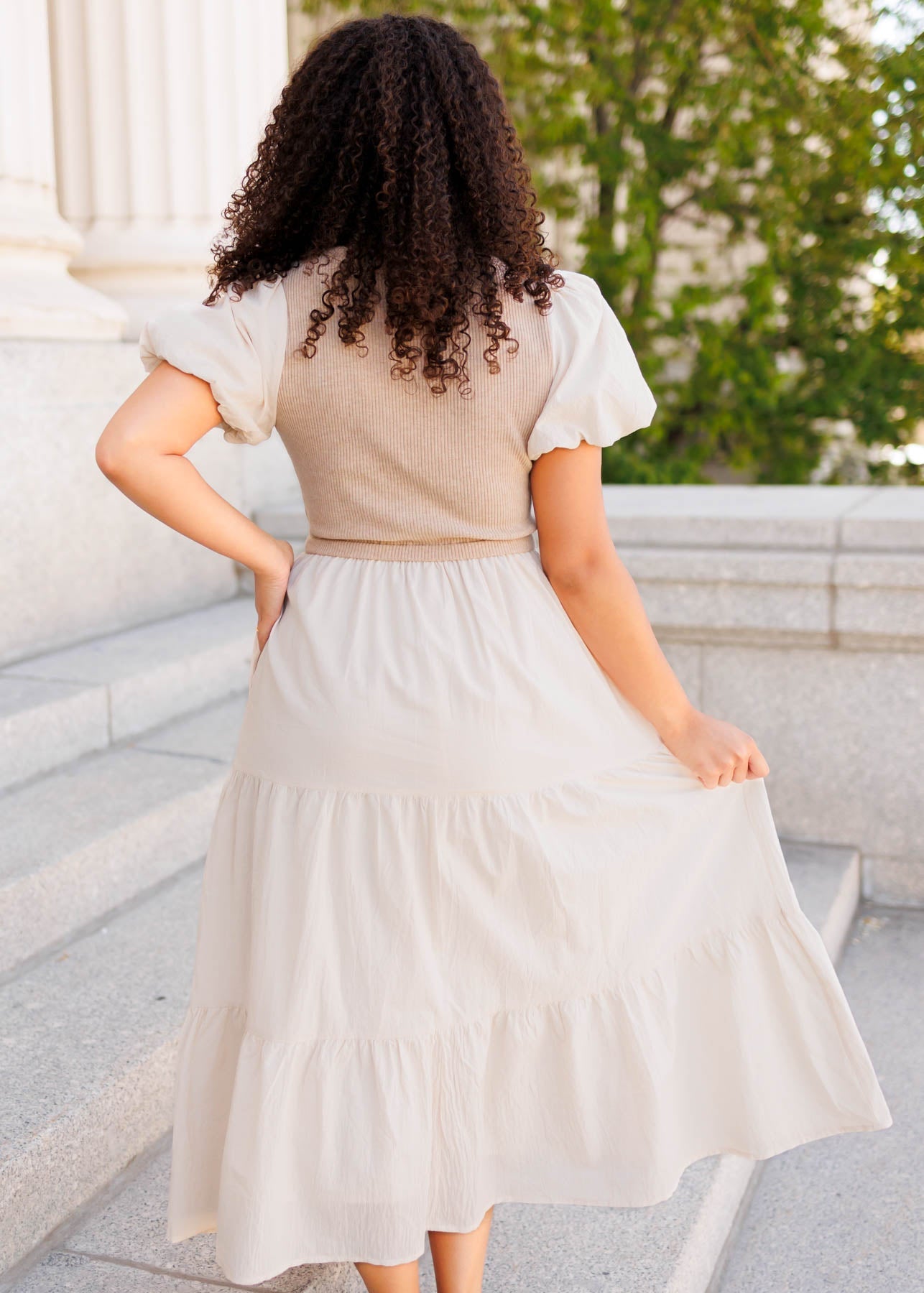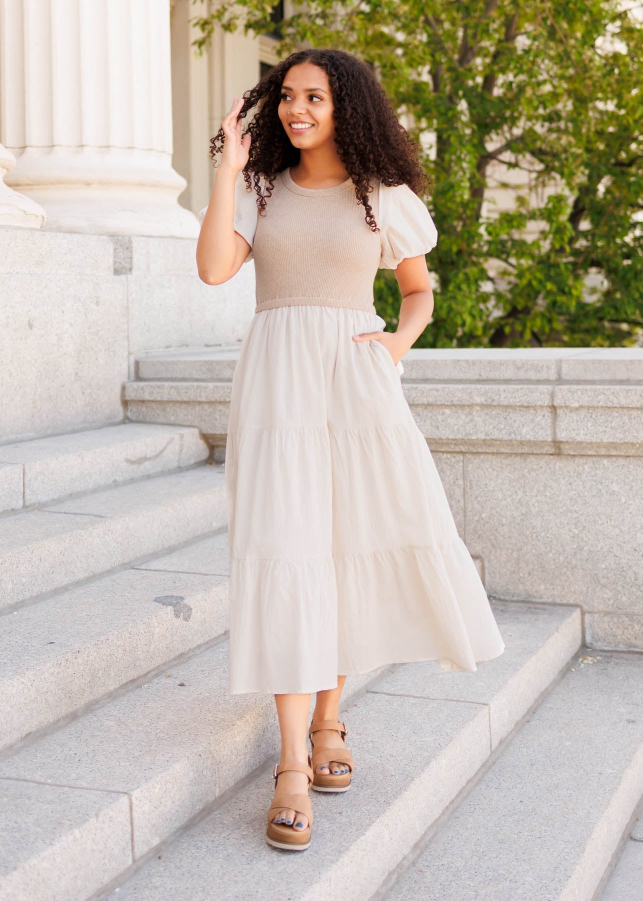 - Cute puff sleeves + tiered skirt