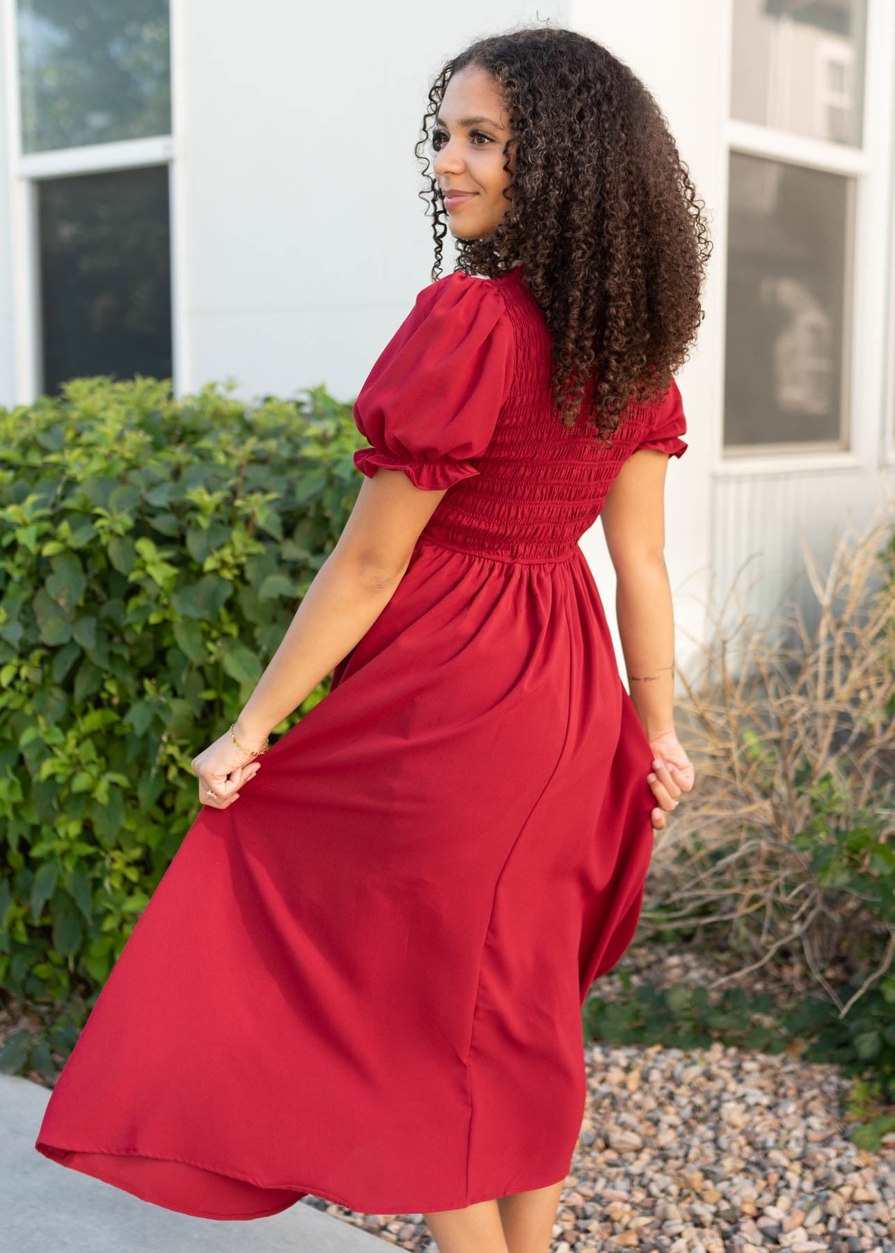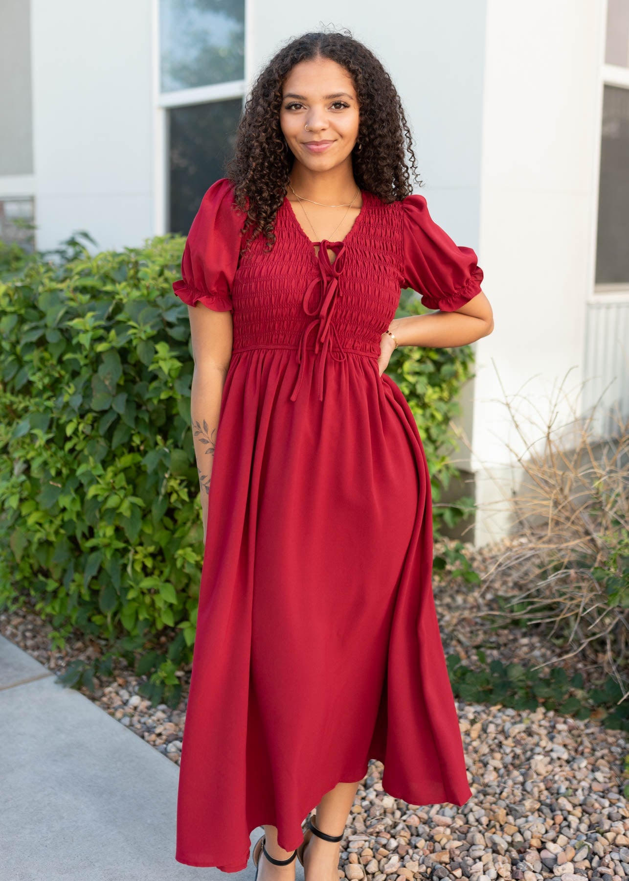 Bold yet beautifully feminine, the Miriam Crimson Smocked Dress brings all the charming details you love¡ªlike a flattering smocked bodice, sweet bow accent, and a swishy lined skirt. Comfortable and flattering, it¡¯s the kind of dress that makes you feel instantly put together.