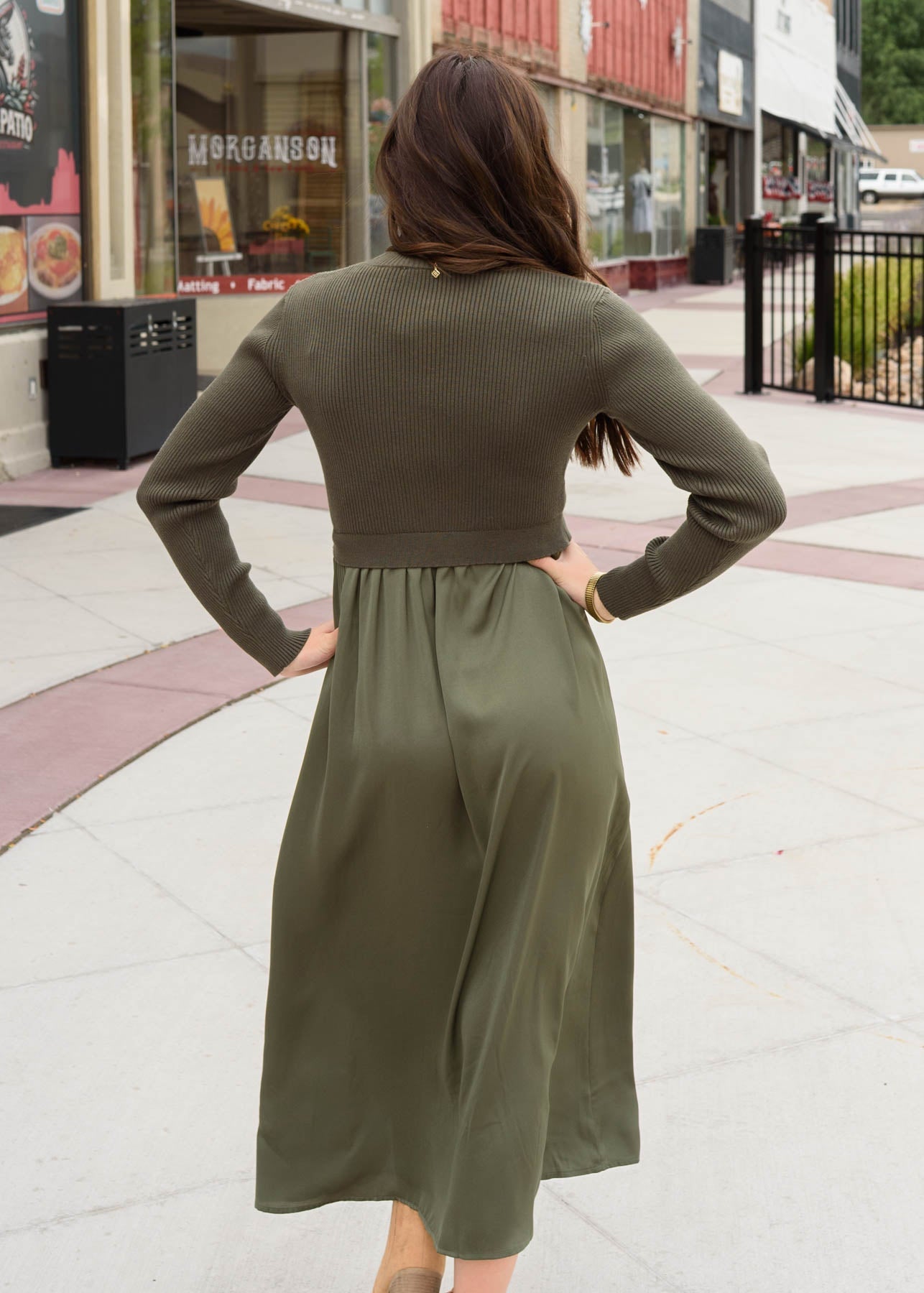 Meet the dress that¡¯s cozy, elegant, and ready for anything! The Mollie Green Sweater Dress combines a soft, ribbed sweater bodice with a flowing satin skirt for a playful mix of textures. The turtleneck and long sleeves keep it comfy and polished, while the rich green hue adds just the right pop of color.