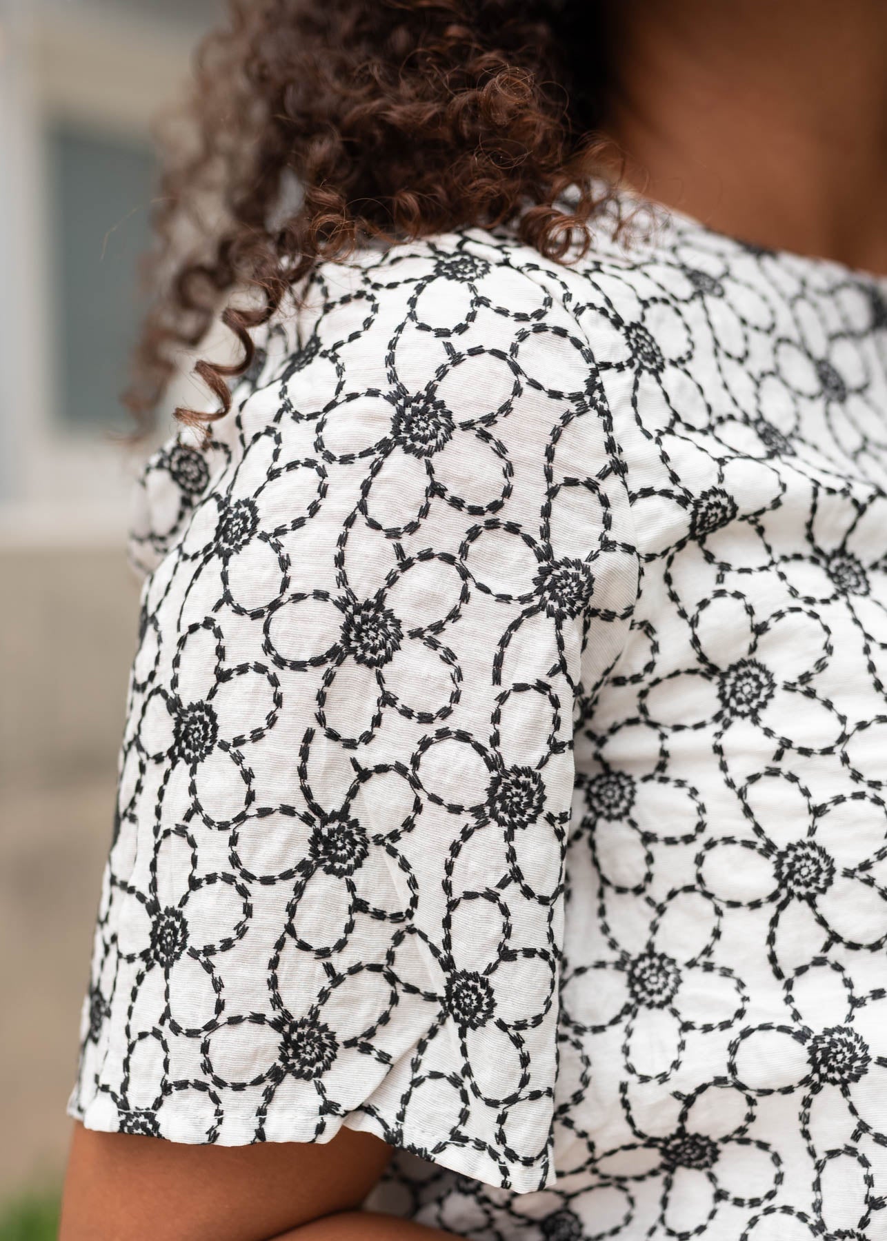 - Ivory fabric with black floral embroidery