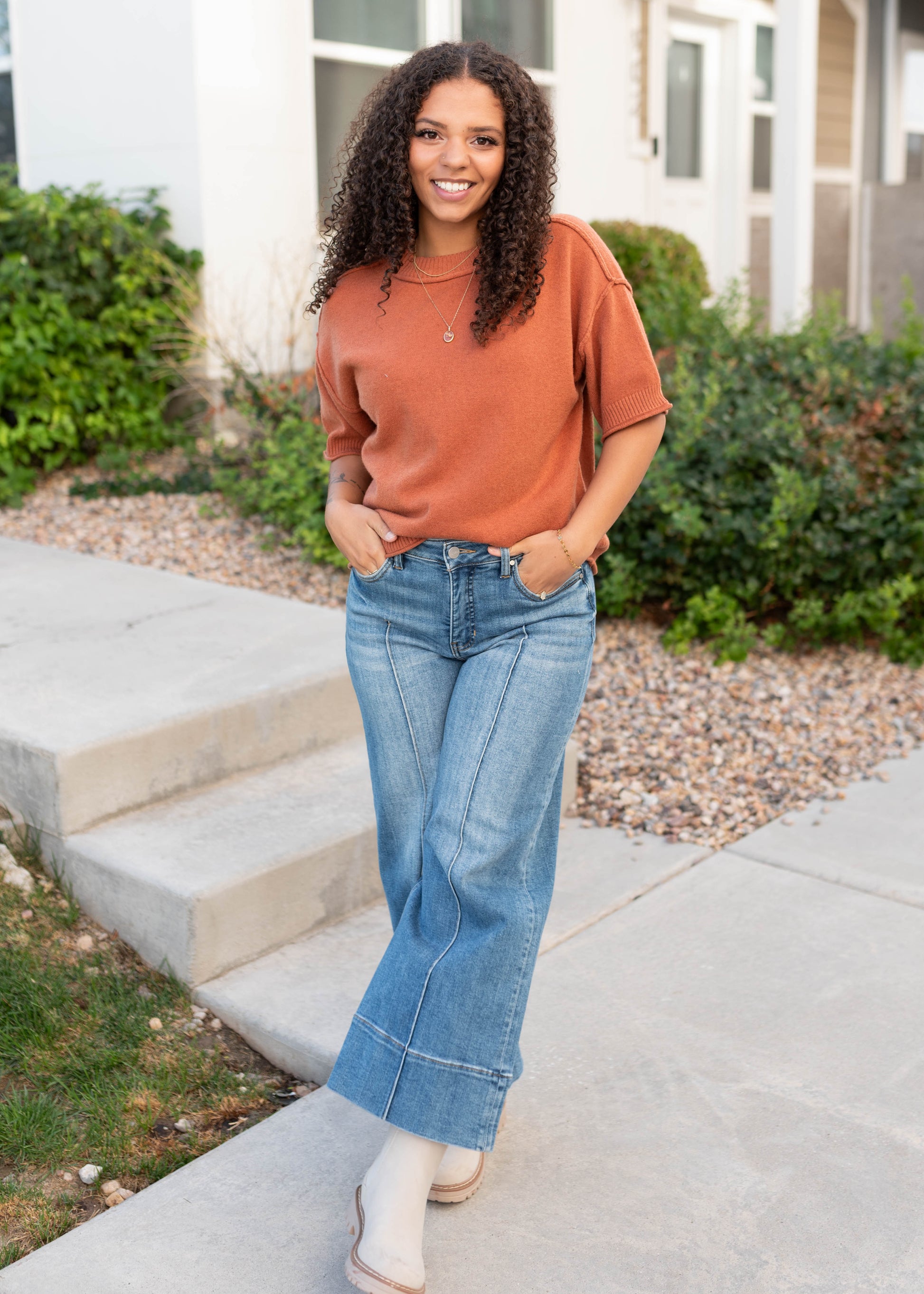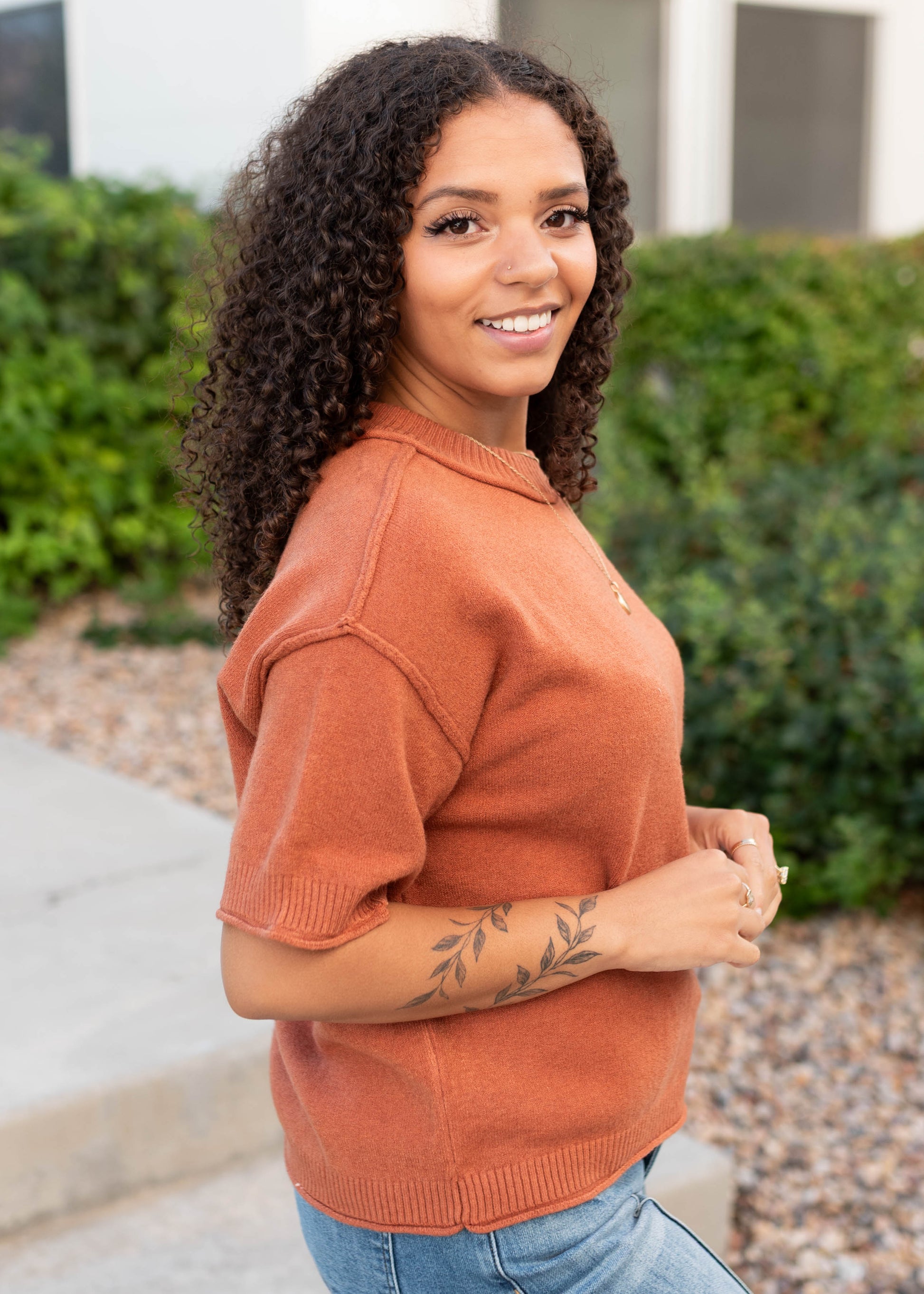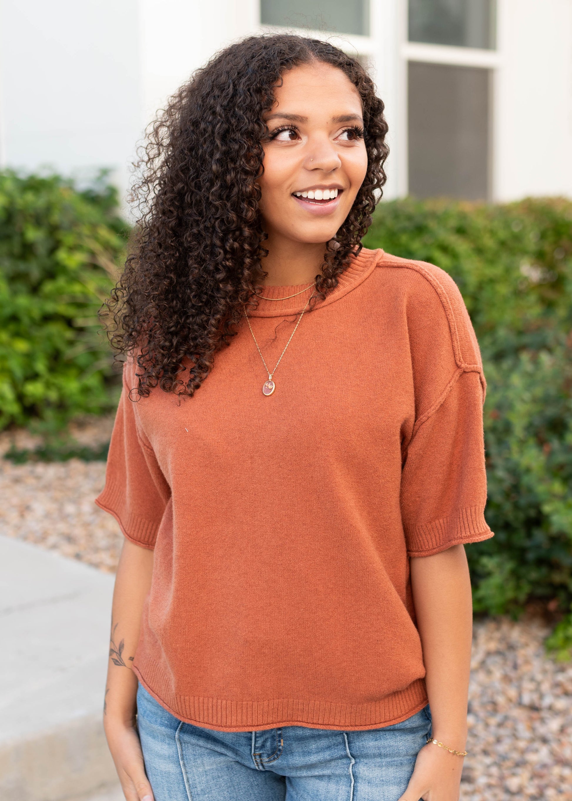 Meet your new favorite layering piece! The Norah Sweater comes in a rich cinnamon hue with the softest, buttery feel you¡¯ll want to wear on repeat. With exposed seams for a touch of detail and ribbed sleeves and neckline to keep things cozy, this short sleeve sweater is as versatile as it is comfortable. Lots of stretch makes it an easy fit you¡¯ll always reach for.