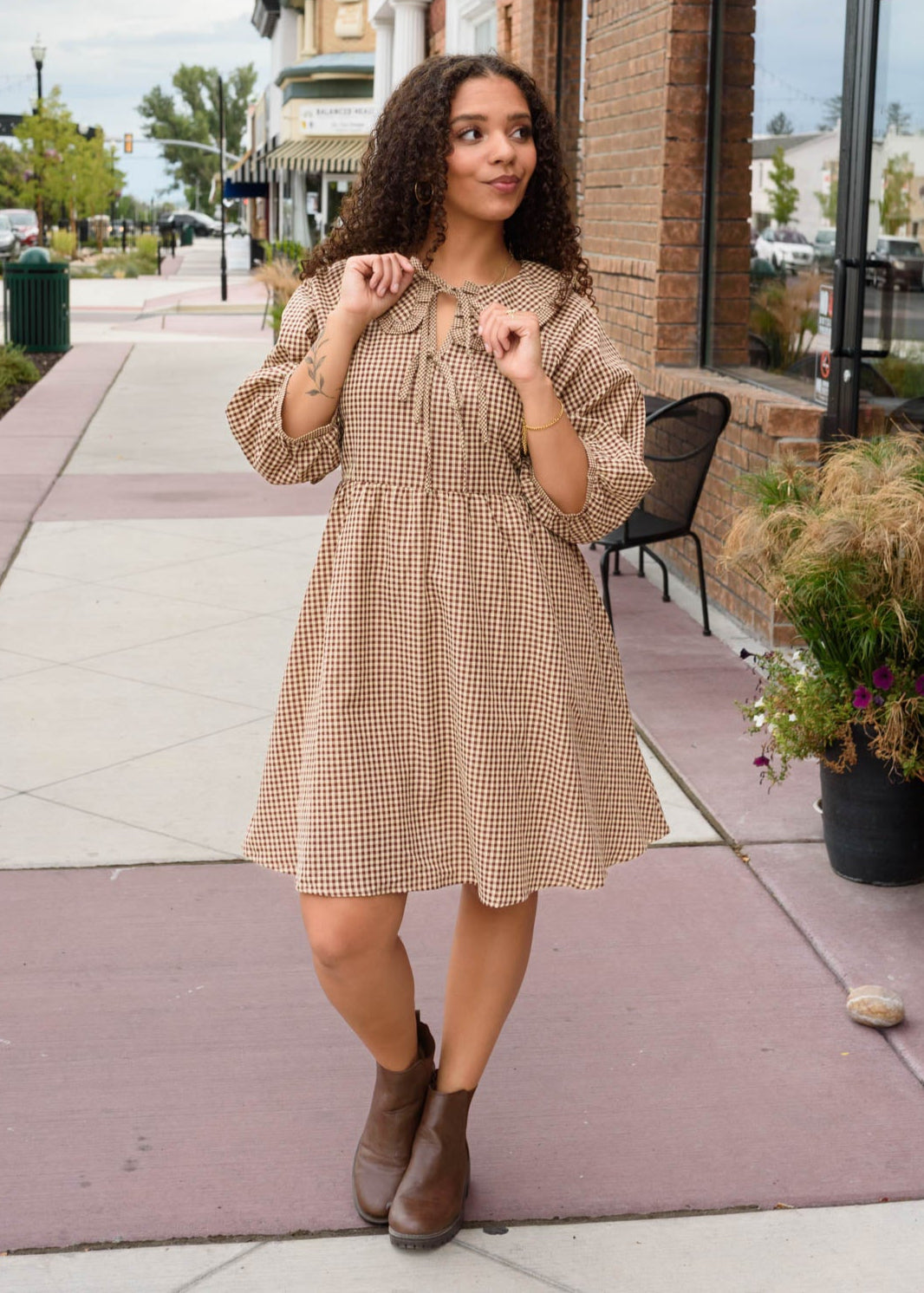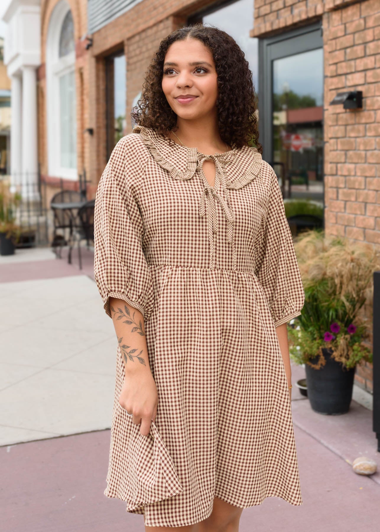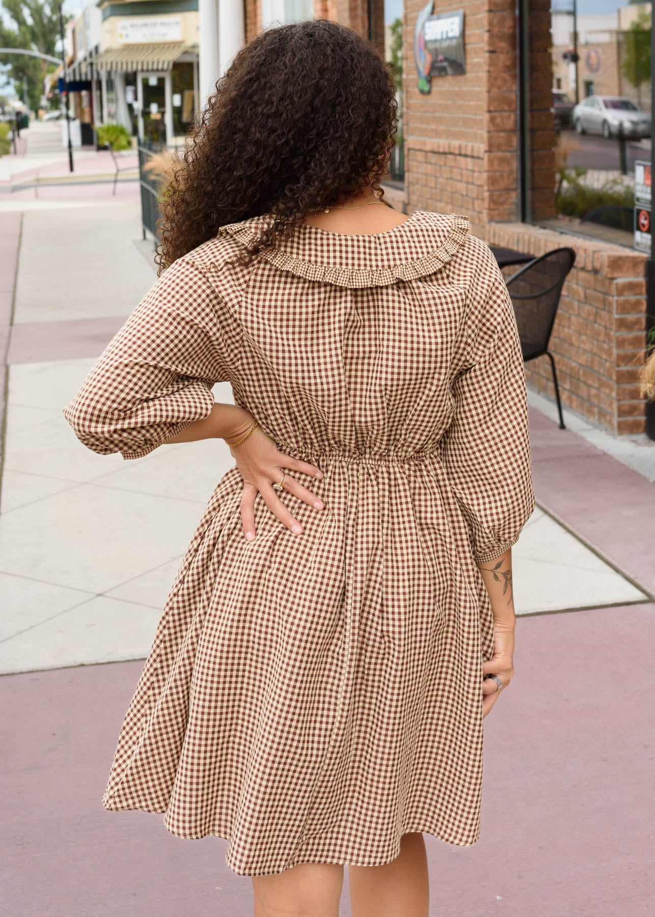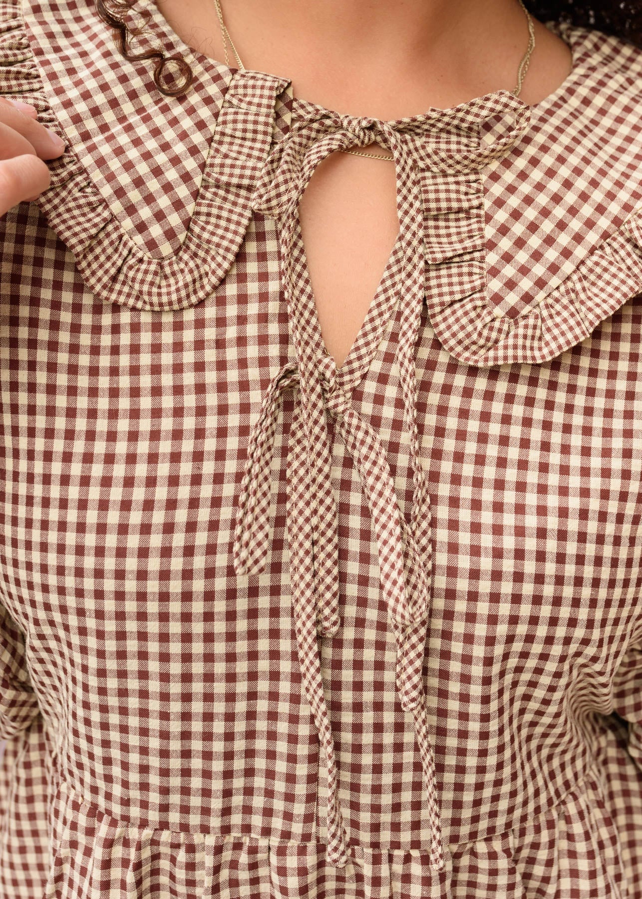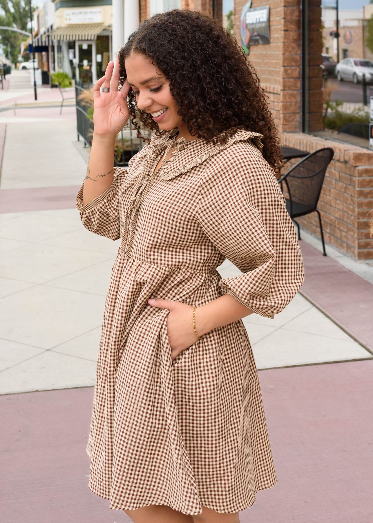 Sweet, timeless, and effortlessly pretty¡ªPenelope is the dress you¡¯ll reach for when you want something classic with a playful twist. The soft brown gingham print feels fresh and feminine, while the ruffle collar and tie neckline add just the right amount of detail. With functional pockets and a lined skirt, it¡¯s as practical as it is pretty.