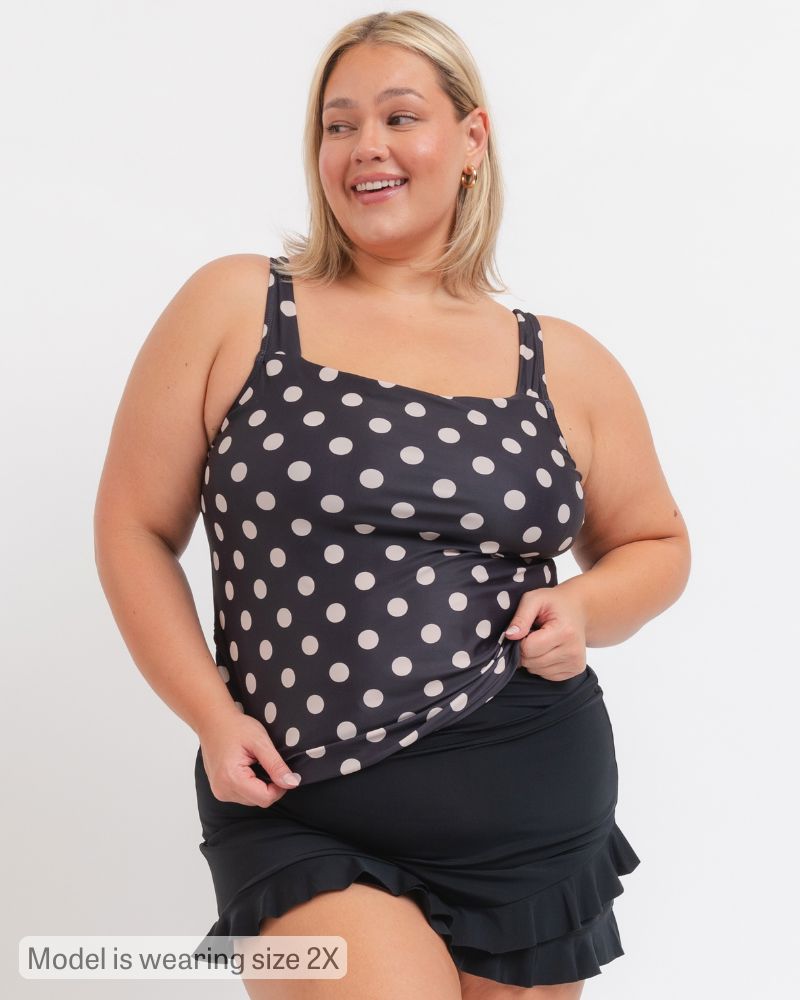 Hop on the dot train in our Retro Dot Square Neck Tankini... Featuring thick, comfortable, adjustable straps and a built-in shelf bra for great support and coverage. A little bit of ruching on the sides gives it some style and we are confident you will love this new version of one of our most popular styles! Pair it with your favorite bottom in this charming collection.?