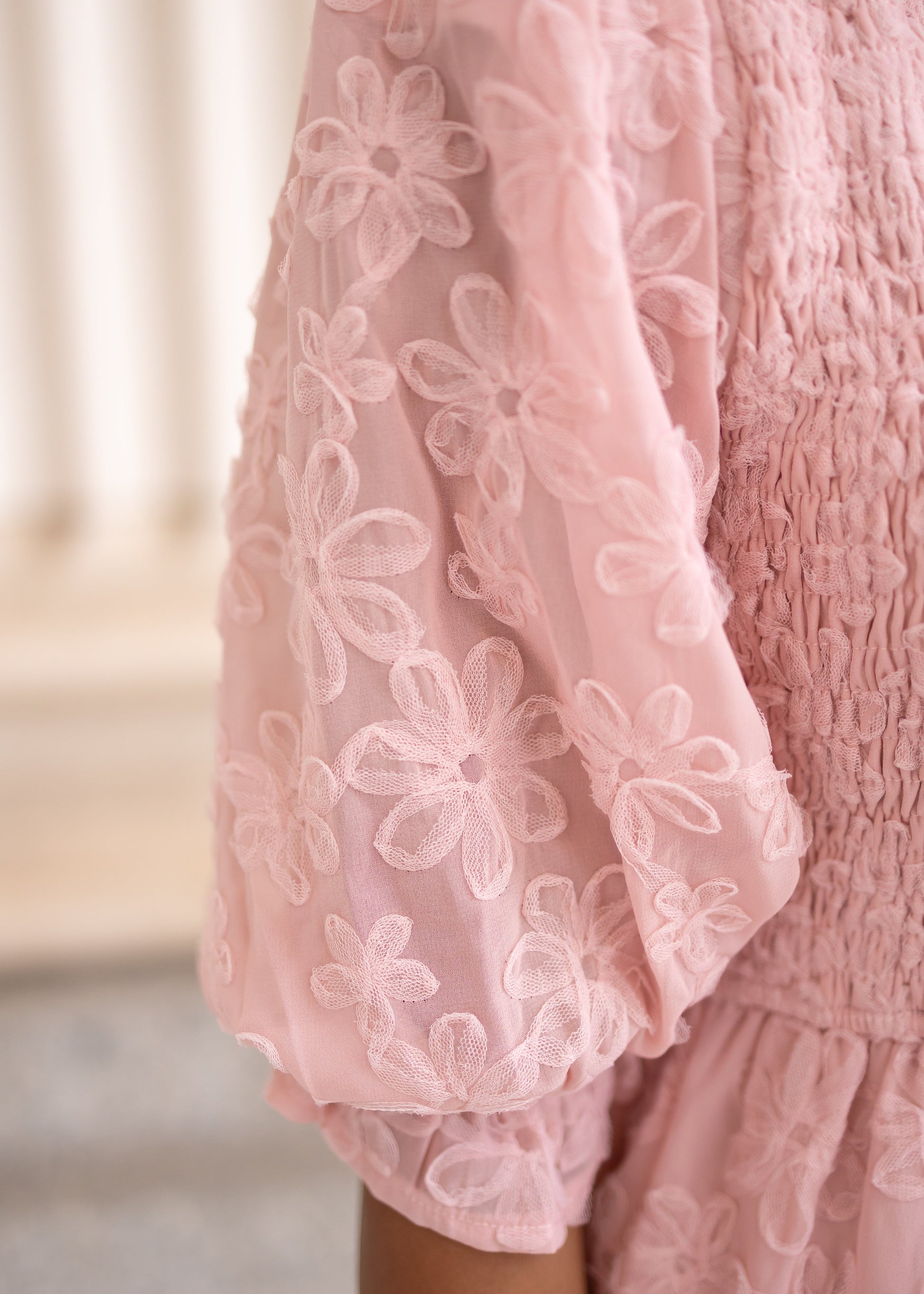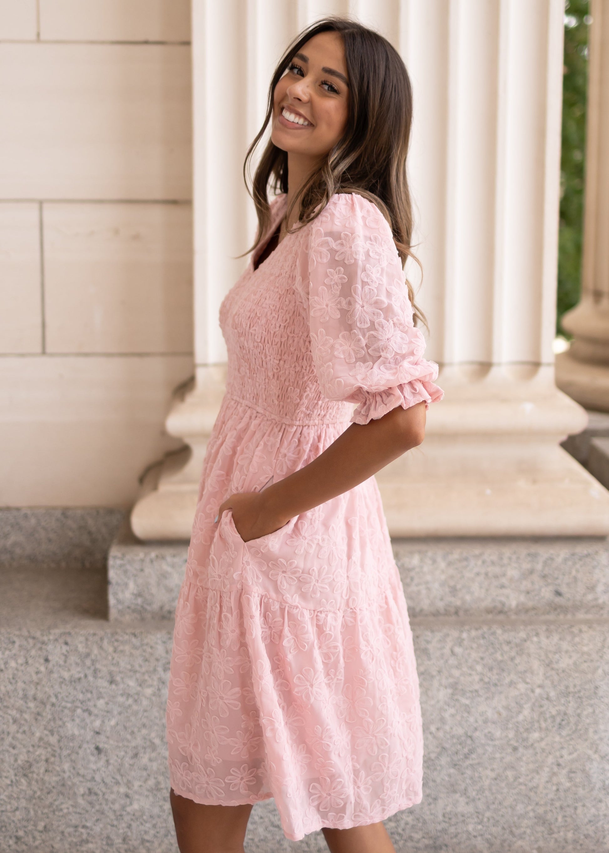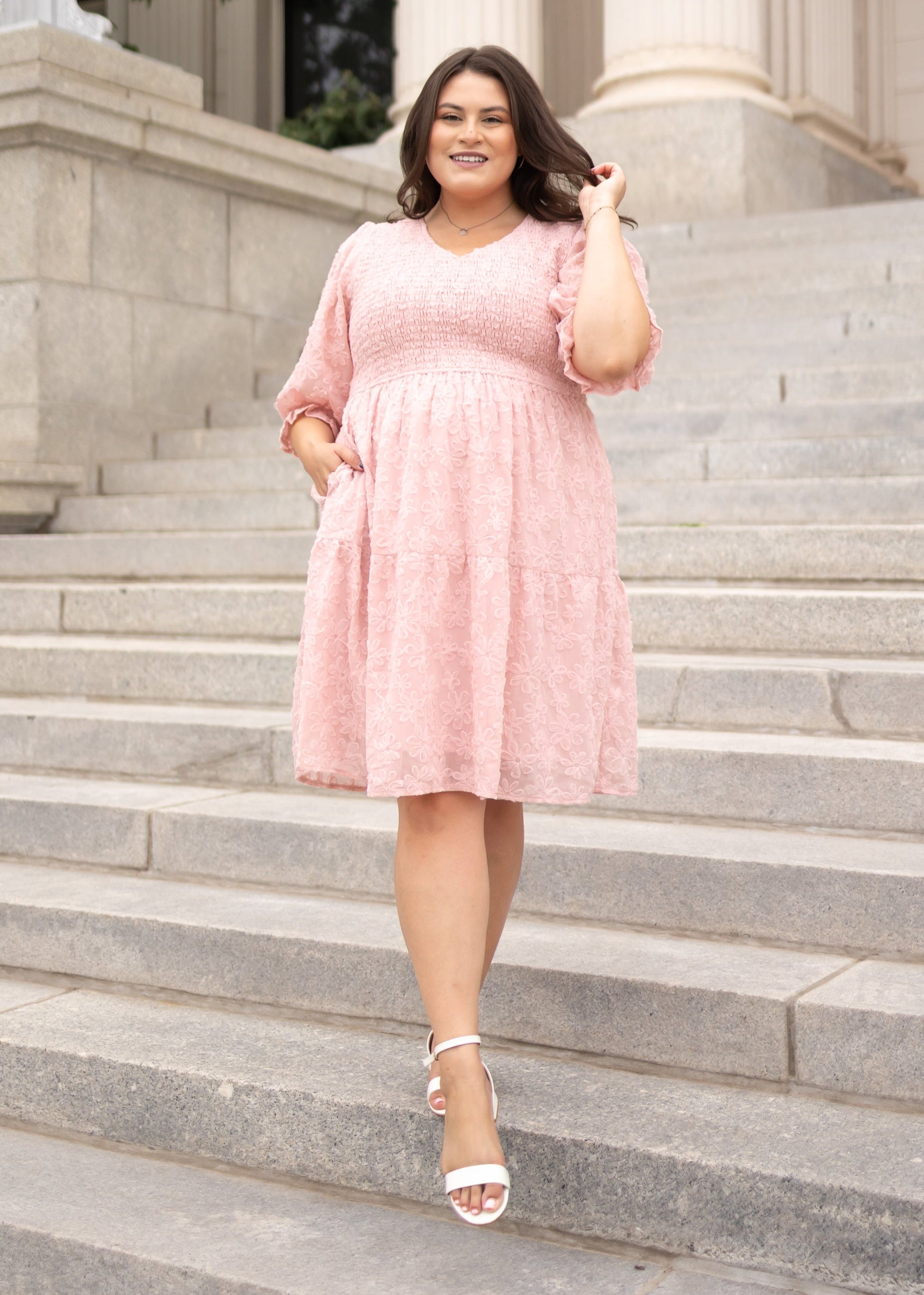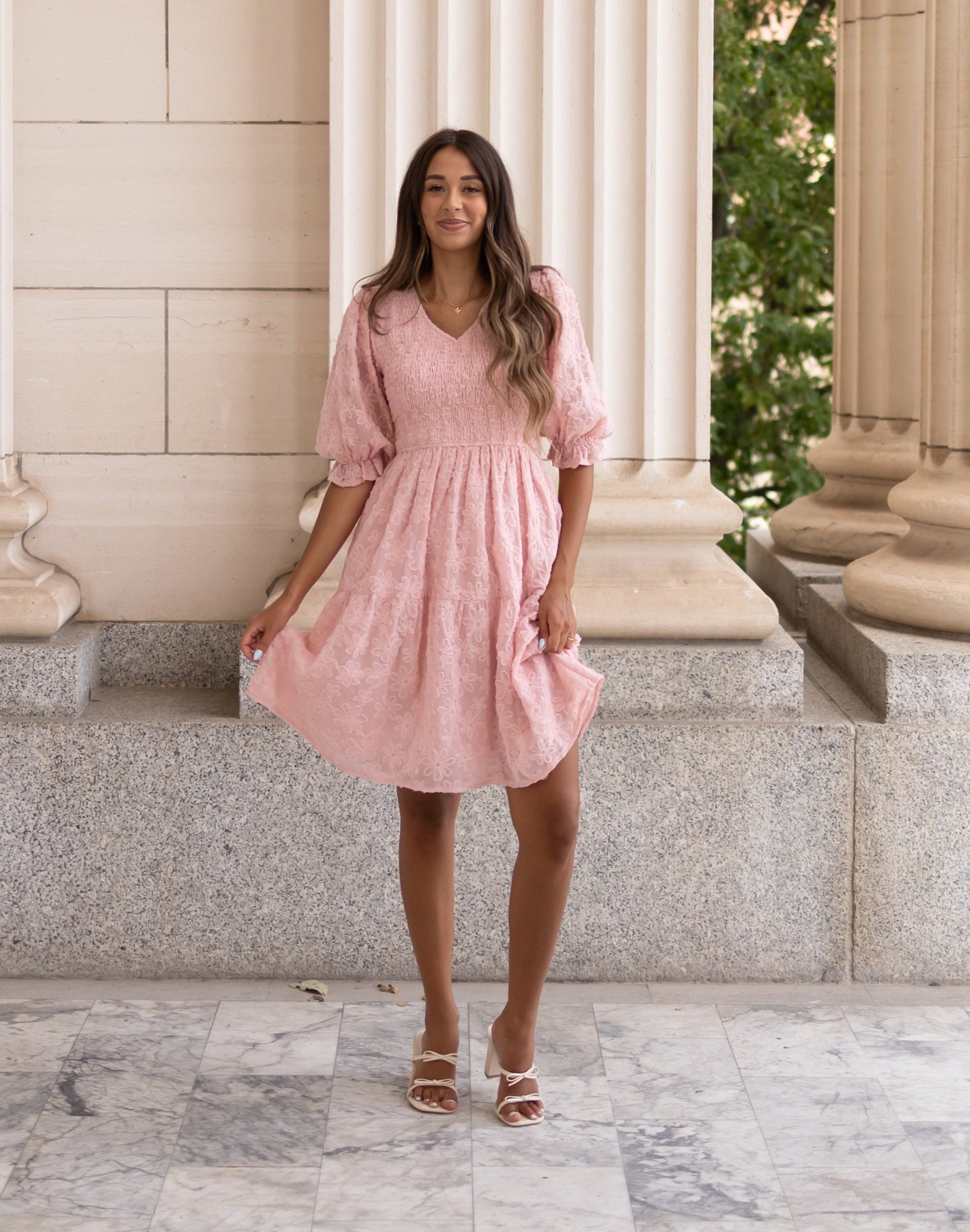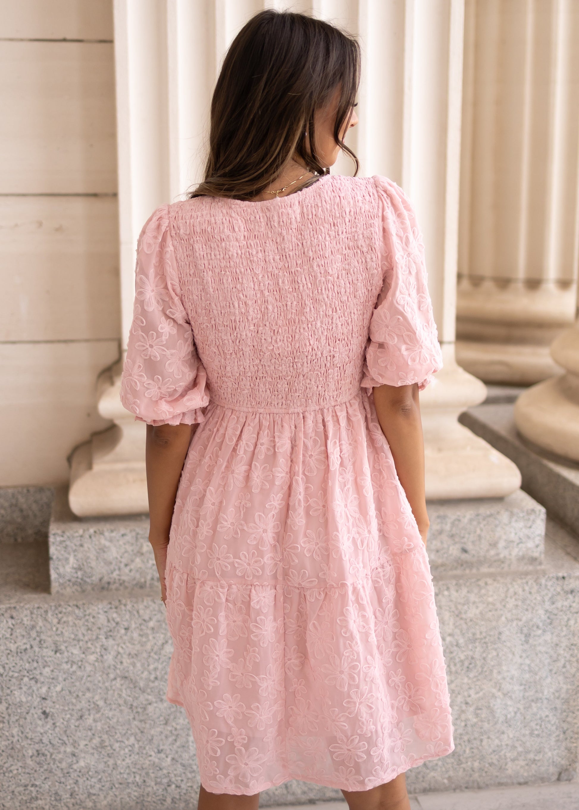 Romantic and effortlessly flattering, the Robin Dress is designed with soft blush pink textured fabric and dainty floral details. A smocked bodice adds all-day comfort and shape, while the flowy skirt and short sleeves keep it breezy and beautiful.