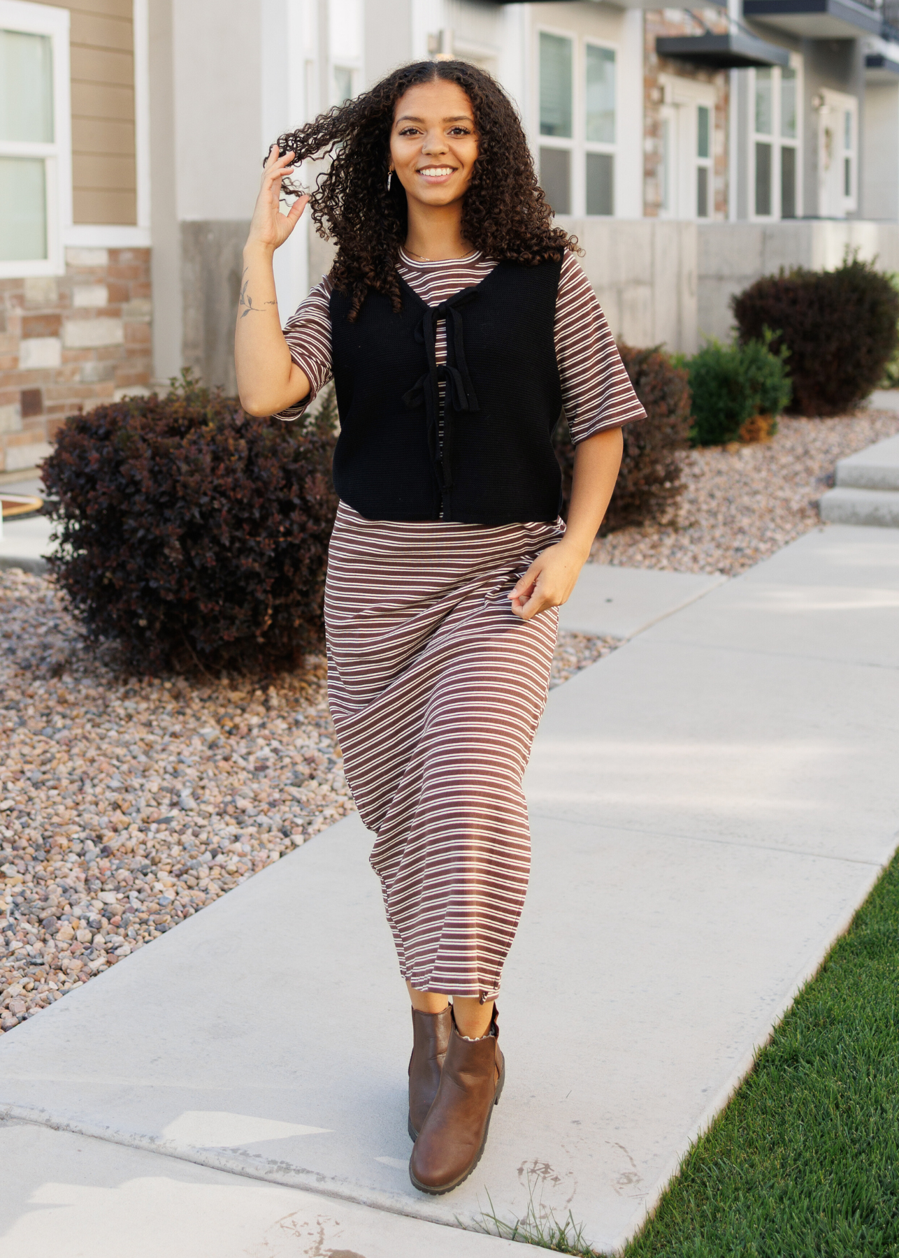 Layering just got prettier with the Sahana Sweater Vest! Made from a soft black cotton knit, this vest features a flattering v-neckline and a dainty front tie closure for an extra touch of charm. Perfect for styling over your favorite tops or dresses, it¡¯s the easiest way to add texture and interest to your look.