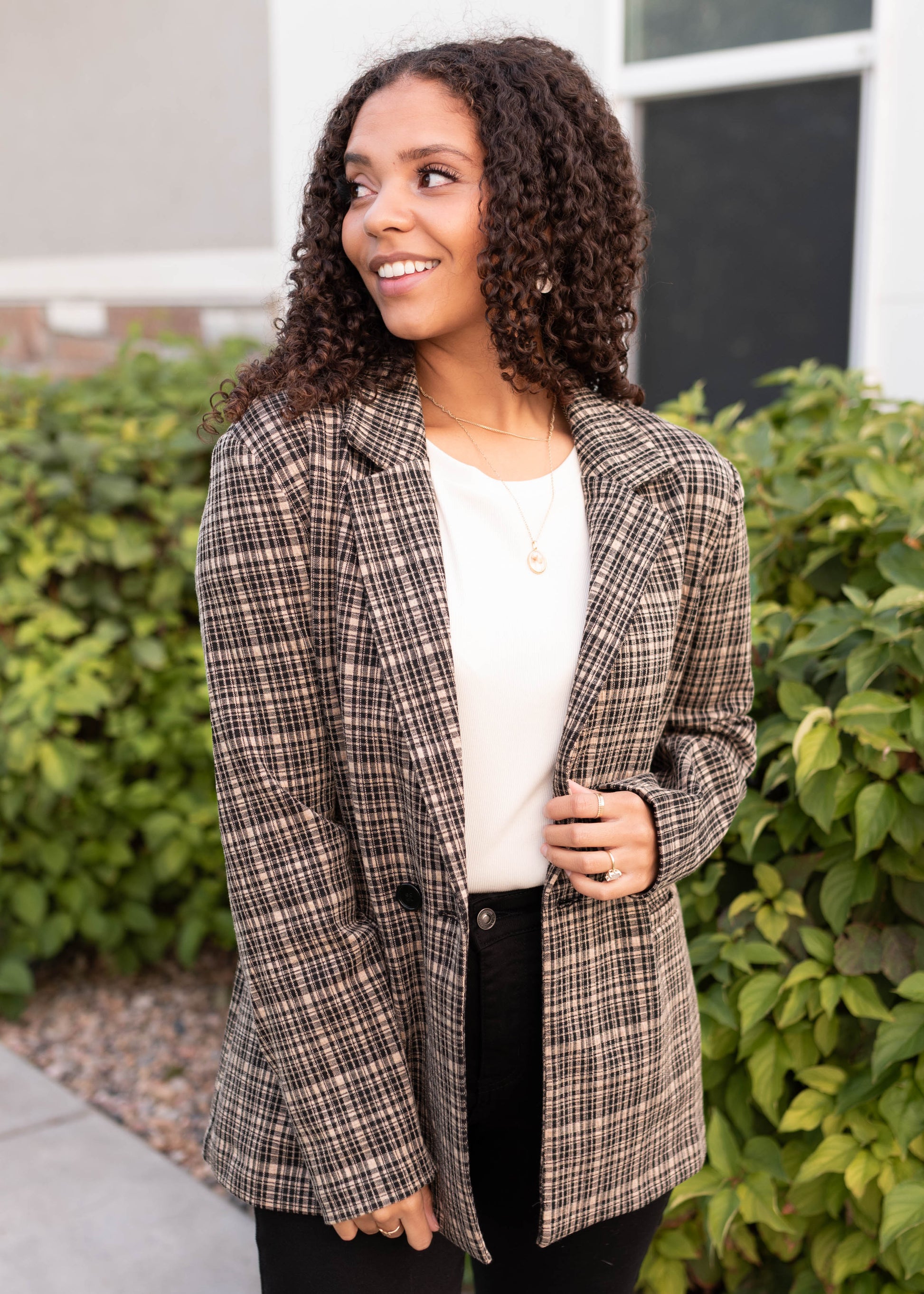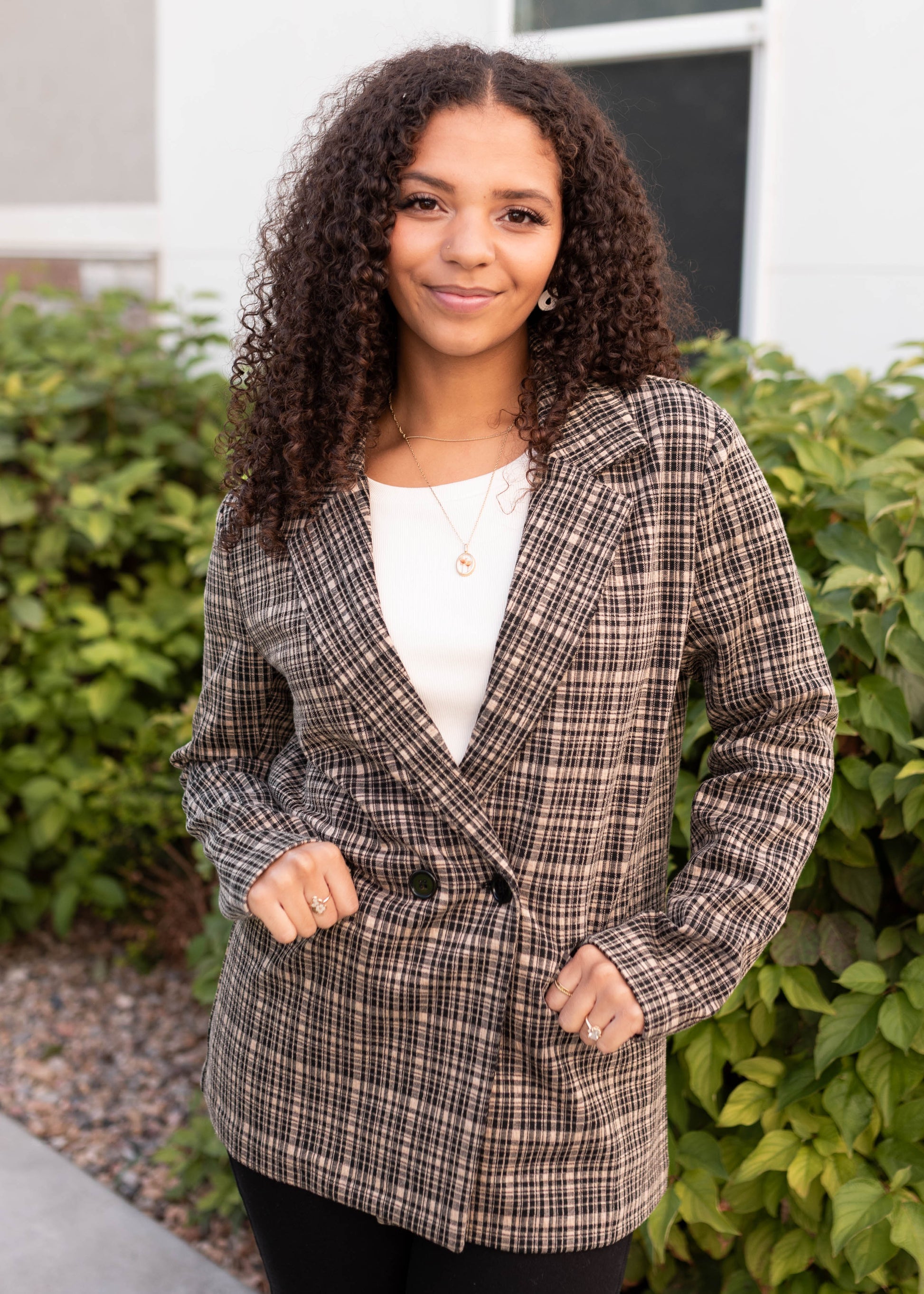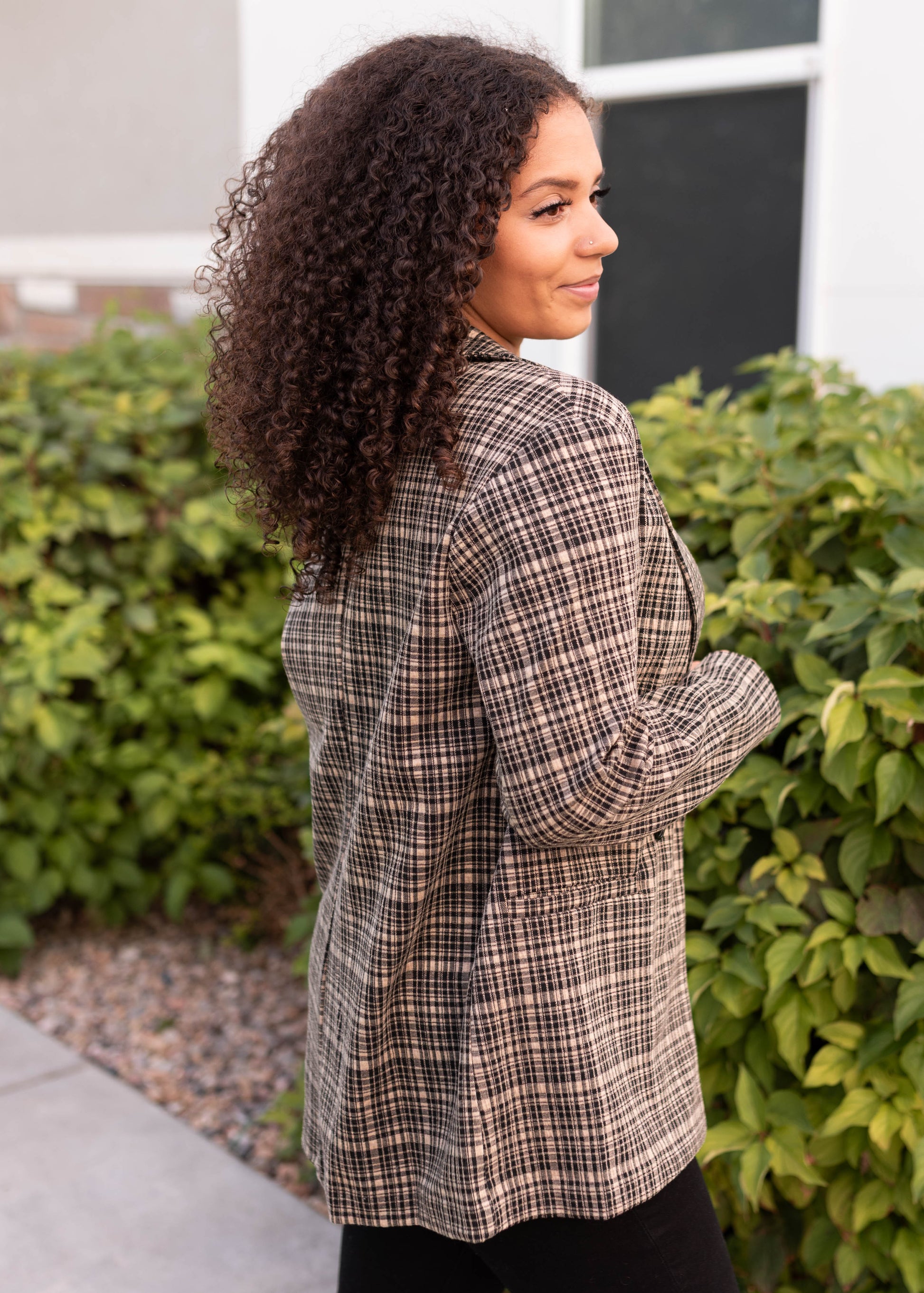 The Sam Blazer is where tailored meets comfy ? With its relaxed fit and soft black-and-taupe plaid pattern, this layer instantly elevates any outfit without feeling too stuffy. The collared neckline and functional front buttons keep things sleek, while the faux pockets add just the right touch of detail. Fits true to size, but size up if you¡¯re in-between for that perfectly relaxed look. Pair it with denim for everyday style or dress it up for work¡ªyou¡¯ll find yourself reaching for this one on repeat!