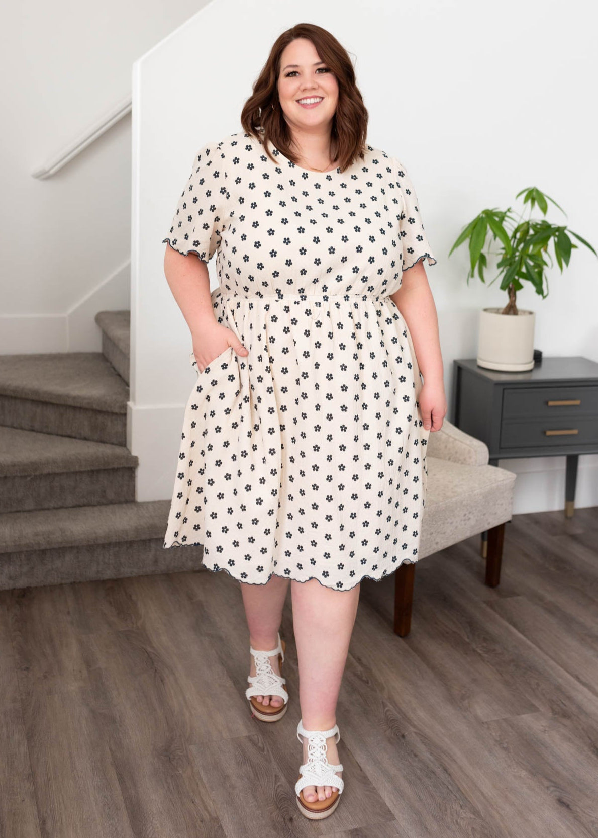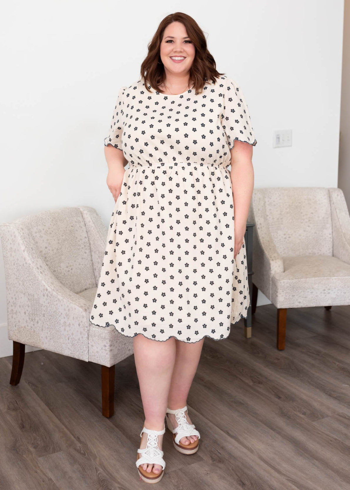 - Elegant embroidered scalloped hem along the sleeve and bottom of skirt