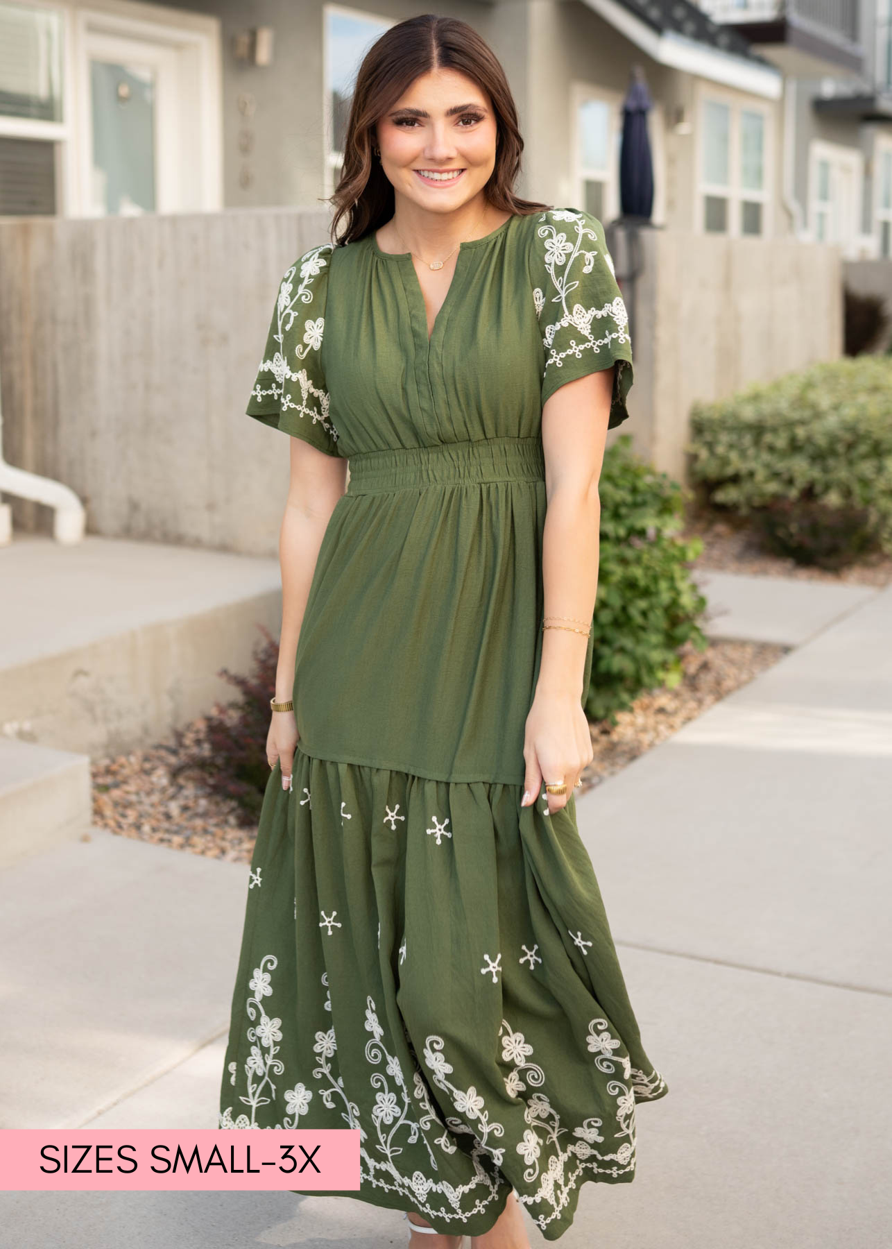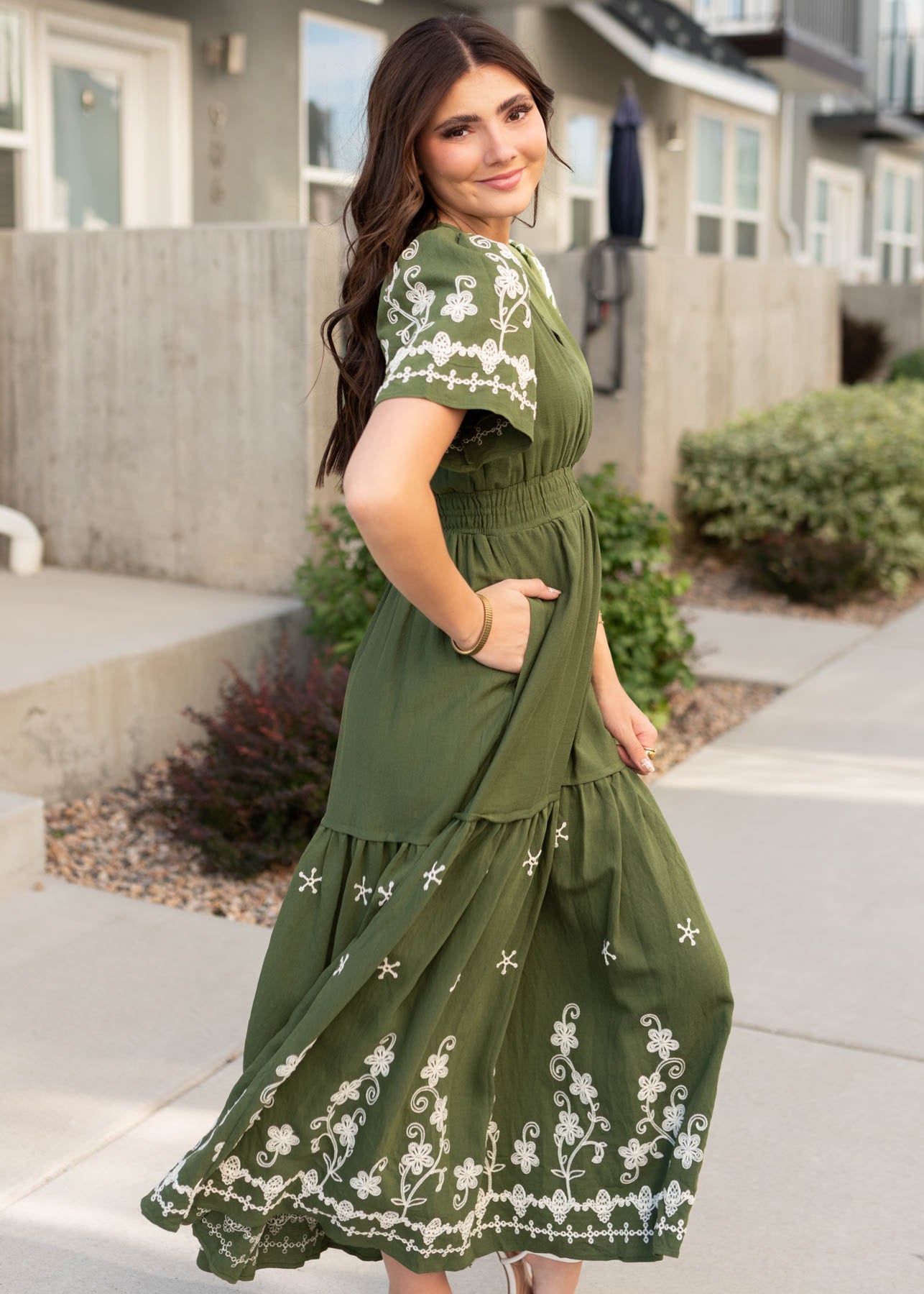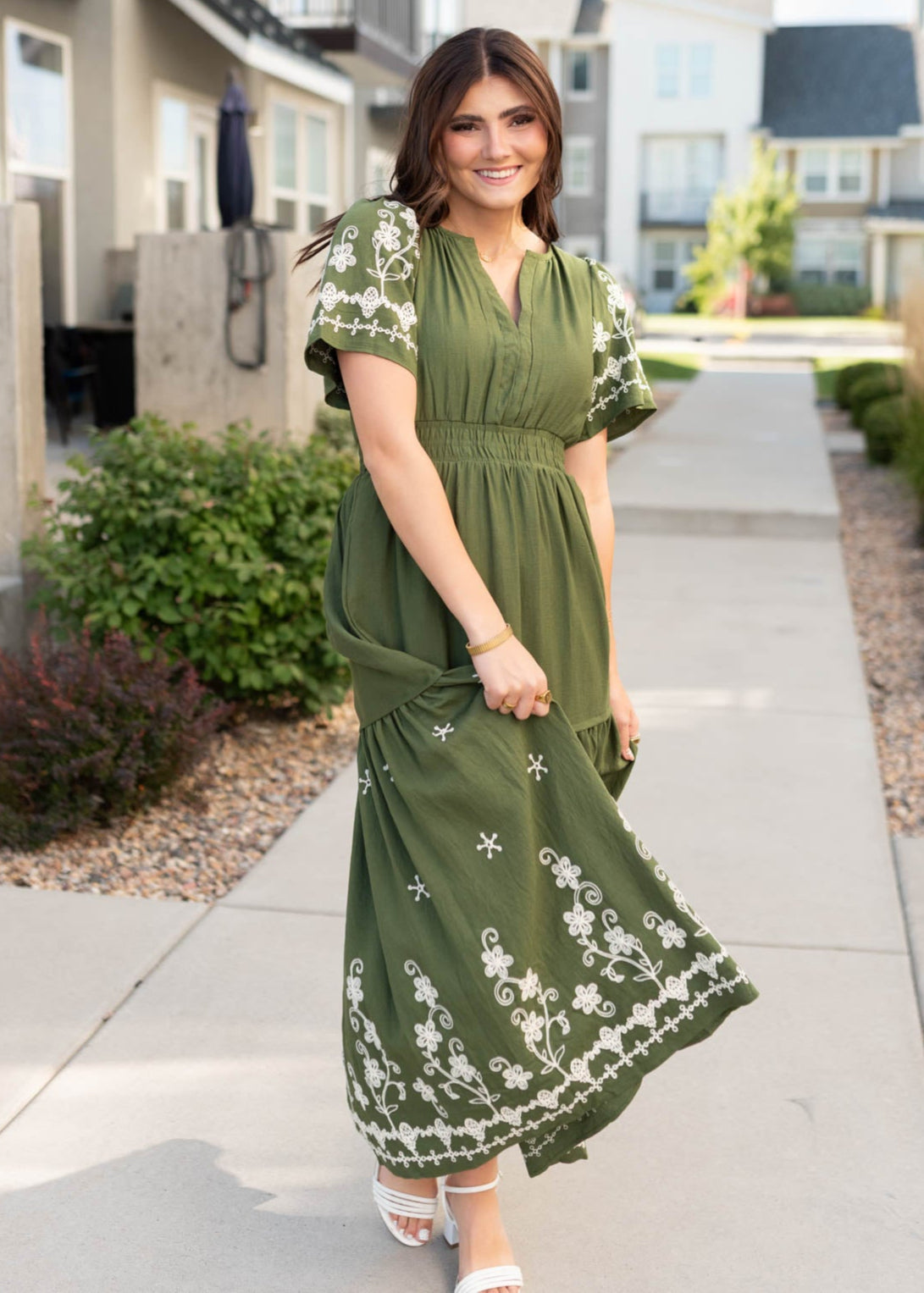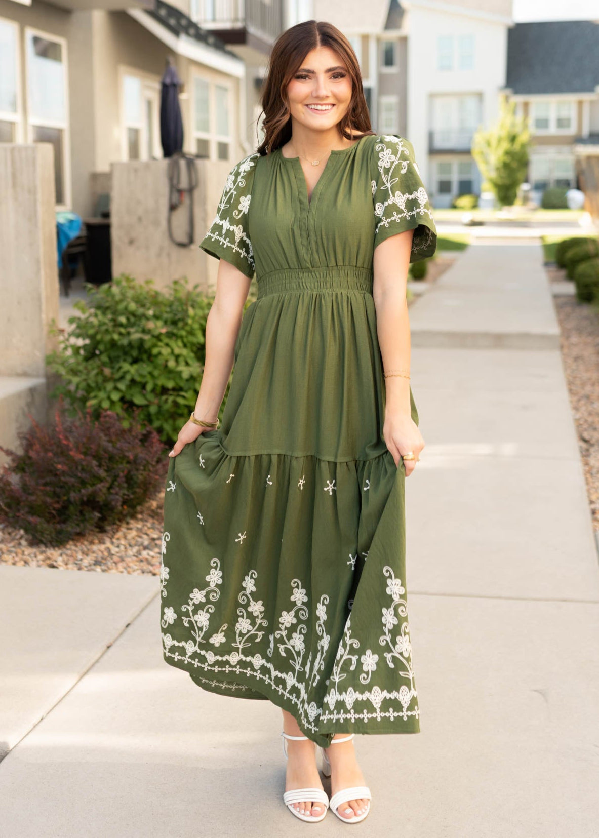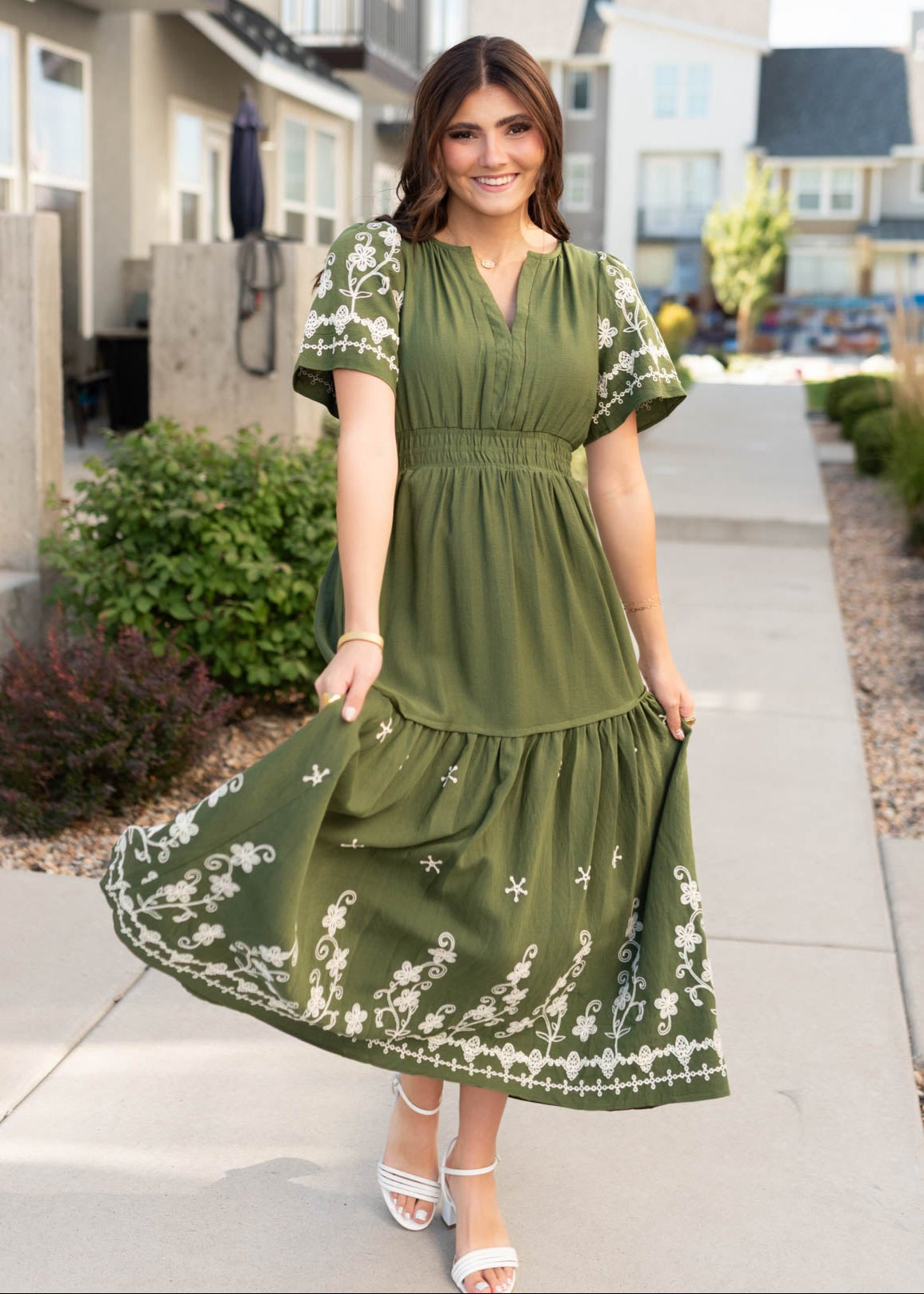 The Sofia Olive Embroidered Dress is all about understated elegance. With its soft olive hue, intricate embroidery, and flattering tiered skirt, this beauty blends comfort and charm for a look you¡¯ll want to wear on repeat.